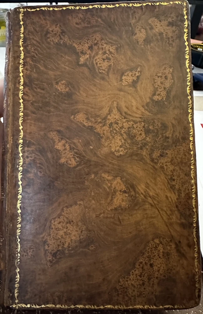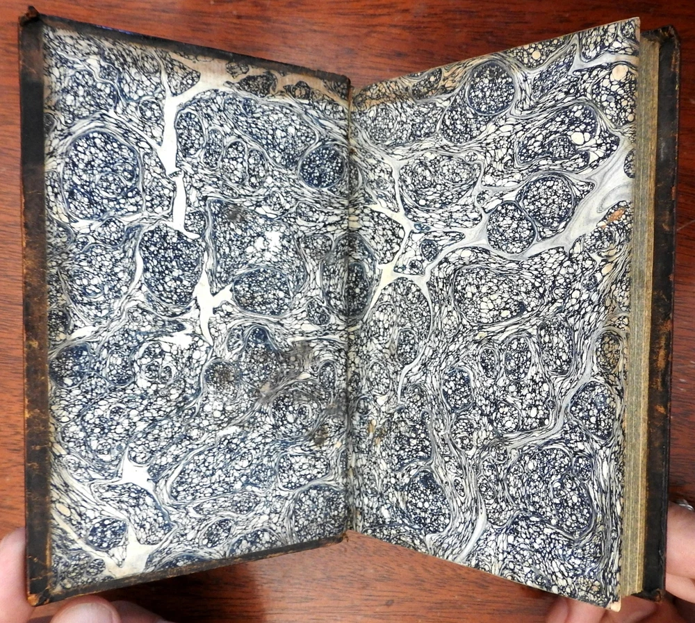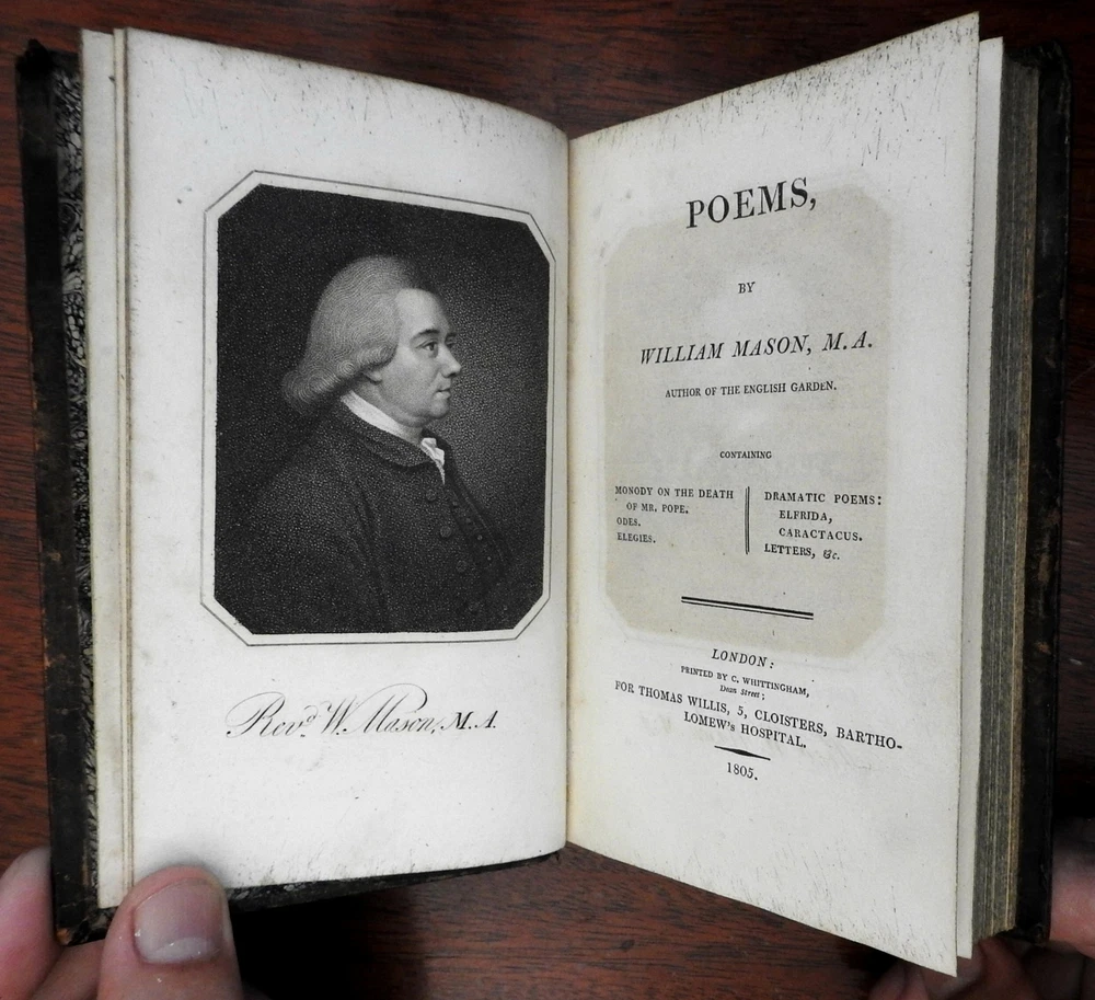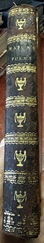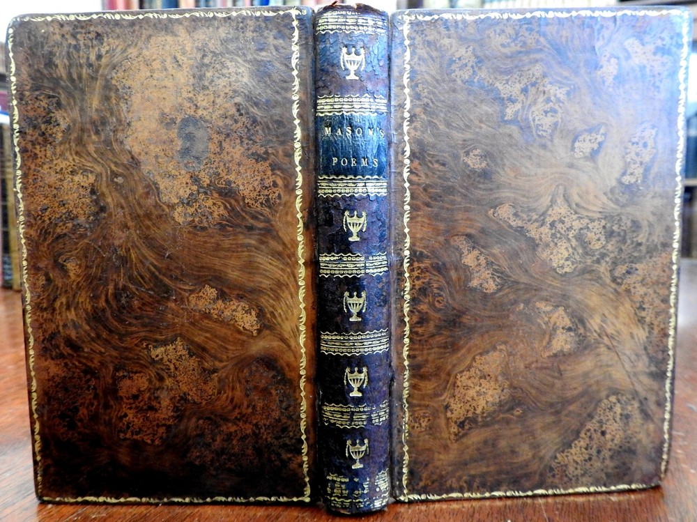 Mason's Poems collected w/ engraved portrait 1805 fine 19th century leather book Mason's Poems collected w/ engraved portrait 1805 fine 19th century leather book (Old Books, Leather Books, Poetry, William Mason). Poems by William Mason. Published 1805, London for Thomas Willis. 235 pages. Text in English. Stipple engraved frontis portrait. Beautiful period mottled full calf binding, smooth spine, gilt bands and compartment urn decorations, gilt title lettering on contrasting black leather label, gilt ruled covers, marbled edges and end papers. Spine leather surface crackled in past with small flaking, spine ends worn, joints slightly cracked but covers remain strongly attached. Text block remains clean, tight, and sound. Interior contents clean and largely free of any age spotting. Book remains well preserved and attractive on the shelf. It displays a pleasing and unique age patina and is in nice antiquarian condition, the age flaws easy to overlook or forgive. Please review photos for more detail and our best attempt to convey how this antique item survives. Book Measures c. 6 1/2" H x 4 1/4" W. [B578].