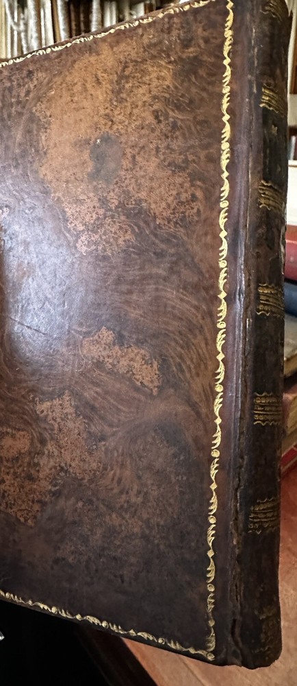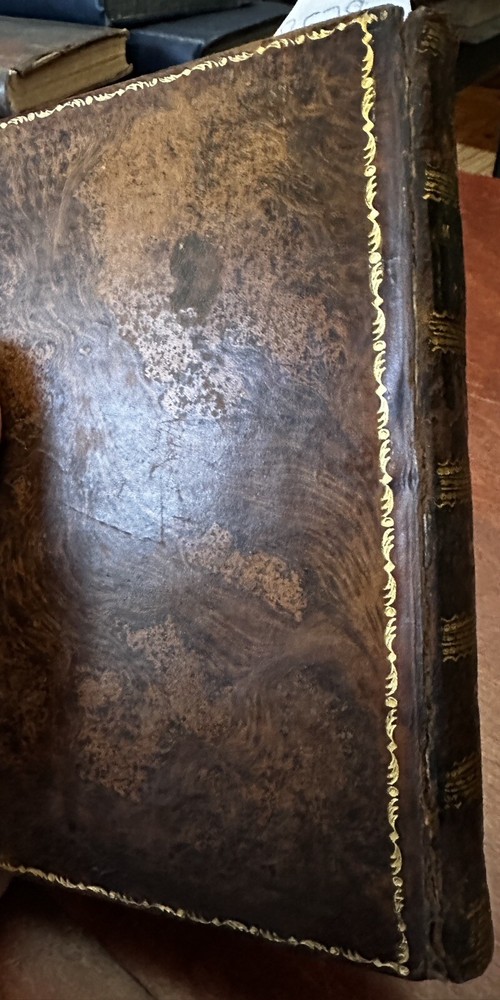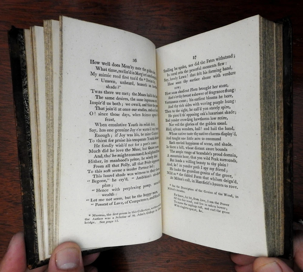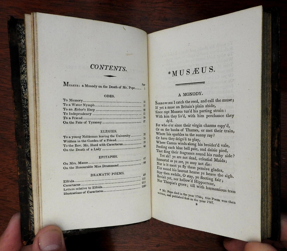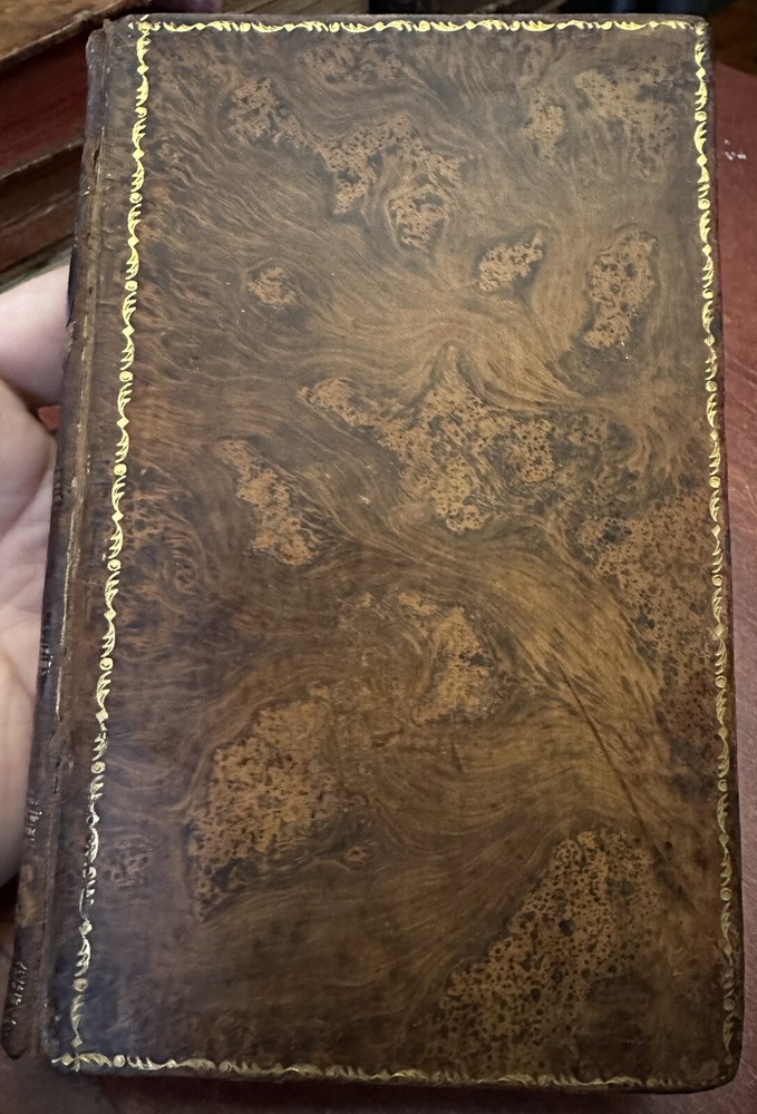 Mason's Poems collected w/ engraved portrait 1805 fine 19th century leather book Mason's Poems collected w/ engraved portrait 1805 fine 19th century leather book (Old Books, Leather Books, Poetry, William Mason). Poems by William Mason. Published 1805, London for Thomas Willis. 235 pages. Text in English. Stipple engraved frontis portrait. Beautiful period mottled full calf binding, smooth spine, gilt bands and compartment urn decorations, gilt title lettering on contrasting black leather label, gilt ruled covers, marbled edges and end papers. Spine leather surface crackled in past with small flaking, spine ends worn, joints slightly cracked but covers remain strongly attached. Text block remains clean, tight, and sound. Interior contents clean and largely free of any age spotting. Book remains well preserved and attractive on the shelf. It displays a pleasing and unique age patina and is in nice antiquarian condition, the age flaws easy to overlook or forgive. Please review photos for more detail and our best attempt to convey how this antique item survives. Book Measures c. 6 1/2" H x 4 1/4" W. [B578].