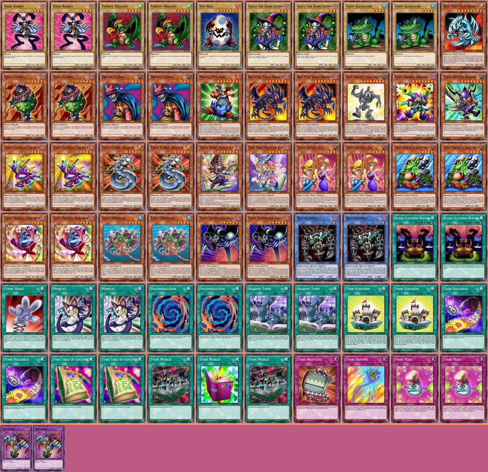 Deck Name: Maximillion Pegasus Toon Deck Parrot Dragon Alligator Yugioh # Main Deck (60) 2 - Dark Rabbit 2 - Parrot Dragon 1 - Ryu-Ran 2 - Saggi the Dark Clown 2 - Toon Alligator 1 - Blue-Eyes Toon Dragon 2 - Crass Clown 2 - Dream Clown 1 - Manga Ryu-Ran 2 - Red-Eyes Toon Dragon 1 - Toon Ancient Gear Golem 1 - Toon Barrel Dragon 1 - Toon Buster Blader 2 - Toon Cannon Soldier 2 - Toon Cyber Dragon 1 - Toon Dark Magician 1 - Toon Dark Magician Girl 2 - Toon Gemini Elf 2 - Toon Goblin Attack Force 2 - Toon Masked Sorcerer 2 - Toon Mermaid 2 - Toon Summoned Skull 2 - Relinquished 2 - Black Illusion Ritual 1 - Comic Hand 2 - Mimicat 2 - Polymerization 2 - Shadow Toon 2 - Toon Kingdom 2 - Toon Rollback 2 - Toon Table of Contents 3 - Toon World 1 - Toon Briefcase 1 - Toon Defense 2 - Toon Mask # Extra Deck (2) 2 - Bickuribox You will receive all of the following cards listed above. Most cards will will be in near mint condition. In the case of certain older cards we will do our best but some cards may be light or even moderatly played in extreme condtions. Those conditions being the card has not been reprinted in a number of years and con no longer be easily purchased in light or near mint condition. Set, Rarity, and Edition will vary and cannot be special requested. These lists are constructed with least expensive rarities we have available in stock. All cards are play legal copies. Note: If purchasing a Yugioh Deck all Speed duel cards are 100% legal at all levels of play. Store Policies Here at PMG_LLC , we pride ourselves on having the best customer service around. If you have any questions or can't seem to find something that you want please do not hesitate to contact us. We will do our best to respond to all questions within one business day. Hours of Operation: Monday-Friday: 2:30pm - 10:00pm Saturday- 10:00am - 8:00pm Sunday 11:00am - 5:30pm Note: We are closed all national holidays. Info: Thank you for choosing PMG_LLC . We appreciate your business. We ship Monday through Friday to make sure you get your deck as quickly as possible. All orders priority orders can use combined shipping. In order to use the combined shipping your whole purchase needs to be checked out as one order. We ship once we have received your payment and payment has cleared. As always if you have any questions or concerns please feel free to contact us via email. Shipping Information: We ship Monday through Friday, barring national holidays during which the United States Postal Service is closed. If you purchase a card on Friday or Saturday please bear in mind it will not ship until Monday. US Shipping: First Class Mail : Free. Comes with tracking information. Priority Mail with Delivery Confirmation : $9.99 All orders are shipped in appropriate protective material inside bubble mailers. International Shipping: We do not offer international Shipping Return Policy: You must return items sold and fulfilled by PMG_LLC within 30 days of delivery to be eligible for a refund. Returns which are damaged in the mail due to improper return packaging will receive partial refunds. We will process a full refund for all items returned in their original condition. In order for us to process your full refund you must include the full name associated with the order as well as the eBay order number inside the return packaging. We will not process returns which do not include the buyer's name and order number. Requirements: Please return items with the original plastic packaging. Failure to do so may result in a partial refund. Also you must inform us of any returns you may wish to process before sending them back. Any items simply send back to us without prior contact will not be eligible for refunds. Important Notes Remember that to benefit from our domestic combined shipping on priority orders you must to pay in a single payment. If you place two separate priority orders you will be charged the $7.50 shipping fee for both orders. If you place multiple orders for Priority shipping you will be charged the corresponding shipping costs for each order, even if you place the orders on the same day. We do not refund shipping costs as we tend to package orders throughout the day and may not notice that you would otherwise have qualified for combined shipping. We want to provide you with 5 Star service and earn your Positive Feedback, so if for any reason you are not happy with your transaction, contact us before leaving feedback. Business Day - Our business day runs from Monday to Friday from 9am to 4pm, excluding US national holidays. Any orders placed or payments cleared less than 4 hours before the close of business will be considered orders from the following business day.