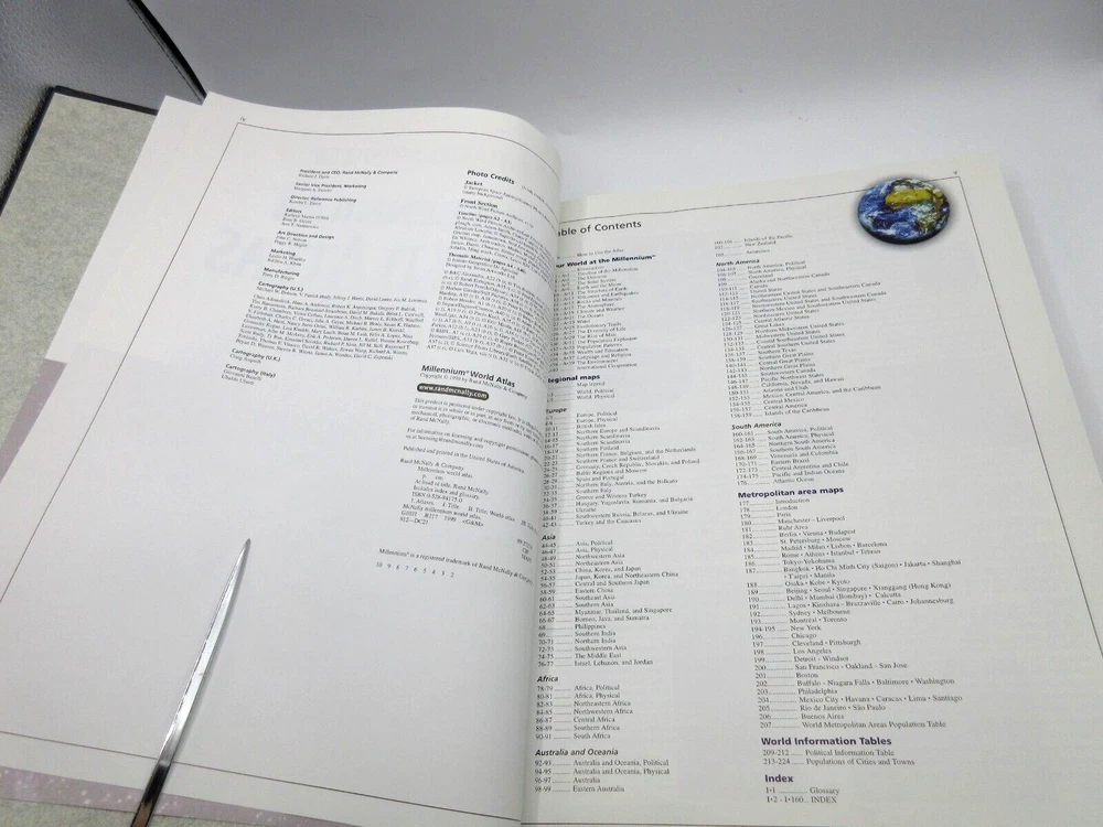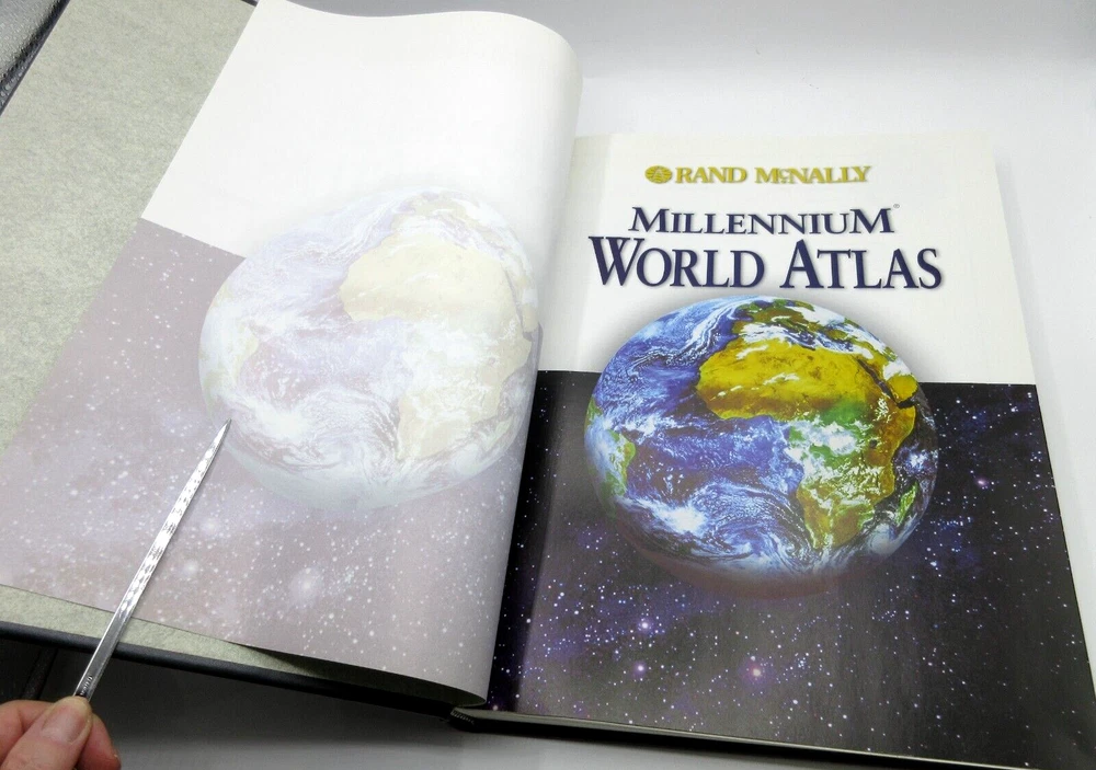 Bound by hand in Traditional leather by Graphic Image in NY Reduced from $495.00 Just in time for the dawn of a new era, Rand McNally introduces the "Millennium World Atlas", a comprehensive new atlas featuring essential geographic reference material destined to be treasured long after the year 2000. This high-quality, extremely accurate atlas offers authoritative yet beautiful regional and metropolitan area maps, fact-filled articles on Earth and its people, and a complete place-name index. The atlas front section opens with a brand-new Millennium-themed timeline that chronicles the milestone achievements of the past 1,000 years. Beautifully illustrated and logically organized, the timeline distills information and events into categories such as exploration and discovery, science and technology, society and population, religion, nature and the environment, art and culture, and map-making. It successfully captures the progress of the past ten centuries and offers a revealing look at the world as the new millennium approaches. Superior cartography, timely content, and an attractive jacket combine to make the "Millennium World Atlas" a valuable collectible for anyone wishing to visualize the world at this momentous time, both now and in the future. This description may be from another edition of this product. Format: Hardcover Language: English ISBN: 0528841750 ISBN13: 9780528841750 Release Date: August 1999 Publisher: Rand McNally Length: 432 Pages Weight: 6.65 lbs. Dimensions: 1.4" x 11.4" x 15.1"