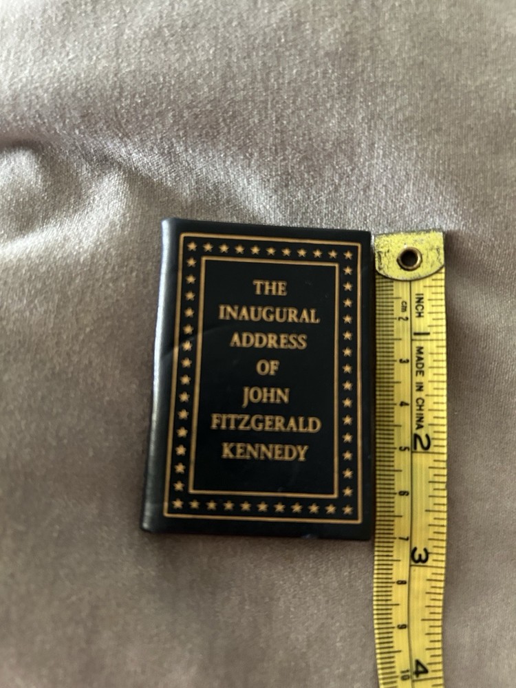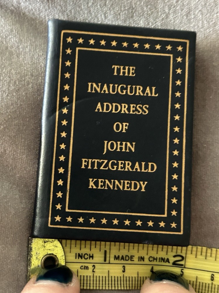 This mini blue leather bound book is: The inaugural speech of the late President John F Kennedy 1961 There is a photo in the book of JFK- Rare Vintage Unusual In great condition Incredible collectible Please view all photos Thank you for stopping by!