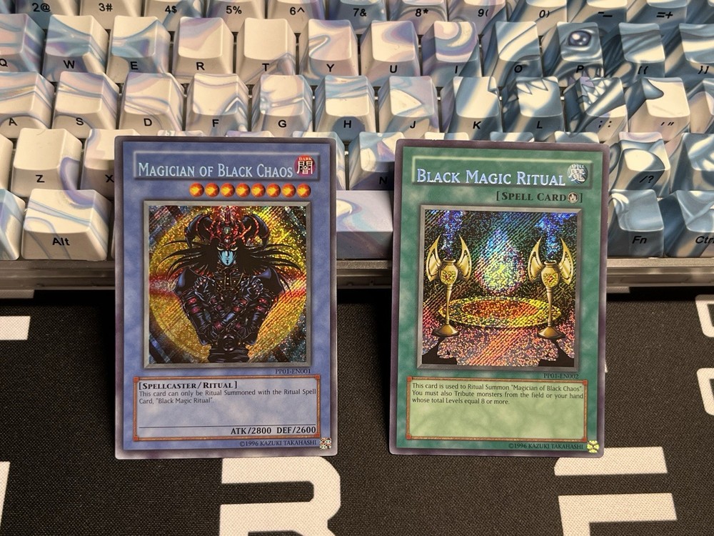 Magician of Black Chaos + Black Magic Ritual lowered name misprint pair. Both cards are in Near Mint Condition and ready for same day shipping.