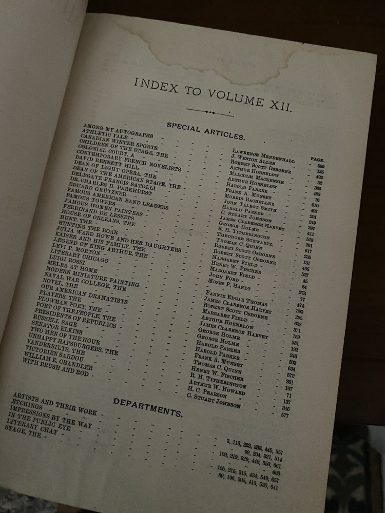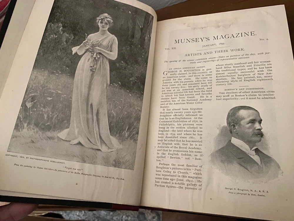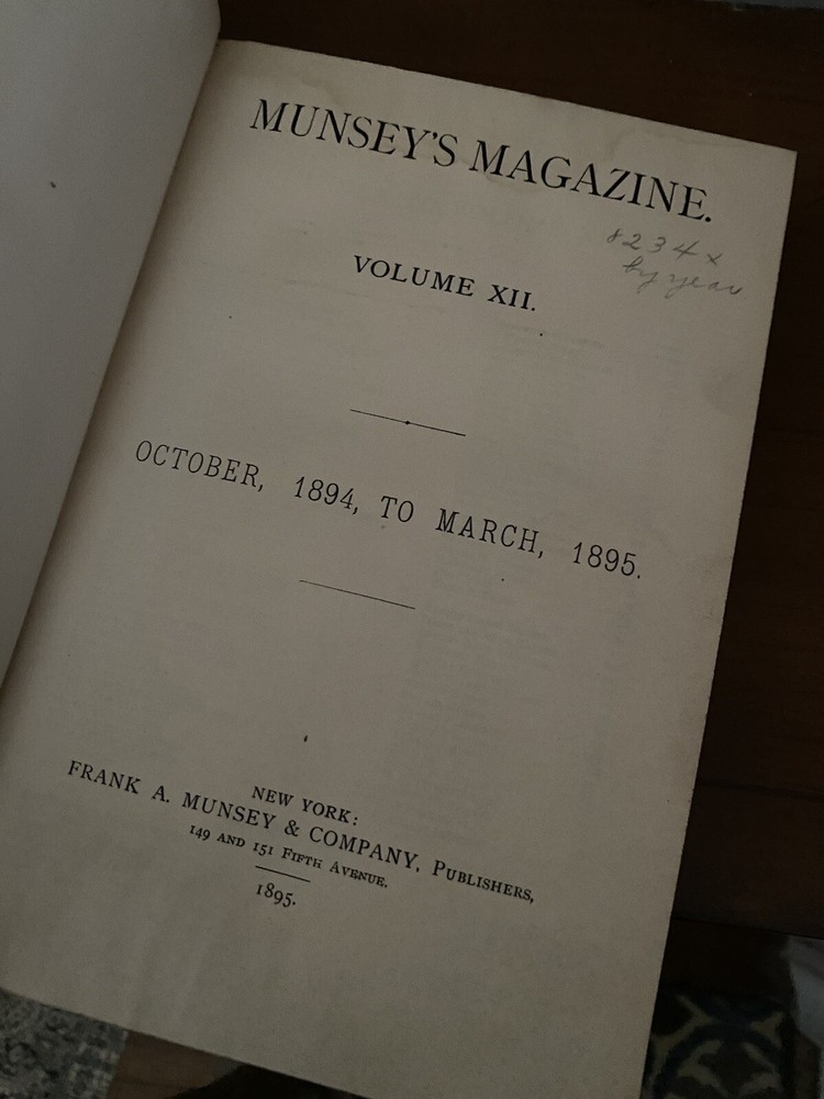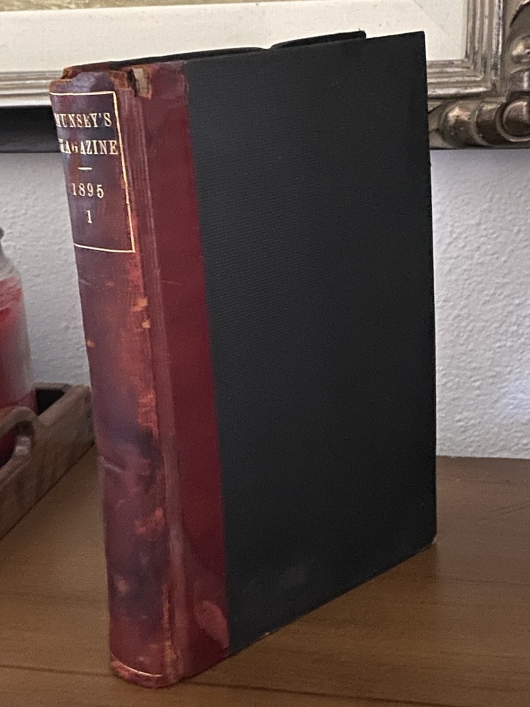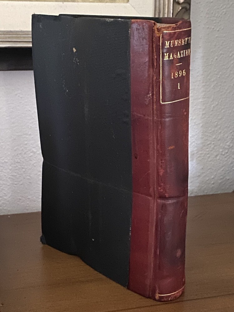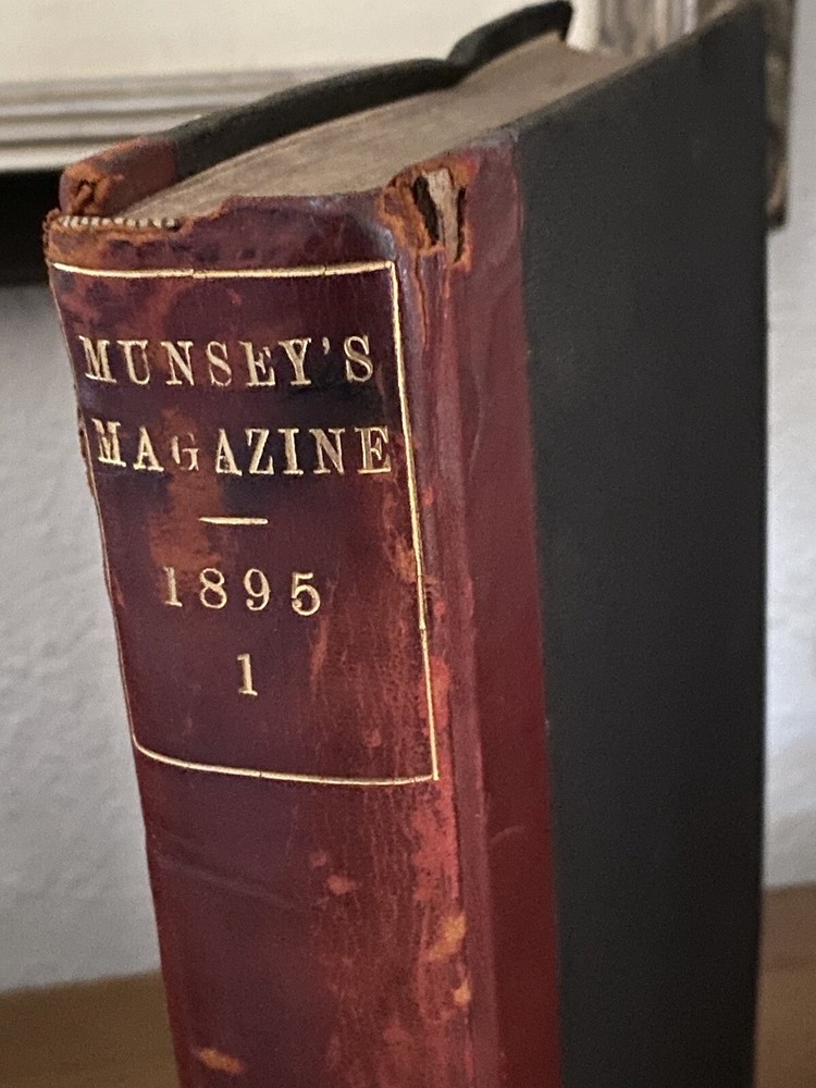 American Antiquarian Magazine Collection. Rare 19th Century Media. A beautiful dark redfish partial leather book with a fascinating collection of a glimpse into the past, Munsey's Weekly, later known as Munsey's Magazine, was an American magazine founded by Frank A. Munsey in 1889 and edited by John Kendrick Bangs. Munsey aimed to publish "a magazine of the people and for the people, with pictures and art and good cheer and human interest throughout". Size 9 1/2" L x 7" W CONDITION Good vintage condition. Minor wear and page yellowing commensurate with age, a hit mark on the outer leather bind .
