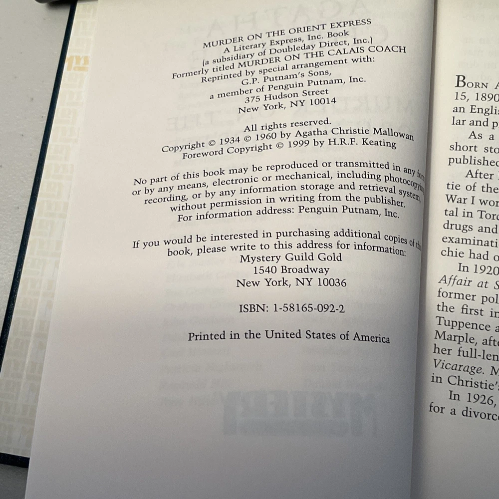 Take a trip back in time with this captivating novel from the Agatha Christie Mystery Collection. This hardcover edition from MYSTERY GUILD in 1999 features a luxurious faux leather bound cover that exudes a classic and timeless feel. The book, which belongs to the mystery genre, is perfect for young adults and adults alike who are into detective stories, thrillers, mystery, and suspense. It was reprinted by special arrangement by G.P. Putnam's Sons, making it a must-have for fans of Christie's work. It features a leatherette cover and is a United States publication. As seen in the pictures, itβs in very good condition.