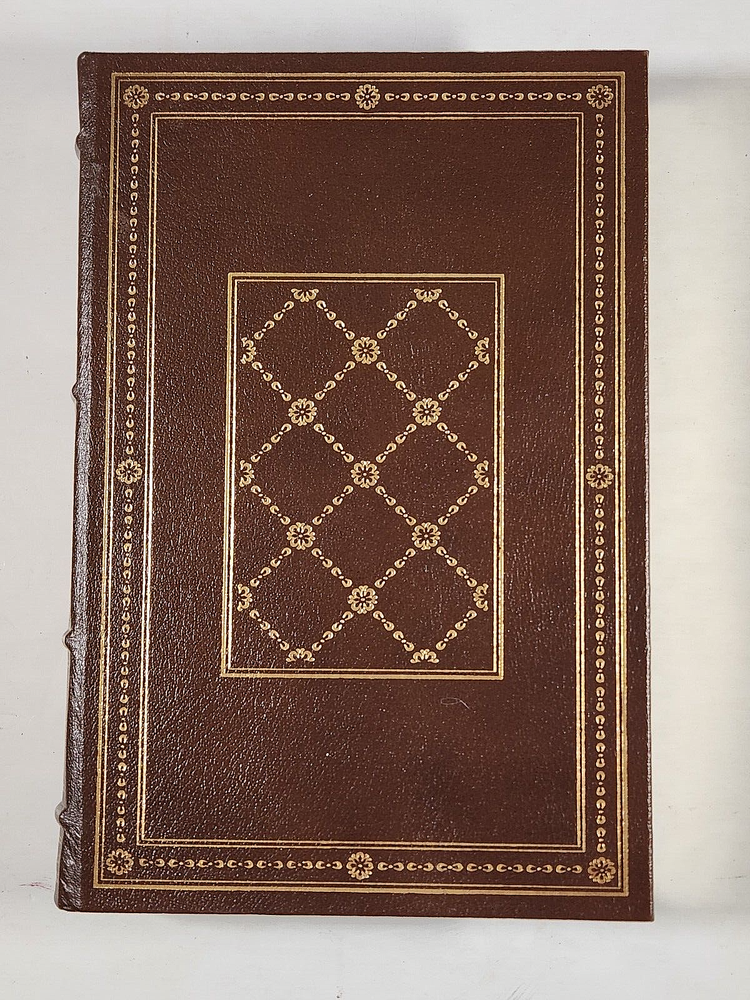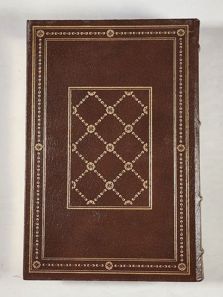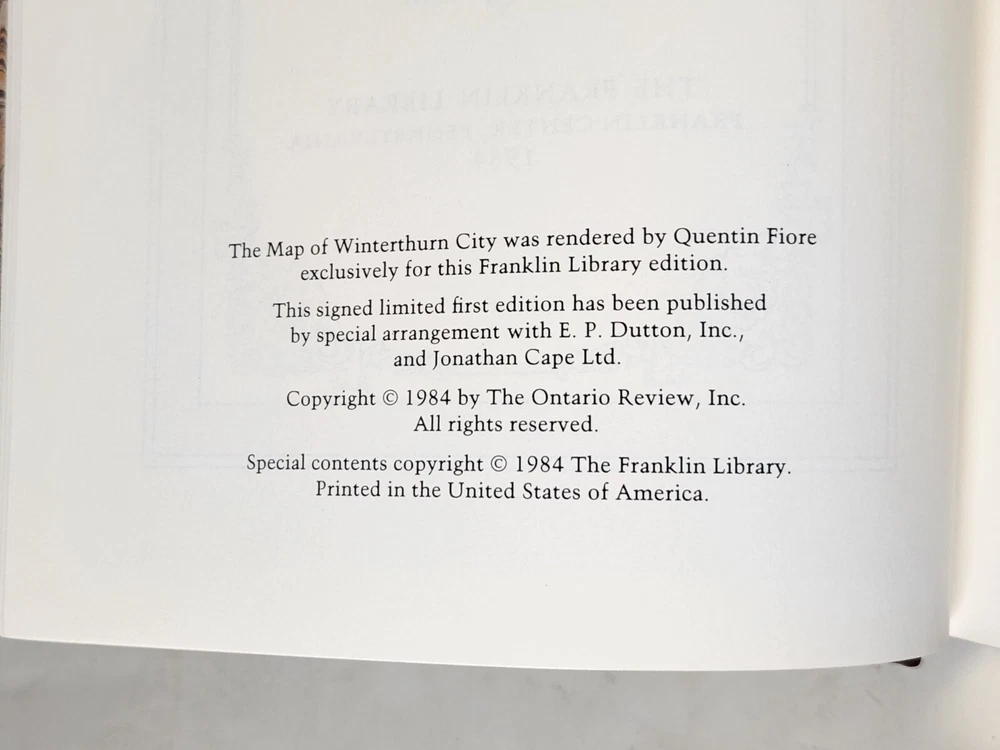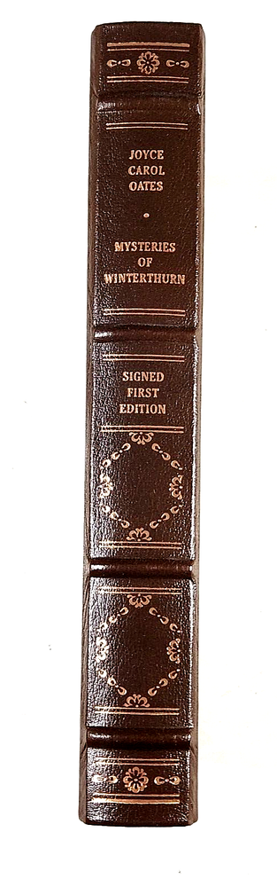 From the Franklin Library Collection. CONDITION NEW "Filled with surprising, exotic, and dangerous treats, is the perfect thing for a winter's night by the fire." -Washington Post Mysteries of Winterthurn: by, Joyce Carol Oates. Franklin Library E. P. Dutton, Publisher SIGNED 1st Edition Daniel Maffia, Illustrator 1984 485 pages Gilt page edges Silk Endpapers Raised Bands Satin Bookmark Ribbon Accented in 22kt gold The Signed First Edition Society Full Leather-bound In Mysteries of Winterthurn, the brilliant young detective-hero Xavier Kilgarvan is confronted with three baffling cases; "The Virgin in the Rose-Bower," "The Devil's Half-Acre," "The Blood-Stained Gown" That tax his genius for detection to the utmost, just as his forbidden passion for his cousin Perdita becomes an obsession that shapes his life. Terminology that may be used in this description: Bookplate: Highly sought after by some collectors, a book plate is an inscribed or decorative device that identifies the owner, or former owner, of a book. Most often bookplates are affixed to the endpaper of a book. Bump: Indicates that the affected part of the book has been impacted in such a way so as to cause a flattening, indention, or light bending. Deckle Edge: Deckle edge is the feathered edge of a page. Traditionally and historically, this was a side effect of the process of making paper. Dust Jacket: Sometimes used as another term for dust jacket, a protective and often decorative wrapper, usually made of paper which wraps around the binding of a book Ex-library: A former library book, generally containing library acquisition and ownership stamped Markings, and other typical indications of the library's use. Foxing: Or, Foxed is the age related browning, or brown-yellowish spots, that can occur to book paper over time. When this aging process happens to the paper in a book it is referred to as "foxed". Remainder Mark: A remainder marked book is just that - a mark to the page edges of a book. This mark is placed on the page edges by a publisher as books are returned from bookstores or sold to discounters. Rubbing: Abrasion or wear to the surface. Usually used in reference to a book's boards or dust-jacket. Shelf Wear: (shelving wear) describes damage caused over time to a book by placing and removing a book from a shelf. Soiled: Generally, refers to minor discoloration or staining.