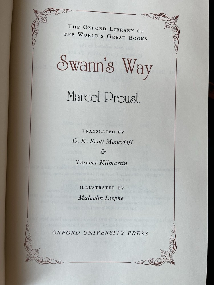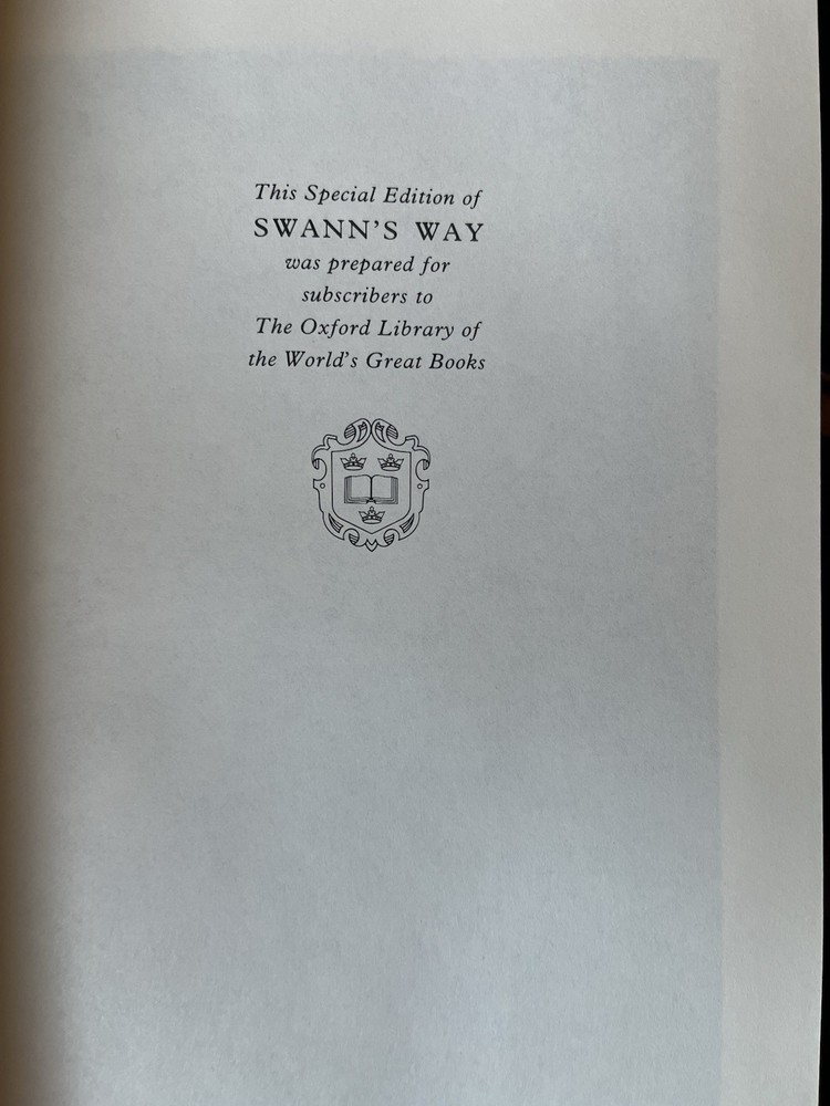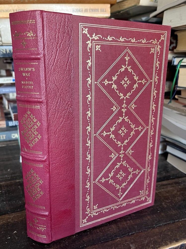 Swann's Way by Marcel Proust. Oxford Library Of World’s Great Books/Franklin, 1983. Beautifully printed 1/4 bound leather with marbled endpapers, ribbed spine, gold leaf page edges, and sewn-in ribbon marker in pristine, unused condition with no interior markings or other visible flaws. Bound in one quarter premium full leather. Accented in 22kt gold. Printed on archival paper with gilded edges. Decorated endsheets and with a silk ribbon page marker. Smyth sewing and concealed muslin joints.; First Franklin Library Edition. $4.75 domestic U.S. shipping