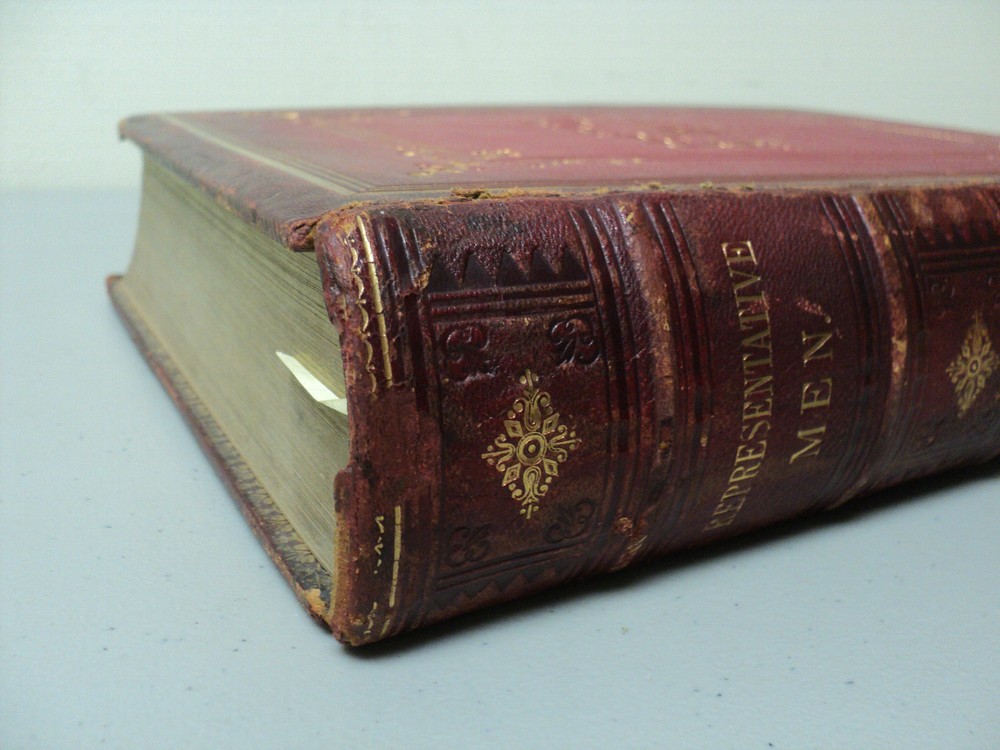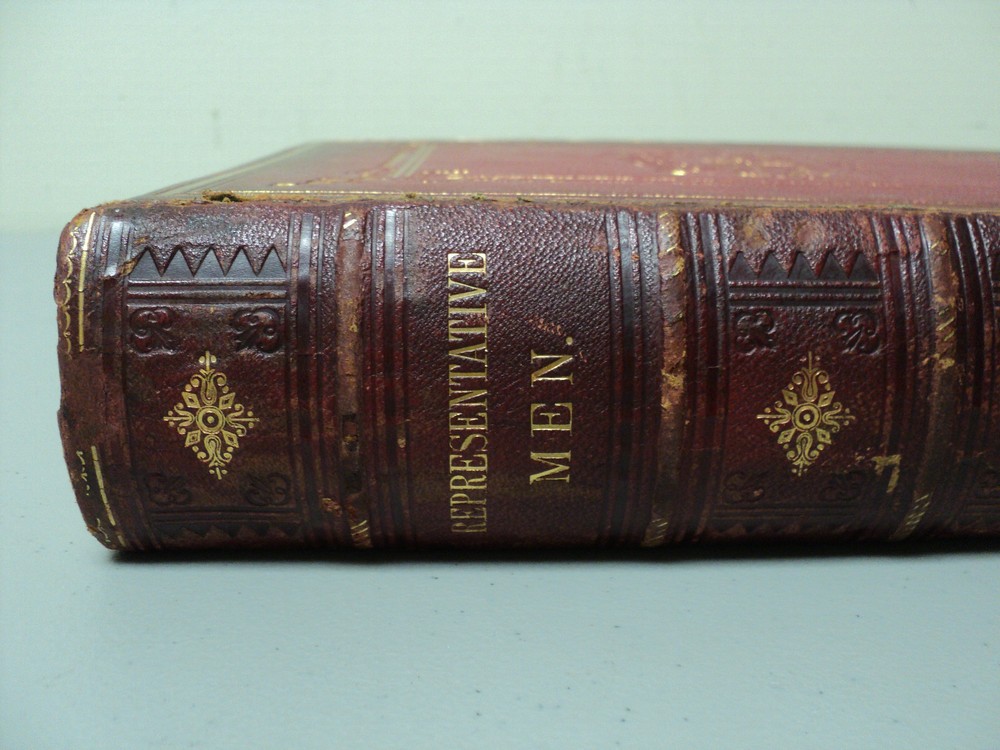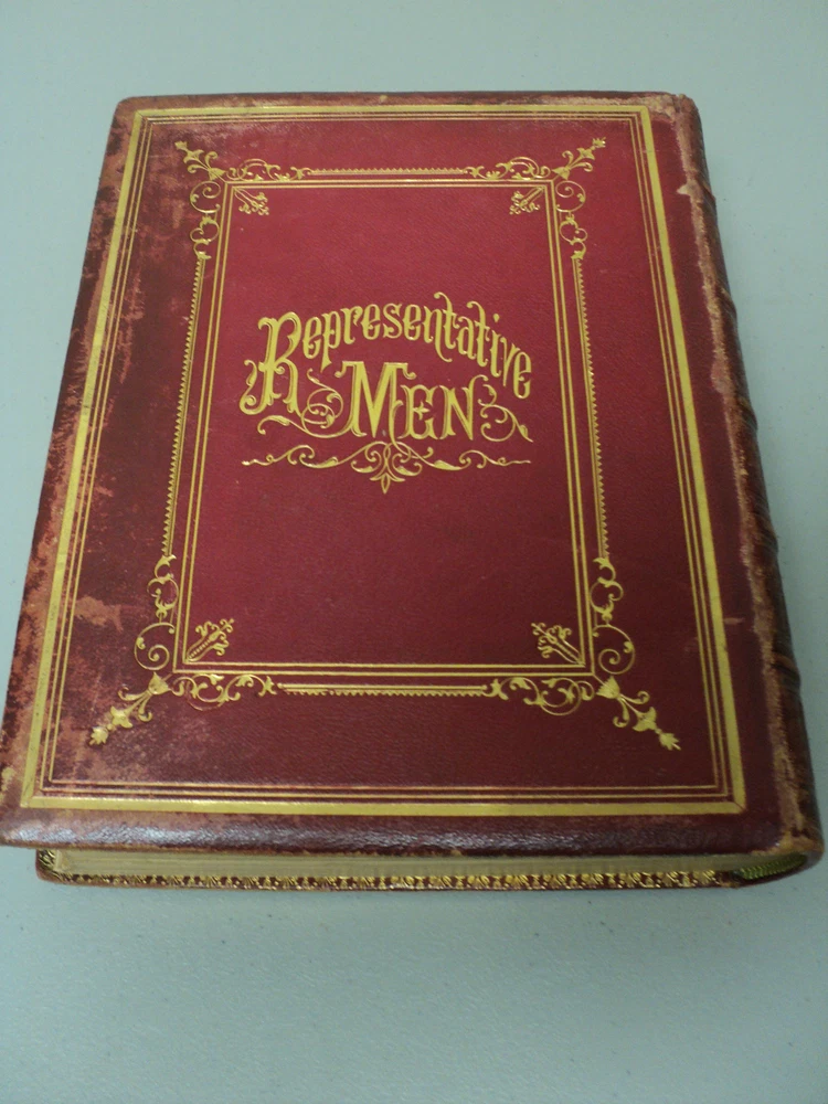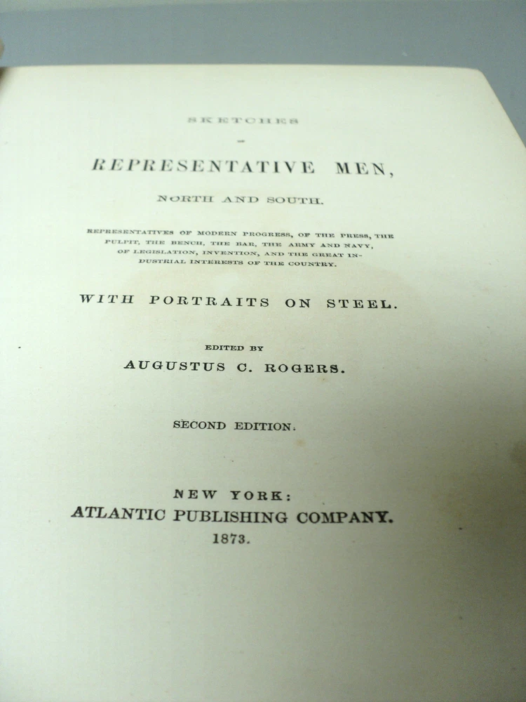 Welcome to Antiques & Moore! This listing is for a wonderful red leather bound book "Representative Men, North and South", dated 1873. Book includes nice steel engravings and is edited by Augustus C. Rogers, second edition. The book is in good condition with normal cover wear on corners, top and bottom of leather spine chipped and worn, inside very good clean condition with no writing or markings (see photos). Measures 2 1/4" high, 11 1/2" long and 9 1/4" wide. Weighs 6.8 pounds. We are not book collectors or dealers or should we fail to address any specific condition problem appropriately or if you have any other questions regarding this lovely book, please email and I will respond. I am selling the book "as found" and have not tried to clean the cover or alter it in any way. We at Antiques & Moore have been in the Antiques business for over 30 years and try to describe our items as accurately as possible. Although all sales are considered final, if there is an error in our description or a problem with our item, we will issue a full refund of the purchase price if contacted within 3 days after receipt of item, however, please note that we can not refund shipping charges. We are happy to answer any questions and always appreciate your business!