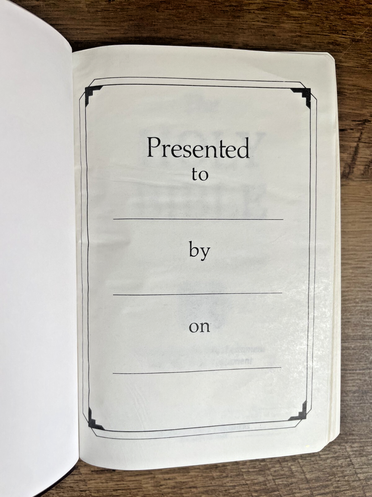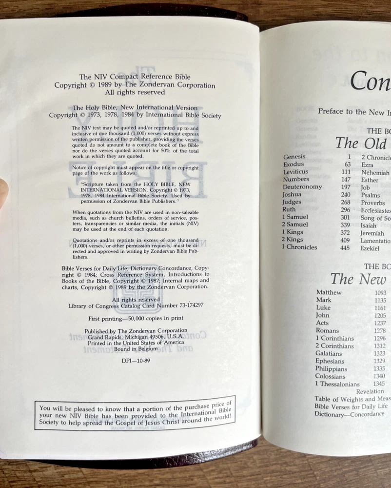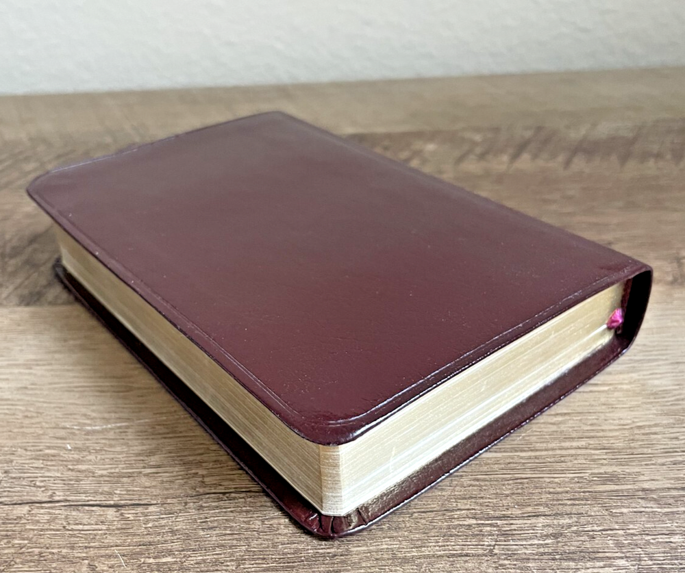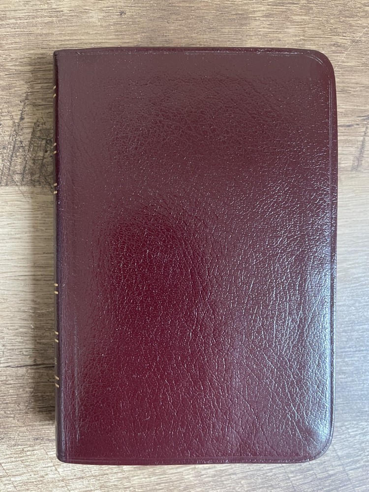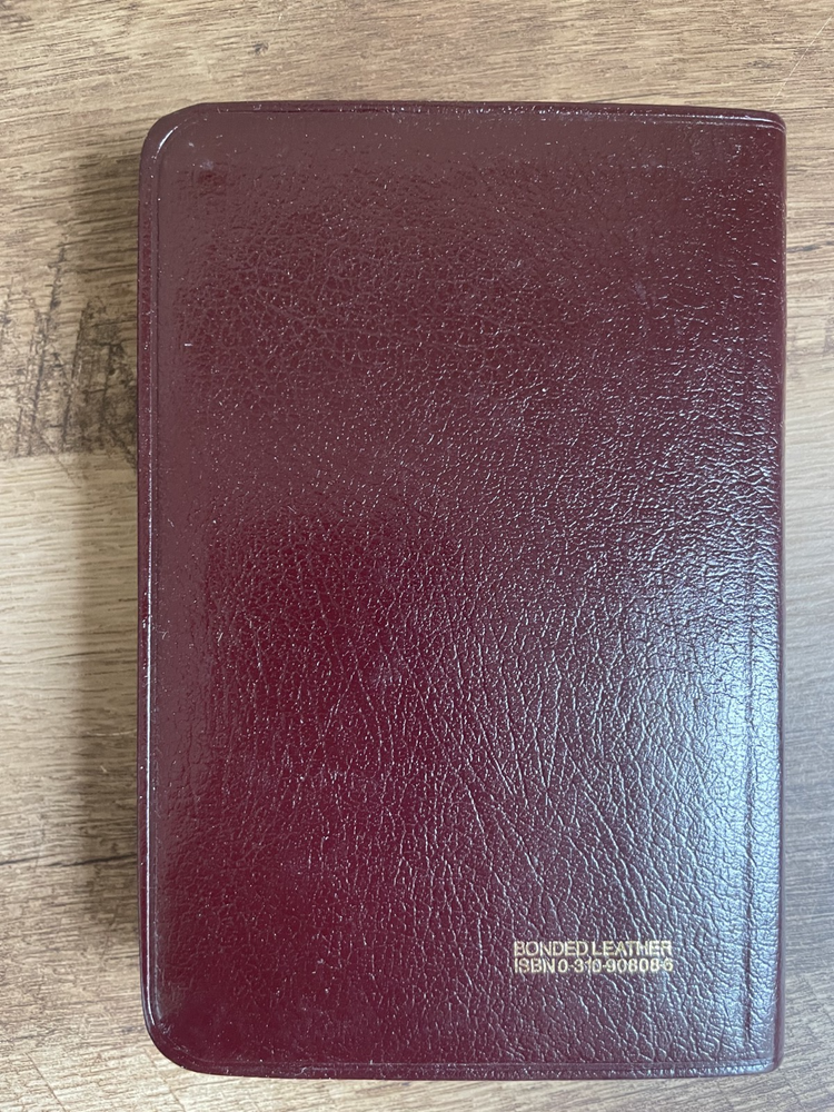 NIV Compact Reference Bible Zondervan, 1989, Burgundy Bonded Leather, Bound in Belgium This 1989 NIV Compact Reference Bible offers the complete New International Version in a beautifully bound, portable format. Featuring a bonded leather cover in rich burgundy, it includes cross-references and a presentation page, making it ideal for study, travel, or gifting. A great addition for Bible readers seeking a classic, compact edition with a timeless design. Bound in Belgium. Pages are clean, unmarked, and the Bible appears like new. Please see photos for visual inspection.