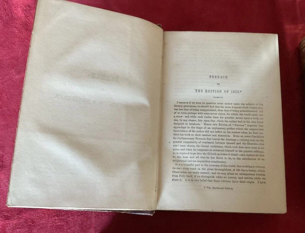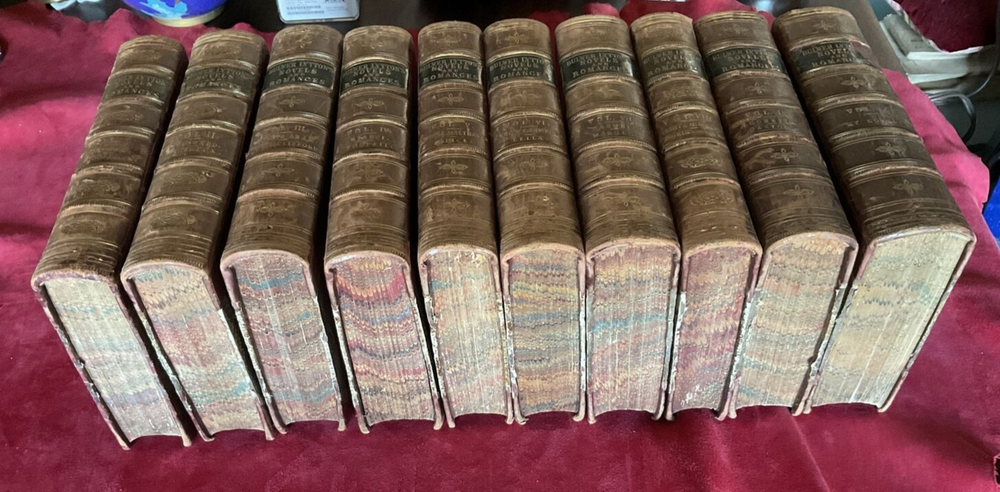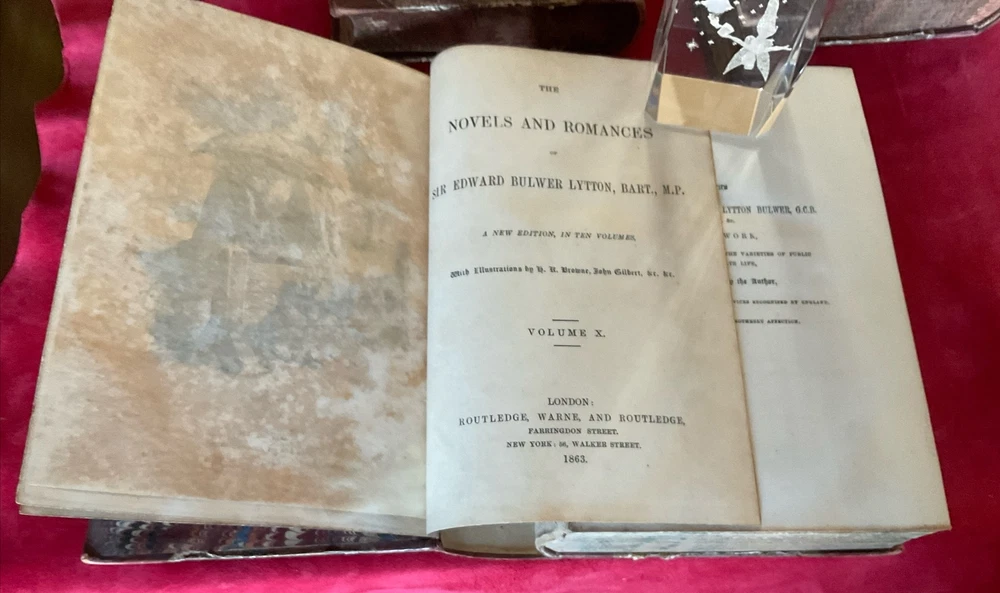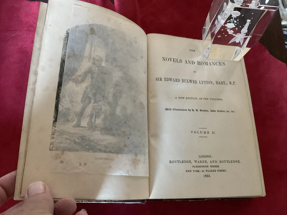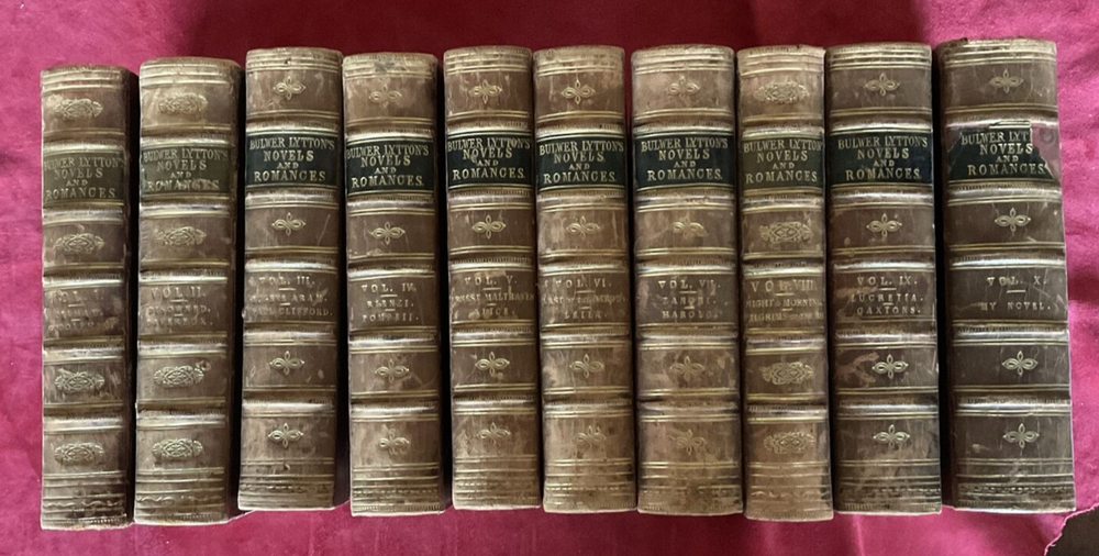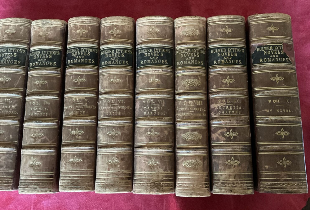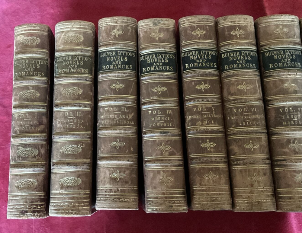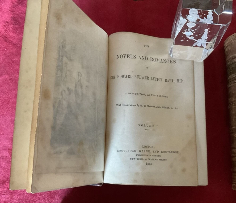 RARE COLLECTION: Bulwer Lytton's Novels and Romances Vol. 1-10 1863 Tan Partial Leather w/Marble THE NOVELS AND ROMANCES OF SIR EDWARD BULWER LYTTON, BART., M.P. A NEW EDITION IN TEN VOLUMES, WITH ILLUSTRATIOS BY –K. Browne, John Gilbert, &c. &c . LONDON ROUTLEDGE, WARNE, AND ROUTLEDGE, 1863 Printer Sevill and Edwards, London Bulwer Lytton's Novels and Romances Vol. 1-10 1863 1/4 Tan Partial Leather w/Red and Brown & Marble Boards This set is bound beautifully in 1/4 tan leather with red and brown leather labels, binding raised bands and floral tooling within gilt-bordered compartments, top edges gilt, marbled endpapers spines, marbled boards and endpapers. 10 Volume Set Printed in London in 1863 - over 71/2" x 5", attractively bound. Vol. I - Pelham, or, Adventures of a Gentleman; Godolphin - This volume has several prefaces: Preface to the edition of 1828* (*Viz. the Second Edition); Advertisement to The Present Edition, 1848. Prior to the beginning of Godolphin there is a letter, a preface and table of contents. Inside cover binding has small separation of marble, binding is tight, heavy foxing on title and illustration pages and thins out on surrounding pages. Majority of pages are clean. Book shelf normal wear and edges have normal wear. Vol. II – The Disowned; Devereux – Beginning has Advertisement to the Present Edition E.B.L. Knebworth, May 3, 1852. Binding has small separation on inside cover top section; heavy foxing on the inside cover pages, not as heavy on title and illustration for The Disowned, a little more on the Devereux pages. The majority of pages are clean. Dedication pages at the beginning of Devereux; The Autobiographer’s Introduction, Morton Devereux; and Note to the Present Edition, 1852 followed by Table of Content. Book has shelf wear on cover and edges. Vol. III – Eugene Aram Book 1; Paul Clifford; Tomlinsoniana or The Posthumous Writings of the Celebrated Augustus Tomlinson Addressed to his Pupils (no illustration). Beginning of book dedication: To Sir Walter Scott, Bart. London December 22, 1831. Preface To the Edition of 1831 – December 22, 1831.; Preface To the Edition 1840, Brussels August 1840; Preface to Present Edition Essay by Eugene Aram. Inside cover binding has small separation of marble, binding is tight, heavy foxing on title and illustration pages and thins out on surrounding pages. Majority of pages are clean. Book shelf normal wear and edges have normal wear. Vol. IV – RIENZI, The Last of The Tribunes, Book 1; The Last Days of Pompeii Book The First - This volume has several prefaces: Dedication of Rienzi to Alessandro Manzoni, London Dec. 1, 1835; another Dedication and 2 Prefaces to the First Edition of Rienzi 1835 and the Present 1848. Inside front after title, you can see separation, but binding remains tight throughout book, the foxing is heavy on the blank cover pages, and light on the title and illustration. There is some intermittent small spots and a couple pages were creased at the top corners. Page 208 has George Routledge and Company printed on the binding section. There is a large Appendix section at the end of Rienzi. Pompeii has a letter to Sir William Gell and a Preface to the First Edition 1834 and Present 1850. There are NOTES at the end of this section. This cover has a discolored section that must have been exposed to the sun, you should see on photos. Heavy foxing on plain pages, lightens on title and illustration pages and thins out on surrounding pages. Majority of pages are clean. Book shelf normal wear and edges have normal wear. Vol. V – Ernest Maltravers; Alice, or The Mysteries Book 1; Prefixed to the First Edition of 1837; Second section just as Note Knebworth Dec. 14, 1851. Inside front cover the marble is splitting at the binding and binding remains tight throughout book. The foxing is heavy on the blank cover pages, and light on the title and illustration. There are intermittent small spots. The cover has a some of the leather thinned on the bottom cover right corner and top binding top corner. Majority of pages are clean. Book shelf normal wear and edges have normal wear, yet there is more separation of the marble on the bottom edges. Vol. VI – The Last of the Barons; Leila, or The Siege of Granada; Calderon, The Courtier; (3 Stories). Barons has Dedicatory Epistle E.B.L. London, January 1843, Preface The Last of the Barons, with NOTE at the end. Leila has dedication to The Countess of Blessington, Preface to the First Edition, and Table of Content. The binding remains tight throughout book. The foxing is heavy on the blank cover pages, and light on the title and illustration. Majority of pages are clean. Marbling on the back top cover shows possible sun damage. Book shows normal shelf normal wear. Vol. VII – ZANOLI Book The First ; HAROLD, The Last of The Saxon Kings Book 1; Prefixed to the First Edition of 1837; Second section just as Note Knebworth Dec. 14, 1851. Zanoli has Dedicatory Epistle To Zanoni E.B.L. London May 1845, Preface to Present Edition 1853 than Introduction London, January 1942 and ends with NOTE. Harold has a Dedicatory Epistle E.B.L. followed by Preface to the Third Edition. The binding remains tight throughout book. The foxing is heavy on the blank cover pages, and light on the title and illustration. There are intermittent small spots and some small creases were found on some top corners and bottom corners. Majority of pages are clean. Marbling on the front cover shows more wear and back cover has some marbling missing along the edge of the leather to binding. Book shows normal shelf normal wear. This edition shows volume printed: I Radbury and Evans, Printers, Whitefriars (London) at end of Zanoli book. Vol. III - Night and Morning; The Pilgrims of the Rhine; Front of book binding has separation on dedication page "To The RIGHT HONOURABLE C.T. D'EYNCOURT, M.P.; This work, in Part composed under his hospitality roof, is Dedicated as a slight memorial of affection fri