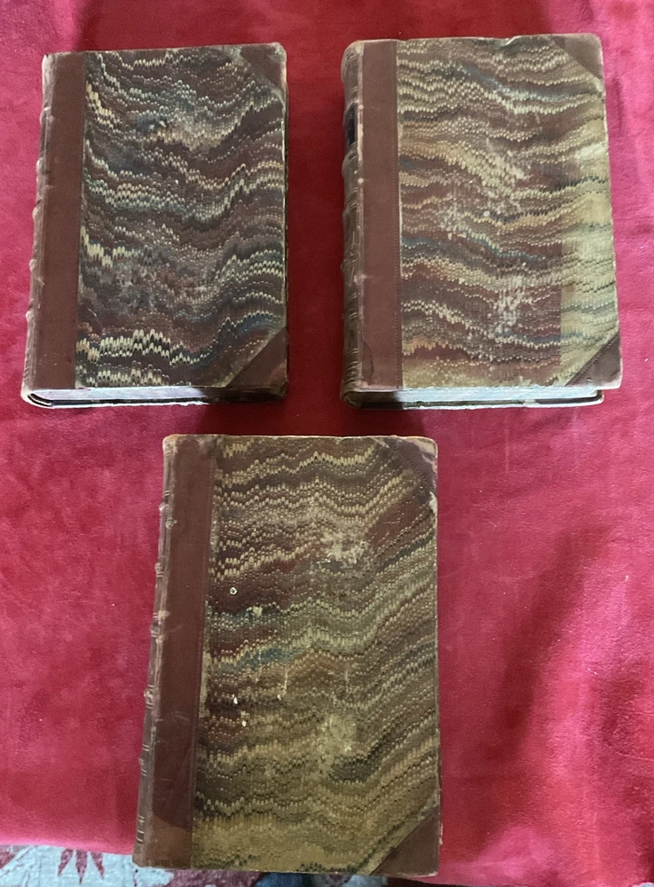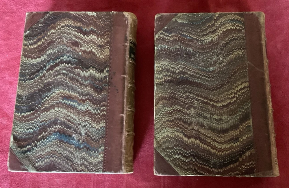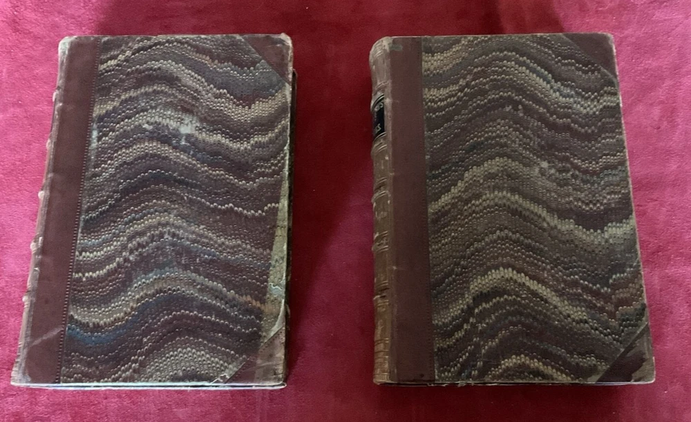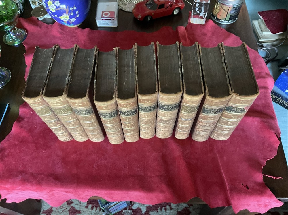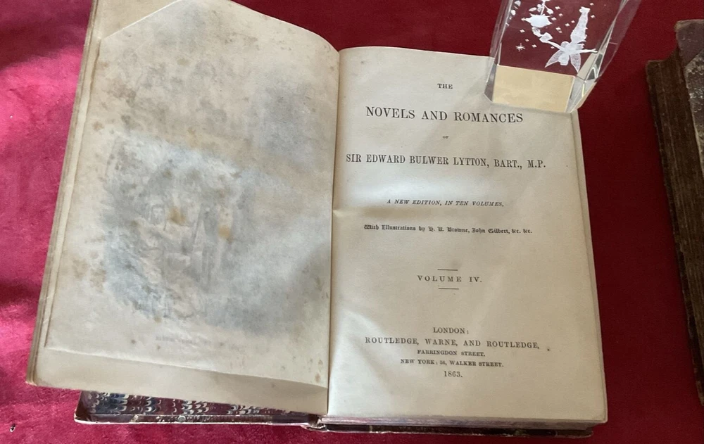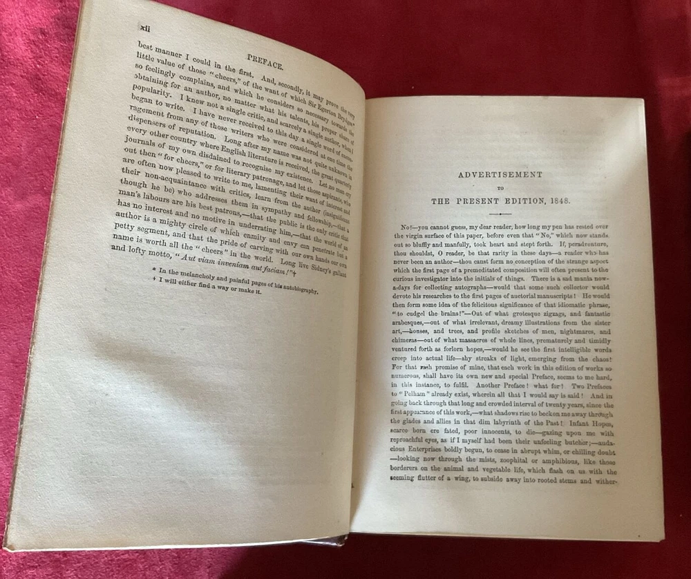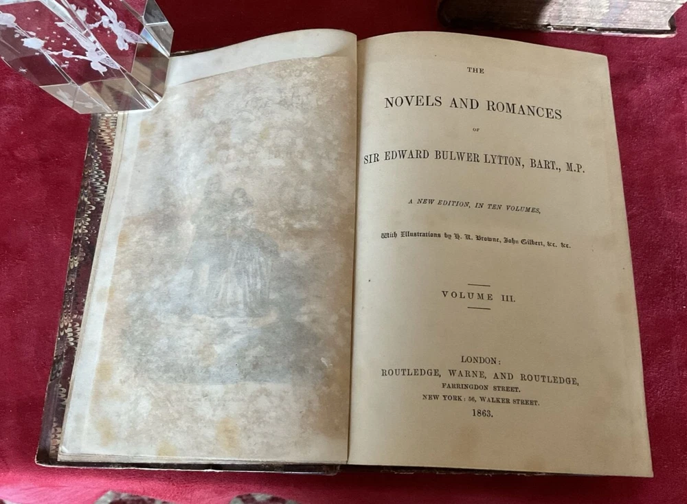 RARE COLLECTION: Bulwer Lytton's Novels and Romances Vol. 1-10 1863 Tan Partial Leather w/Marble THE NOVELS AND ROMANCES OF SIR EDWARD BULWER LYTTON, BART., M.P. A NEW EDITION IN TEN VOLUMES, WITH ILLUSTRATIOS BY –K. Browne, John Gilbert, &c. &c . LONDON ROUTLEDGE, WARNE, AND ROUTLEDGE, 1863 Printer Sevill and Edwards, London Bulwer Lytton's Novels and Romances Vol. 1-10 1863 1/4 Tan Partial Leather w/Red and Brown & Marble Boards This set is bound beautifully in 1/4 tan leather with red and brown leather labels, binding raised bands and floral tooling within gilt-bordered compartments, top edges gilt, marbled endpapers spines, marbled boards and endpapers. 10 Volume Set Printed in London in 1863 - over 71/2" x 5", attractively bound. Vol. I - Pelham, or, Adventures of a Gentleman; Godolphin - This volume has several prefaces: Preface to the edition of 1828* (*Viz. the Second Edition); Advertisement to The Present Edition, 1848. Prior to the beginning of Godolphin there is a letter, a preface and table of contents. Inside cover binding has small separation of marble, binding is tight, heavy foxing on title and illustration pages and thins out on surrounding pages. Majority of pages are clean. Book shelf normal wear and edges have normal wear. Vol. II – The Disowned; Devereux – Beginning has Advertisement to the Present Edition E.B.L. Knebworth, May 3, 1852. Binding has small separation on inside cover top section; heavy foxing on the inside cover pages, not as heavy on title and illustration for The Disowned, a little more on the Devereux pages. The majority of pages are clean. Dedication pages at the beginning of Devereux; The Autobiographer’s Introduction, Morton Devereux; and Note to the Present Edition, 1852 followed by Table of Content. Book has shelf wear on cover and edges. Vol. III – Eugene Aram Book 1; Paul Clifford; Tomlinsoniana or The Posthumous Writings of the Celebrated Augustus Tomlinson Addressed to his Pupils (no illustration). Beginning of book dedication: To Sir Walter Scott, Bart. London December 22, 1831. Preface To the Edition of 1831 – December 22, 1831.; Preface To the Edition 1840, Brussels August 1840; Preface to Present Edition Essay by Eugene Aram. Inside cover binding has small separation of marble, binding is tight, heavy foxing on title and illustration pages and thins out on surrounding pages. Majority of pages are clean. Book shelf normal wear and edges have normal wear. Vol. IV – RIENZI, The Last of The Tribunes, Book 1; The Last Days of Pompeii Book The First - This volume has several prefaces: Dedication of Rienzi to Alessandro Manzoni, London Dec. 1, 1835; another Dedication and 2 Prefaces to the First Edition of Rienzi 1835 and the Present 1848. Inside front after title, you can see separation, but binding remains tight throughout book, the foxing is heavy on the blank cover pages, and light on the title and illustration. There is some intermittent small spots and a couple pages were creased at the top corners. Page 208 has George Routledge and Company printed on the binding section. There is a large Appendix section at the end of Rienzi. Pompeii has a letter to Sir William Gell and a Preface to the First Edition 1834 and Present 1850. There are NOTES at the end of this section. This cover has a discolored section that must have been exposed to the sun, you should see on photos. Heavy foxing on plain pages, lightens on title and illustration pages and thins out on surrounding pages. Majority of pages are clean. Book shelf normal wear and edges have normal wear. Vol. V – Ernest Maltravers; Alice, or The Mysteries Book 1; Prefixed to the First Edition of 1837; Second section just as Note Knebworth Dec. 14, 1851. Inside front cover the marble is splitting at the binding and binding remains tight throughout book. The foxing is heavy on the blank cover pages, and light on the title and illustration. There are intermittent small spots. The cover has a some of the leather thinned on the bottom cover right corner and top binding top corner. Majority of pages are clean. Book shelf normal wear and edges have normal wear, yet there is more separation of the marble on the bottom edges. Vol. VI – The Last of the Barons; Leila, or The Siege of Granada; Calderon, The Courtier; (3 Stories). Barons has Dedicatory Epistle E.B.L. London, January 1843, Preface The Last of the Barons, with NOTE at the end. Leila has dedication to The Countess of Blessington, Preface to the First Edition, and Table of Content. The binding remains tight throughout book. The foxing is heavy on the blank cover pages, and light on the title and illustration. Majority of pages are clean. Marbling on the back top cover shows possible sun damage. Book shows normal shelf normal wear. Vol. VII – ZANOLI Book The First ; HAROLD, The Last of The Saxon Kings Book 1; Prefixed to the First Edition of 1837; Second section just as Note Knebworth Dec. 14, 1851. Zanoli has Dedicatory Epistle To Zanoni E.B.L. London May 1845, Preface to Present Edition 1853 than Introduction London, January 1942 and ends with NOTE. Harold has a Dedicatory Epistle E.B.L. followed by Preface to the Third Edition. The binding remains tight throughout book. The foxing is heavy on the blank cover pages, and light on the title and illustration. There are intermittent small spots and some small creases were found on some top corners and bottom corners. Majority of pages are clean. Marbling on the front cover shows more wear and back cover has some marbling missing along the edge of the leather to binding. Book shows normal shelf normal wear. This edition shows volume printed: I Radbury and Evans, Printers, Whitefriars (London) at end of Zanoli book. Vol. III - Night and Morning; The Pilgrims of the Rhine; Front of book binding has separation on dedication page "To The RIGHT HONOURABLE C.T. D'EYNCOURT, M.P.; This work, in Part composed under his hospitality roof, is Dedicated as a slight memorial of affection fri