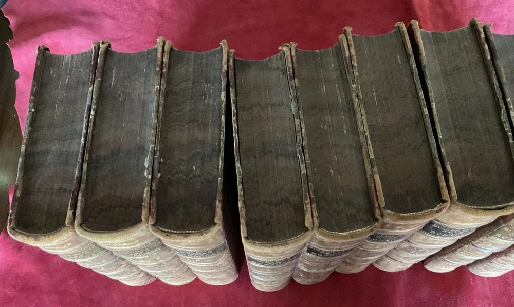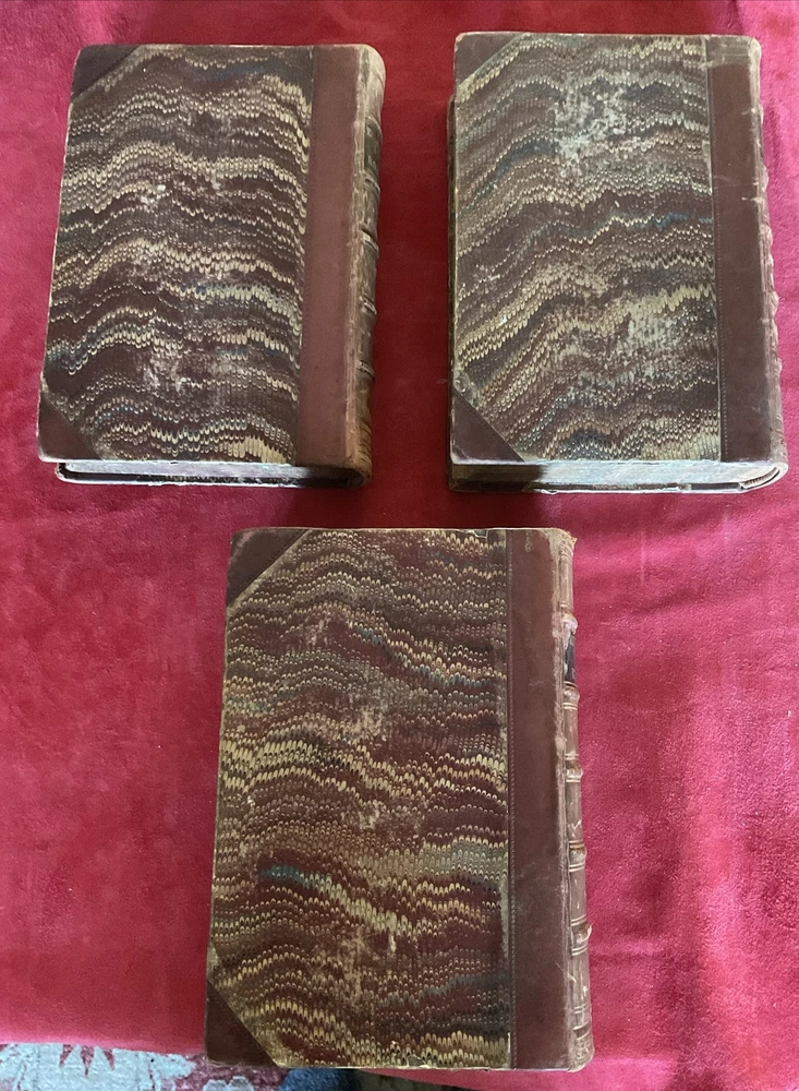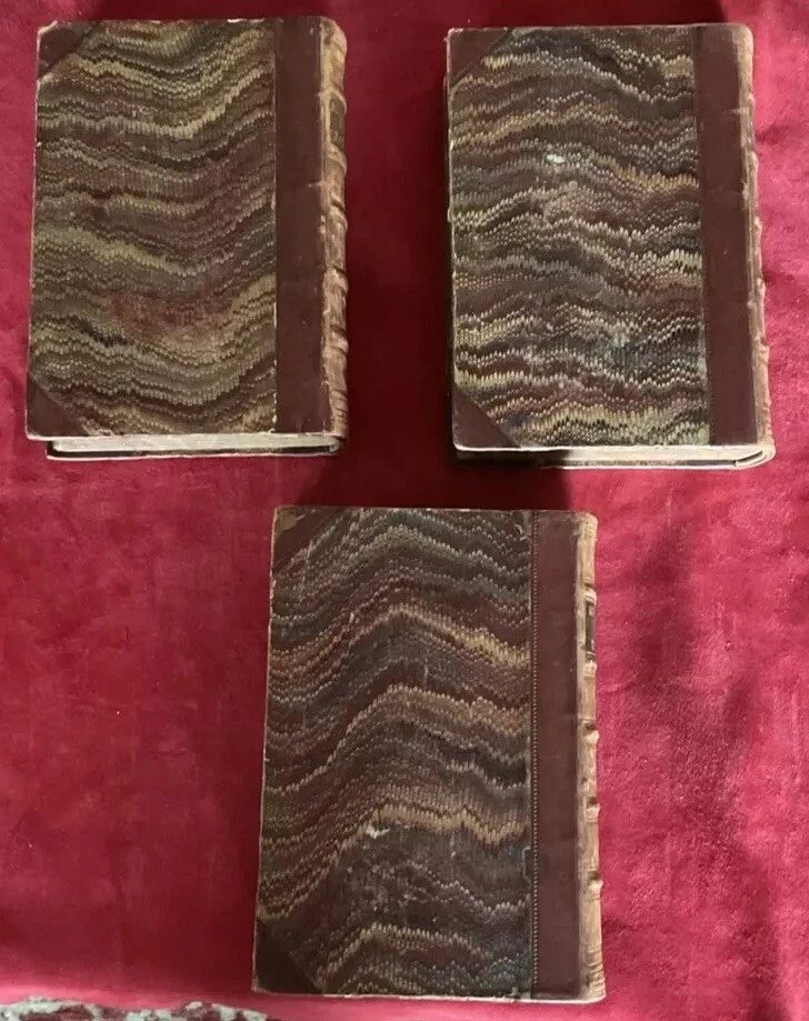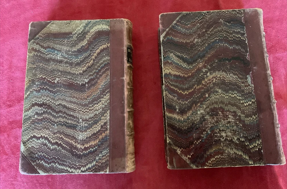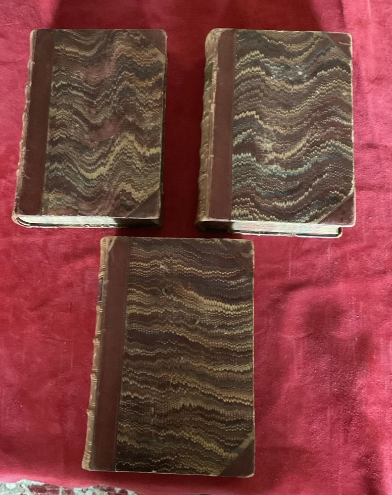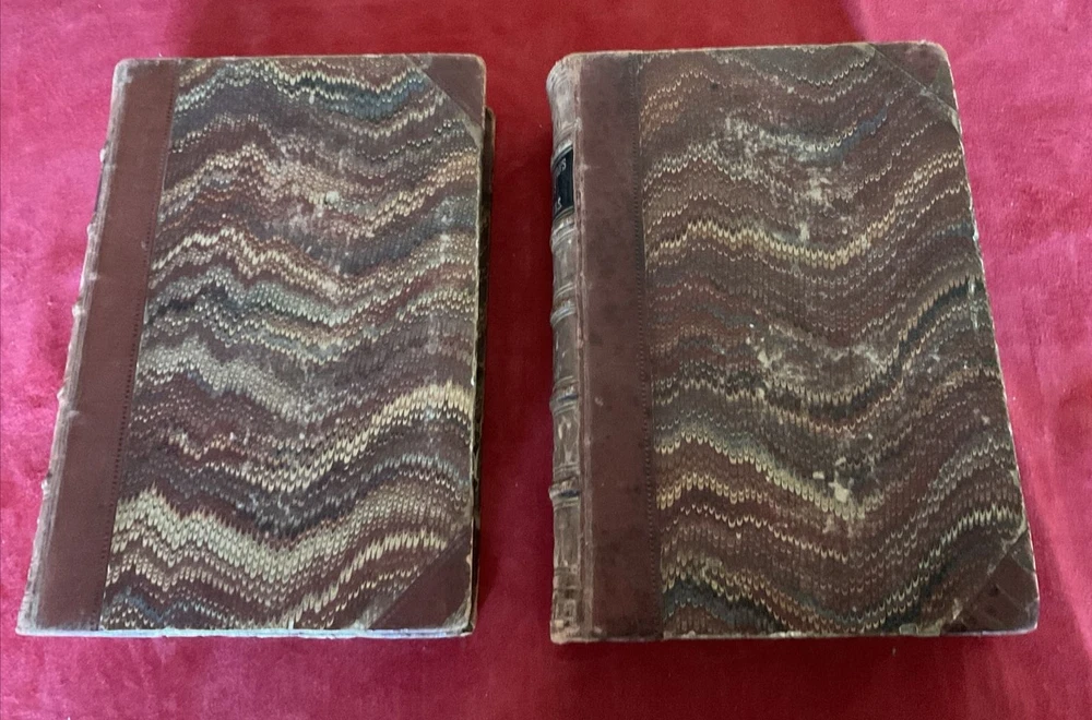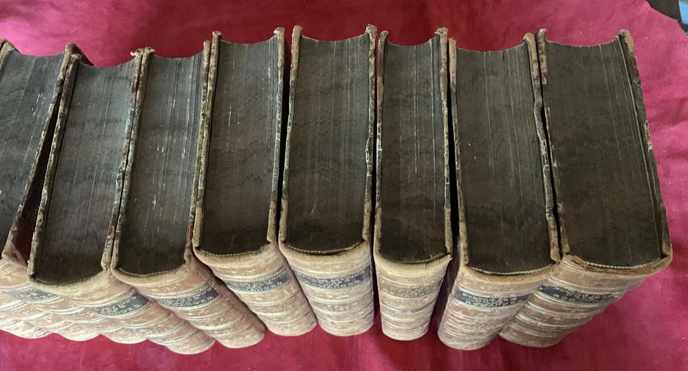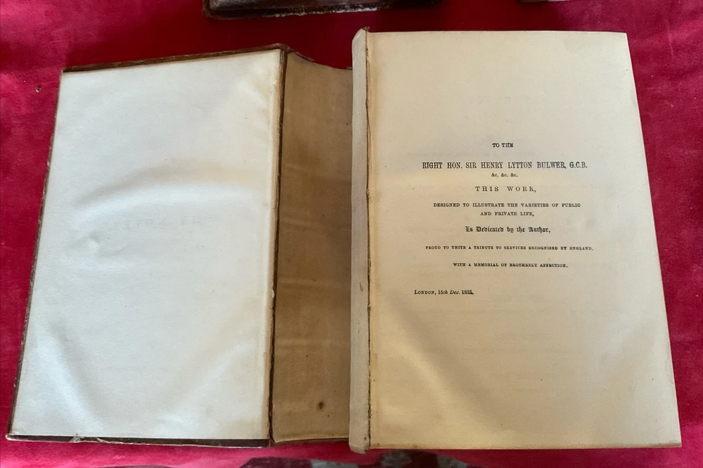RARE COLLECTION: Bulwer Lytton's Novels and Romances Vol. 1-10 1863 Tan Partial Leather w/Marble THE NOVELS AND ROMANCES OF SIR EDWARD BULWER LYTTON, BART., M.P. A NEW EDITION IN TEN VOLUMES, WITH ILLUSTRATIOS BY –K. Browne, John Gilbert, &c. &c . LONDON ROUTLEDGE, WARNE, AND ROUTLEDGE, 1863 Printer Sevill and Edwards, London Bulwer Lytton's Novels and Romances Vol. 1-10 1863 1/4 Tan Partial Leather w/Red and Brown & Marble Boards This set is bound beautifully in 1/4 tan leather with red and brown leather labels, binding raised bands and floral tooling within gilt-bordered compartments, top edges gilt, marbled endpapers spines, marbled boards and endpapers. 10 Volume Set Printed in London in 1863 - over 71/2" x 5", attractively bound. Vol. I - Pelham, or, Adventures of a Gentleman; Godolphin - This volume has several prefaces: Preface to the edition of 1828* (*Viz. the Second Edition); Advertisement to The Present Edition, 1848. Prior to the beginning of Godolphin there is a letter, a preface and table of contents. Inside cover binding has small separation of marble, binding is tight, heavy foxing on title and illustration pages and thins out on surrounding pages. Majority of pages are clean. Book shelf normal wear and edges have normal wear. Vol. II – The Disowned; Devereux – Beginning has Advertisement to the Present Edition E.B.L. Knebworth, May 3, 1852. Binding has small separation on inside cover top section; heavy foxing on the inside cover pages, not as heavy on title and illustration for The Disowned, a little more on the Devereux pages. The majority of pages are clean. Dedication pages at the beginning of Devereux; The Autobiographer’s Introduction, Morton Devereux; and Note to the Present Edition, 1852 followed by Table of Content. Book has shelf wear on cover and edges. Vol. III – Eugene Aram Book 1; Paul Clifford; Tomlinsoniana or The Posthumous Writings of the Celebrated Augustus Tomlinson Addressed to his Pupils (no illustration). Beginning of book dedication: To Sir Walter Scott, Bart. London December 22, 1831. Preface To the Edition of 1831 – December 22, 1831.; Preface To the Edition 1840, Brussels August 1840; Preface to Present Edition Essay by Eugene Aram. Inside cover binding has small separation of marble, binding is tight, heavy foxing on title and illustration pages and thins out on surrounding pages. Majority of pages are clean. Book shelf normal wear and edges have normal wear. Vol. IV – RIENZI, The Last of The Tribunes, Book 1; The Last Days of Pompeii Book The First - This volume has several prefaces: Dedication of Rienzi to Alessandro Manzoni, London Dec. 1, 1835; another Dedication and 2 Prefaces to the First Edition of Rienzi 1835 and the Present 1848. Inside front after title, you can see separation, but binding remains tight throughout book, the foxing is heavy on the blank cover pages, and light on the title and illustration. There is some intermittent small spots and a couple pages were creased at the top corners. Page 208 has George Routledge and Company printed on the binding section. There is a large Appendix section at the end of Rienzi. Pompeii has a letter to Sir William Gell and a Preface to the First Edition 1834 and Present 1850. There are NOTES at the end of this section. This cover has a discolored section that must have been exposed to the sun, you should see on photos. Heavy foxing on plain pages, lightens on title and illustration pages and thins out on surrounding pages. Majority of pages are clean. Book shelf normal wear and edges have normal wear. Vol. V – Ernest Maltravers; Alice, or The Mysteries Book 1; Prefixed to the First Edition of 1837; Second section just as Note Knebworth Dec. 14, 1851. Inside front cover the marble is splitting at the binding and binding remains tight throughout book. The foxing is heavy on the blank cover pages, and light on the title and illustration. There are intermittent small spots. The cover has a some of the leather thinned on the bottom cover right corner and top binding top corner. Majority of pages are clean. Book shelf normal wear and edges have normal wear, yet there is more separation of the marble on the bottom edges. Vol. VI – The Last of the Barons; Leila, or The Siege of Granada; Calderon, The Courtier; (3 Stories). Barons has Dedicatory Epistle E.B.L. London, January 1843, Preface The Last of the Barons, with NOTE at the end. Leila has dedication to The Countess of Blessington, Preface to the First Edition, and Table of Content. The binding remains tight throughout book. The foxing is heavy on the blank cover pages, and light on the title and illustration. Majority of pages are clean. Marbling on the back top cover shows possible sun damage. Book shows normal shelf normal wear. Vol. VII – ZANOLI Book The First ; HAROLD, The Last of The Saxon Kings Book 1; Prefixed to the First Edition of 1837; Second section just as Note Knebworth Dec. 14, 1851. Zanoli has Dedicatory Epistle To Zanoni E.B.L. London May 1845, Preface to Present Edition 1853 than Introduction London, January 1942 and ends with NOTE. Harold has a Dedicatory Epistle E.B.L. followed by Preface to the Third Edition. The binding remains tight throughout book. The foxing is heavy on the blank cover pages, and light on the title and illustration. There are intermittent small spots and some small creases were found on some top corners and bottom corners. Majority of pages are clean. Marbling on the front cover shows more wear and back cover has some marbling missing along the edge of the leather to binding. Book shows normal shelf normal wear. This edition shows volume printed: I Radbury and Evans, Printers, Whitefriars (London) at end of Zanoli book. Vol. III - Night and Morning; The Pilgrims of the Rhine; Front of book binding has separation on dedication page "To The RIGHT HONOURABLE C.T. D'EYNCOURT, M.P.; This work, in Part composed under his hospitality roof, is Dedicated as a slight memorial of affection fri