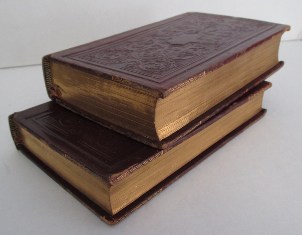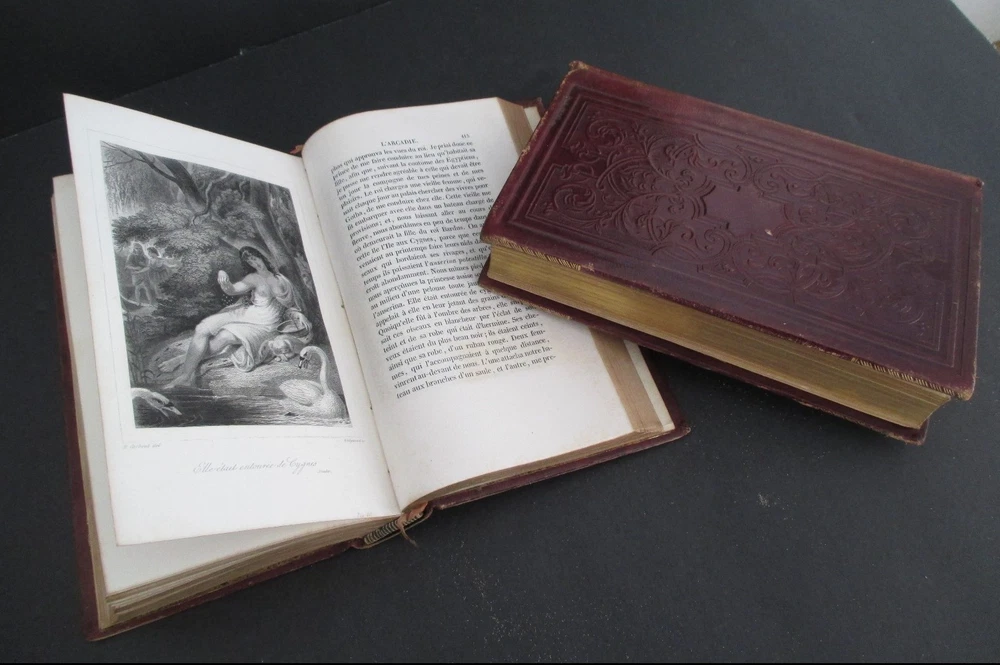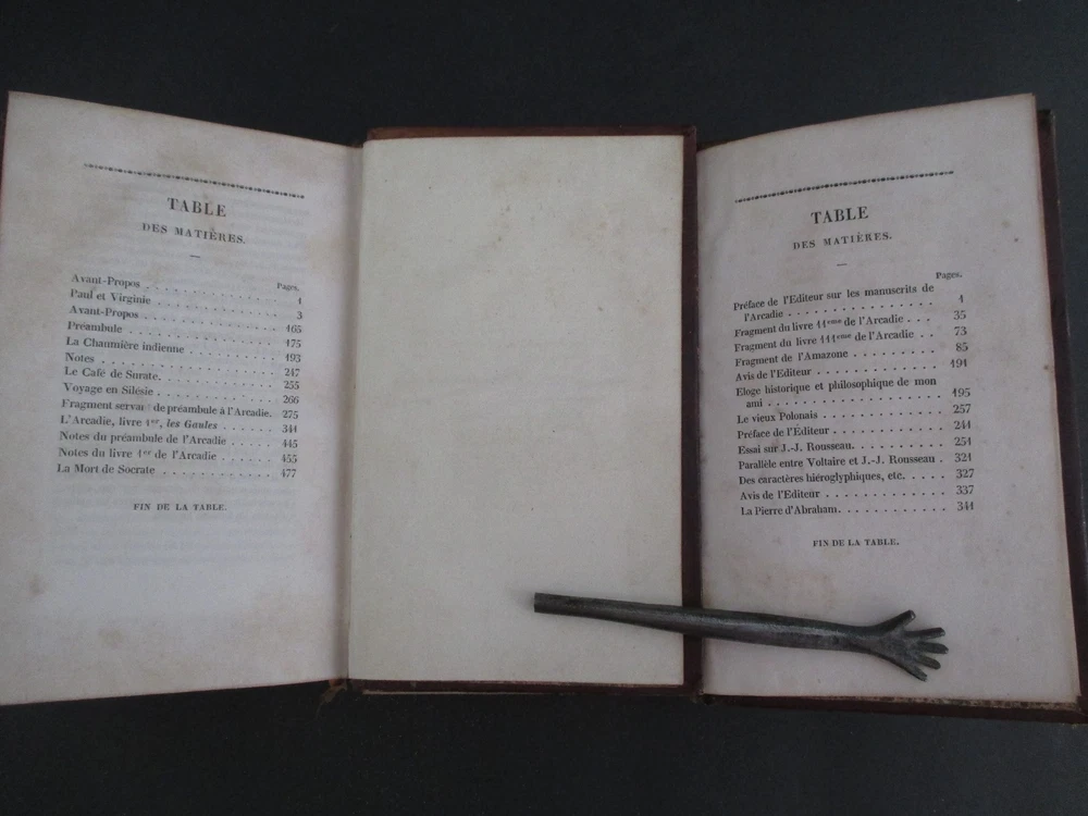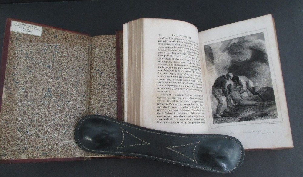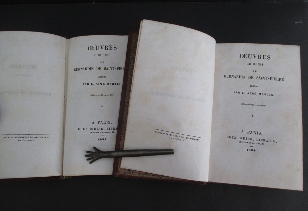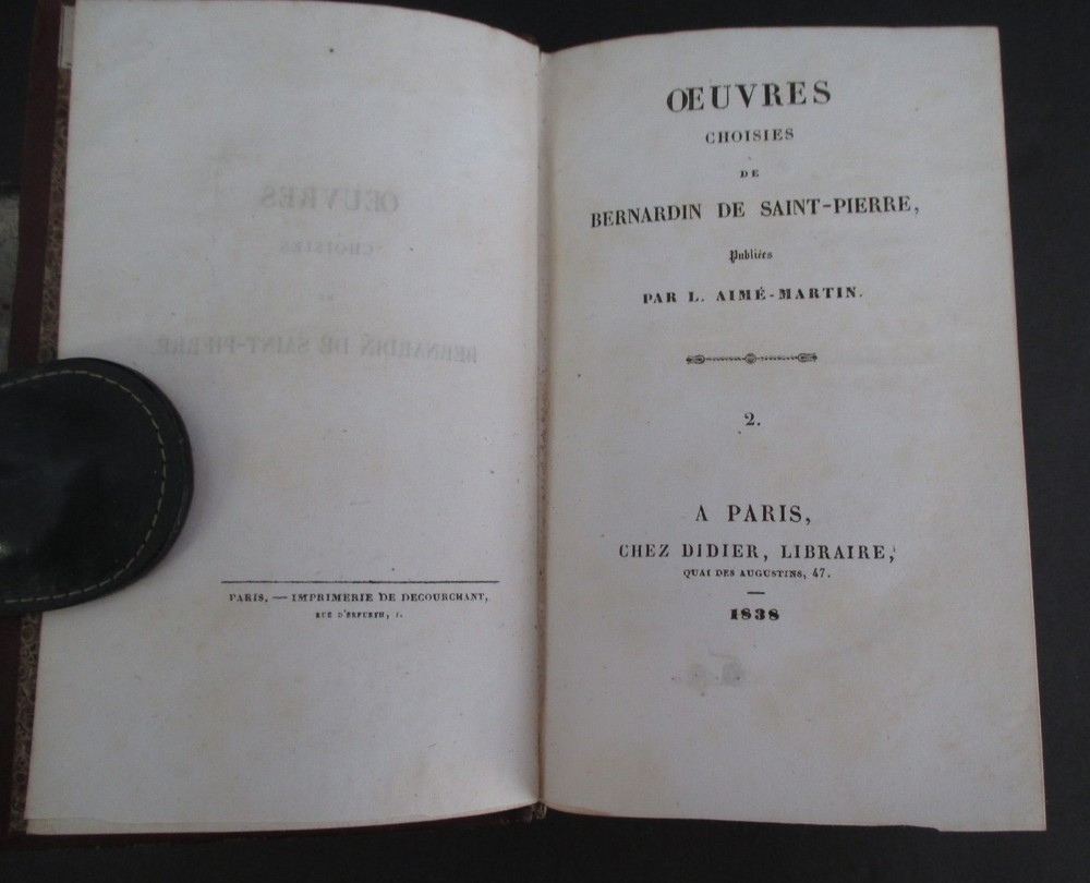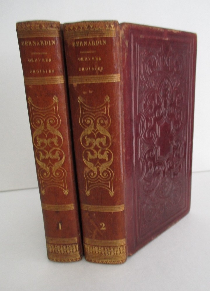 OEUVRES CHOISIES DE BARNARDIN DE SAINT-PIERRE publiees par L Aime-Martin was published 1838 in Paris Chez Didier, Libraire in 2 volumes each measuring 6 3/4" x 4 1/8" with leather binding, gilt spine decoration, all page edges gilt, marbled endpapers, 551 + 422 pages, and b+w engravings. All text is in French. Th collection includes the children's title Paul & Virginie. Ticket of Alphonse Gatineau Imprimeur, Libraire de L'Eveche, Rue Royal, 78, A Orleans at upper left inside front cover of Vol I. Vols 1 and 2 mis-numbered on spines; light rnadom foxing; light rubbing to leather extremities; otherwise solid and clean. Thank you.