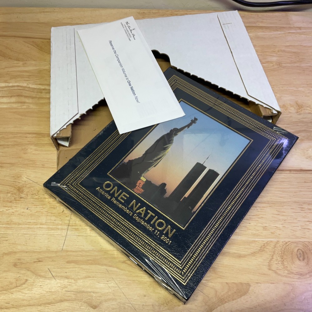 Crafted to capture the poignant spirit of a nation, "ONE NATION America Remembers September 11, 2001" is an Easton Press leather-bound hardcover book that delves into the historical narrative of the World Trade Center attack. It is an anthology that brings together personal narratives, historical imagery, and scholarly insights, all aimed at educating and commemorating the events of September 11.The book stands at 11 inches tall, with a comfortable weight of 3.7 pounds, making it a substantial yet readable addition to any collection. It features 195 pages of nonfiction content, rich with photographs and illustrations that depict the unfolding of that fateful day. This first edition collectible, published in 2001, is a tribute to the resilience and unity of America, designed for both young adults and adults alike. Still in shrink wrap. Original packaging. Includes COA.