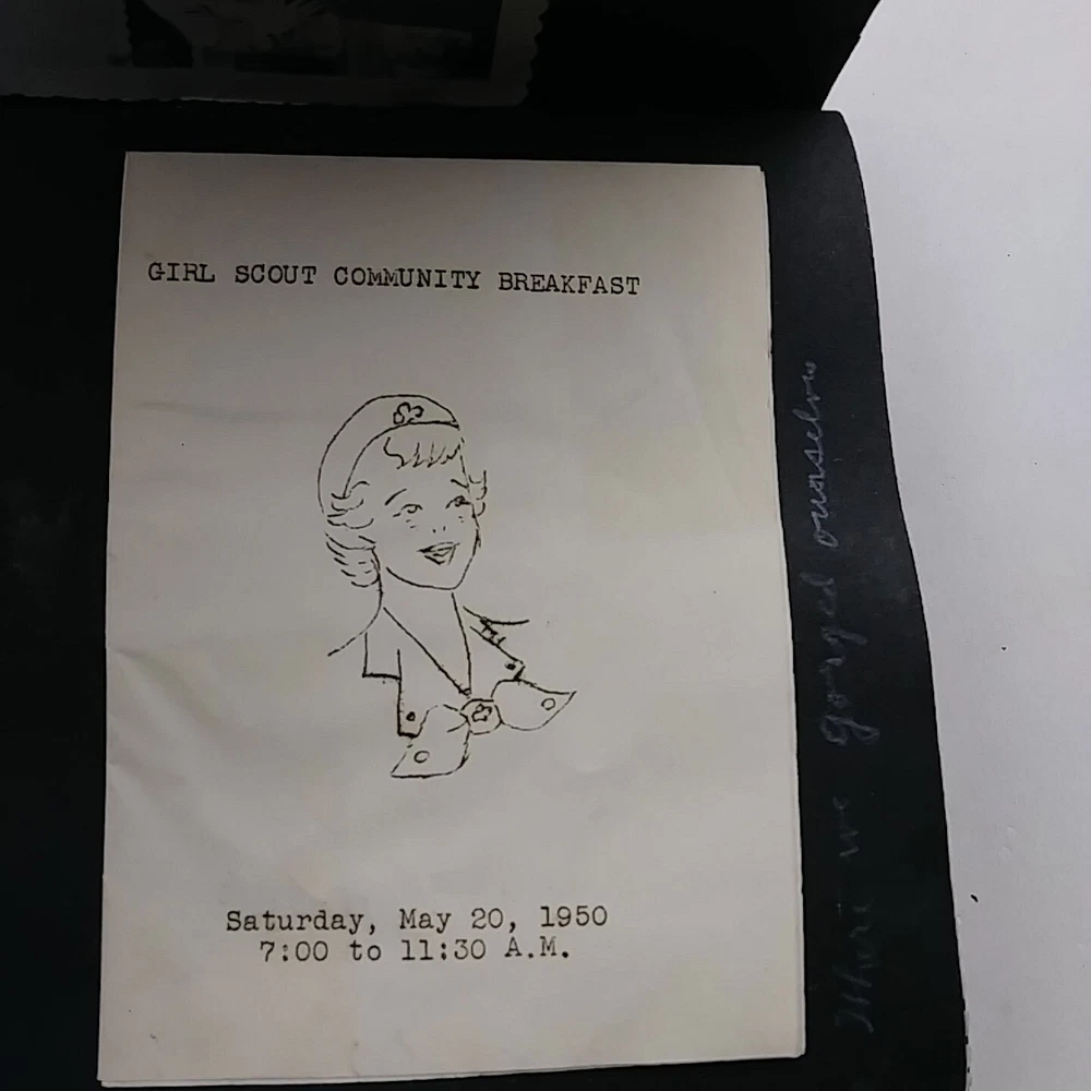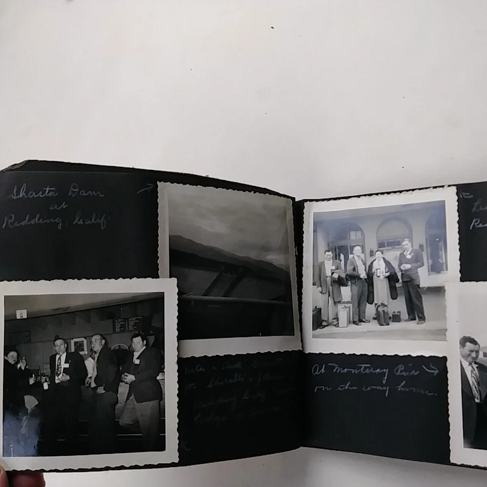 1950 Snap Shots Leather Bound Photo Album, Haywood California 47 Pics March-June 1950 trip to Haywood, California. Hand painted cover. Black & white pictures are mostly of people/family, some background scenery. Girl Scout Breakfast Menu. Decent condition, some wear.