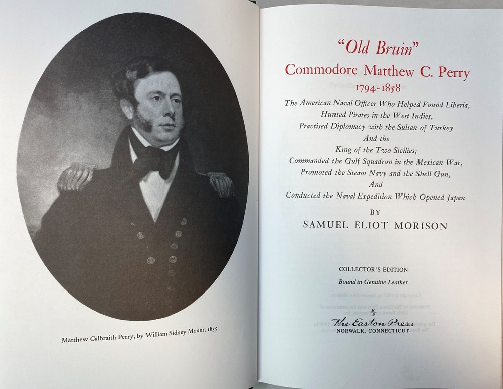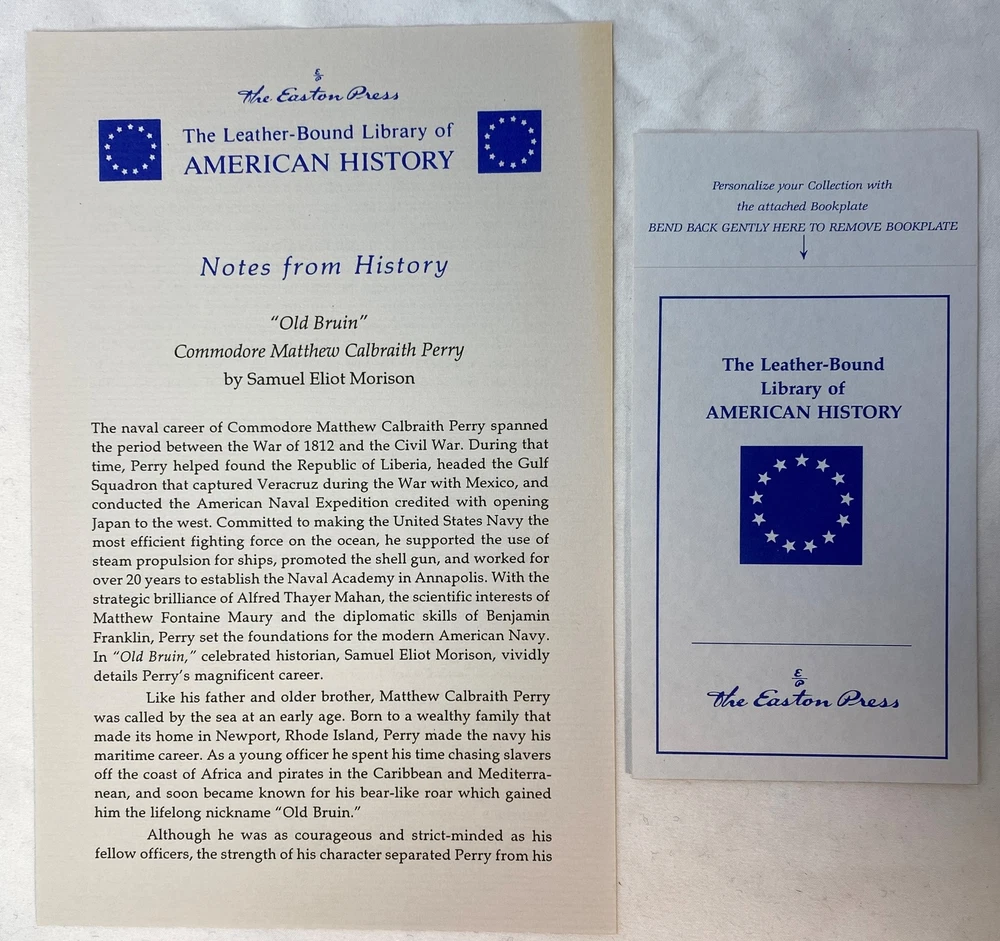 "Old Bruin" Commodore Matthew C Perry 1794-1858 by Samuel Eliot Morison Part of the Library of American History collection of The Easton Press, Norwalk, Connecticut, 1990. Illustrated. This book is in excellent, unread condition. However, there are scratches on the fore edge of the gilded page ends. Includes Notes from History. The Easton Press books are bound in genuine leather binding, with 22kt gold accents and hubbed spines, gilded page ends, acid-neutral paper, and evocative illustrations and decorations. We will be happy to combine shipping, wherever possible. Some items cannot be combined because of their size, weight or because they are fragile. Please ask if you have any questions. Your order will ship by the next business day after receiving payment. All items are from a smoke-free environment. Thank you, and Happy Reading!