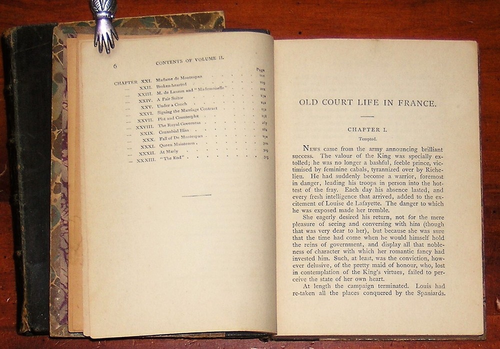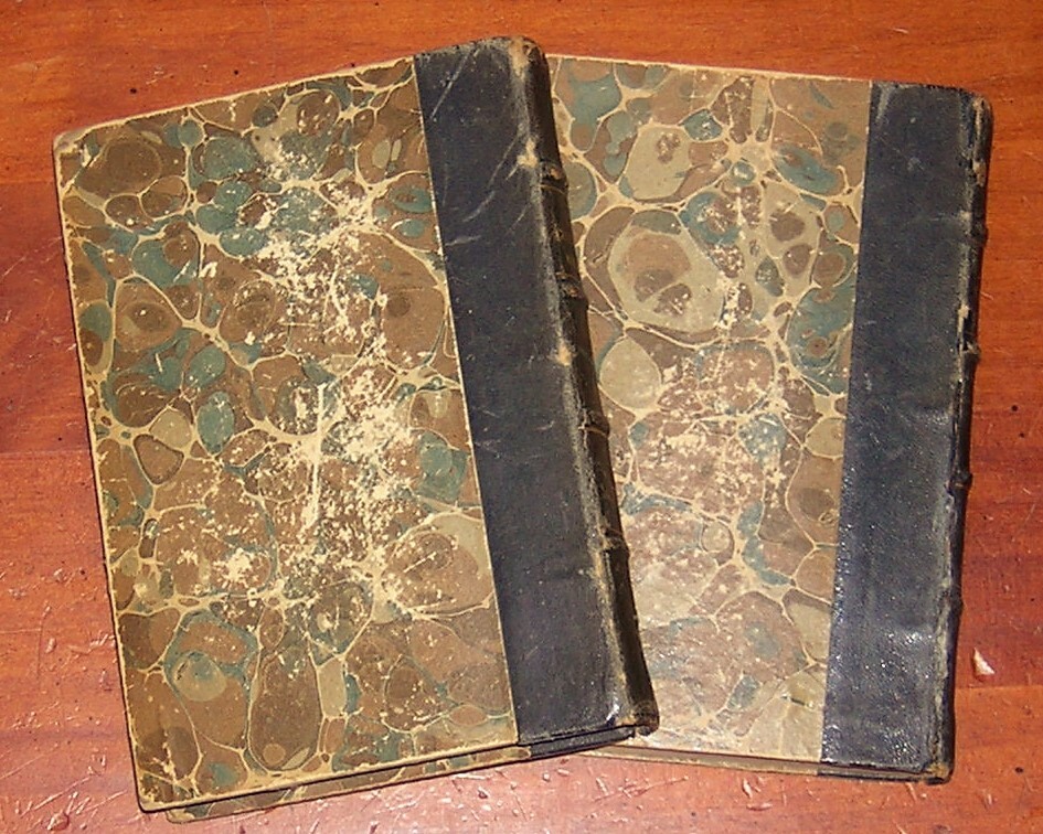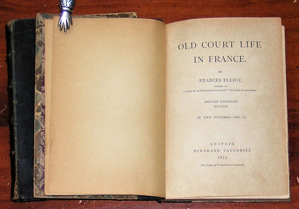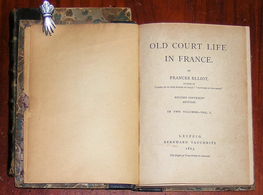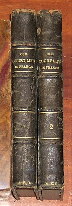 Old Court Life in France, in Two Volumes, a novel set during the time of Cardinal Richileu, by Frances Elliot. Published in 1873 by Bernhard Tauchnitz, Leipzig. 2 Volume Set, in half leather and marbled boards. The leather spine in Vol. 2 had tears repaired, and the front hinge was broken and repaired in Vol. 1, both with good results. The front hinge paper in 1 remains torn. Worn board corners, a few page edge tears and one chip, foxing on the book edges and occasional foxing inside. There's also a small newspaper article about an American buying a French chateau pasted onto a preliminary page in Vol. 1. Otherwise unmarked, tightly bound. Free shipping in the USA. Thanks for looking! Location: Leather drawer #2 (in plastic).