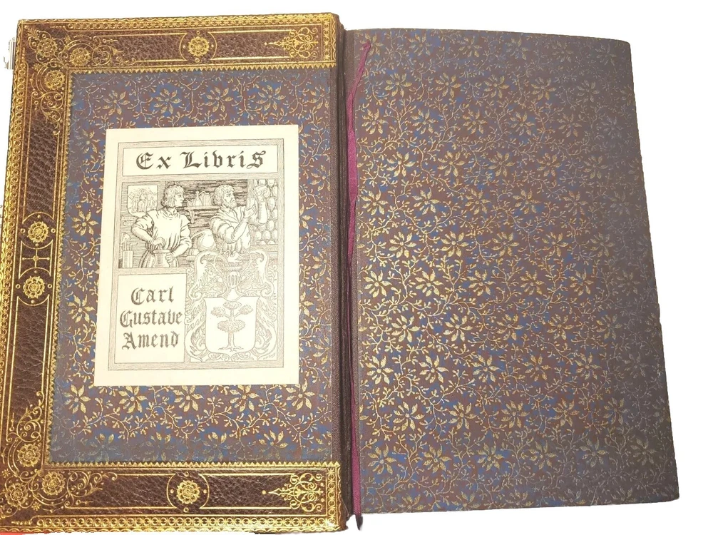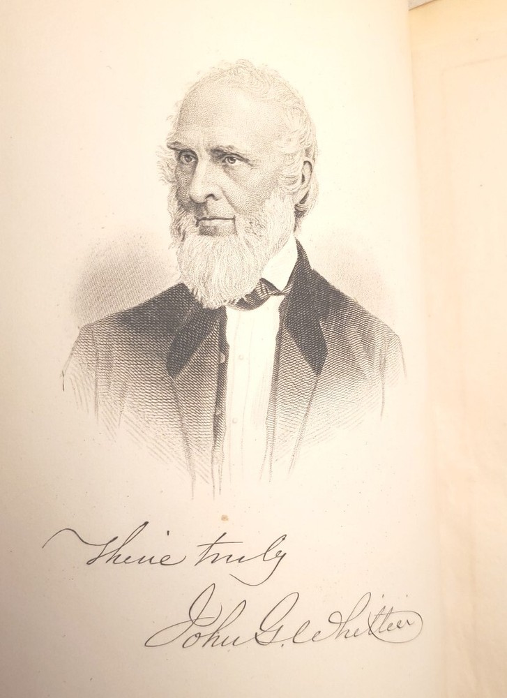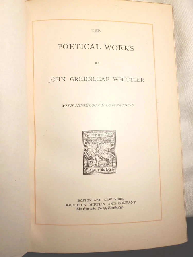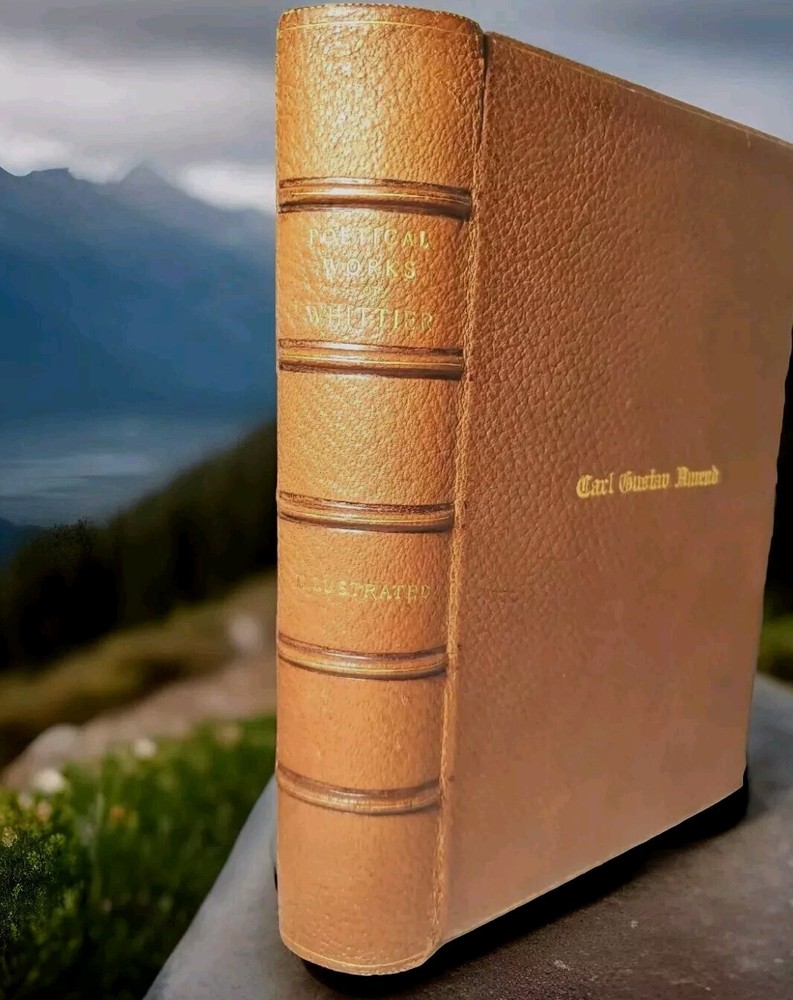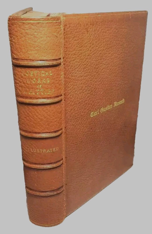 Unusually beautiful book. measures about 9" x 6". The leather binding is exquisite. There is a gorgeous grain in the leather over board. The gold gilded pages are filled with the complete works of poet John Greenleaf Whittier, printed in 1891 by Riverside Press. Many illustrations throughout with tissue protection and we do not find any foxing on the pages. Wonderful condition for its age. See pictures, please. It would make a wonderful addition to your collection or as a thoughtful gift for someone who appreciates fine literature. Five raised spine hubs, gold lettering, and, the fine leather binding. The inscription shows it was a prize gift from Columbia Grammar School to Carl Gustav(e) Amend, who later had a successful business in Pennsylvania before relocating to Brewster Village, New York in Putnam County. Don't miss the chance to own and display this gorgeous piece of history!