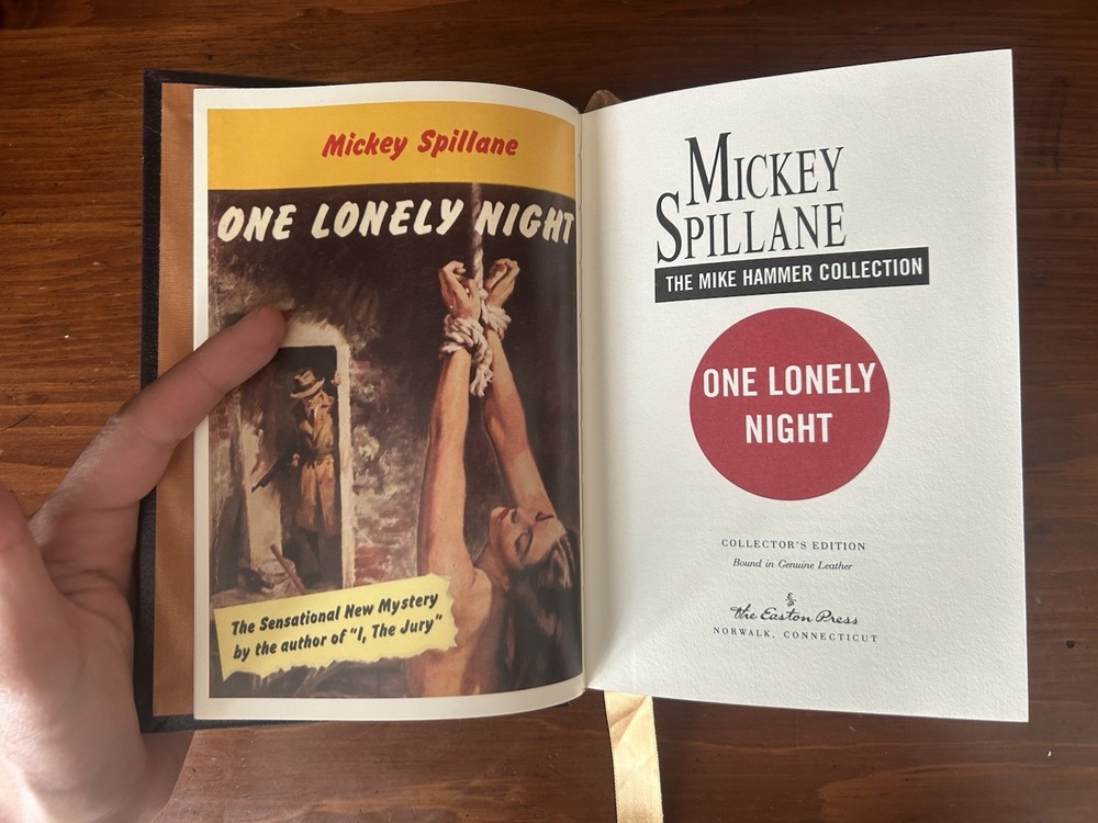 Up for grabs is this Leather-bound hardcover copy of One Lonely Night by Mickey Spillane by Easton Press. From the Mike Hammer Collection. No stains or flaws. A beautiful book!