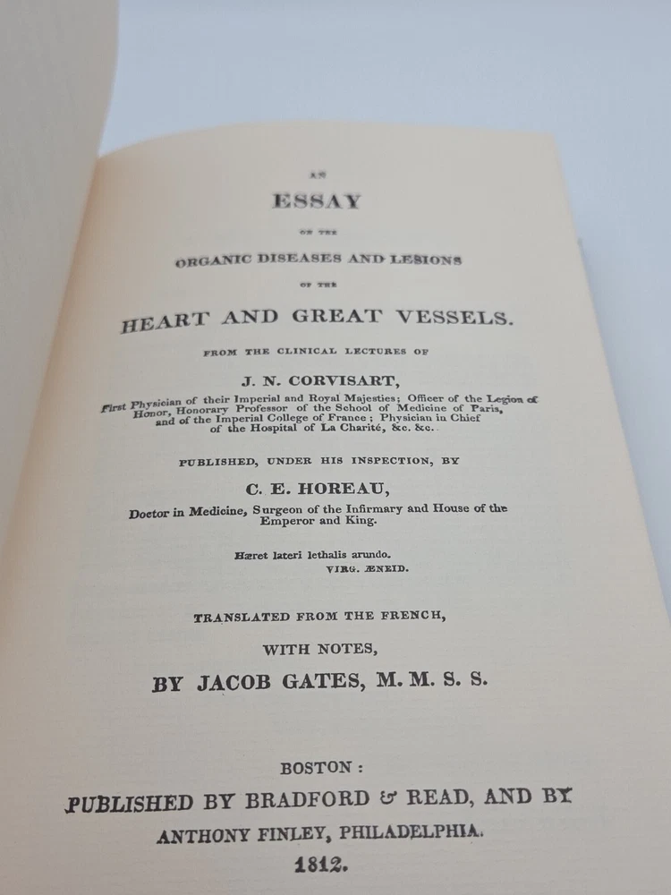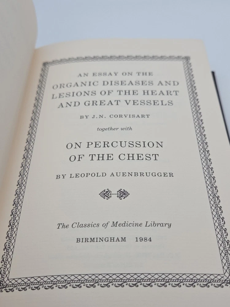 "Organic Diseases of the Heart and Great Vessels" is a classic nonfiction book from the "Classics of Medicine" series by J.N. Corvisart. Originally published in 1984 by John D. Lucas Company, this hardcover book covers a range of topics related to heart and great vessel diseases. With a leather-bound cover and a focus on essays, this book is a valuable resource for adults interested in the history and treatment of these conditions. The organic nature of the content makes it a must-have for anyone interested in the field of medicine, particularly those studying health and treatments. Has marks on outer cover and gilded pages. Also has writing on first page. Will ship very safe in a box
