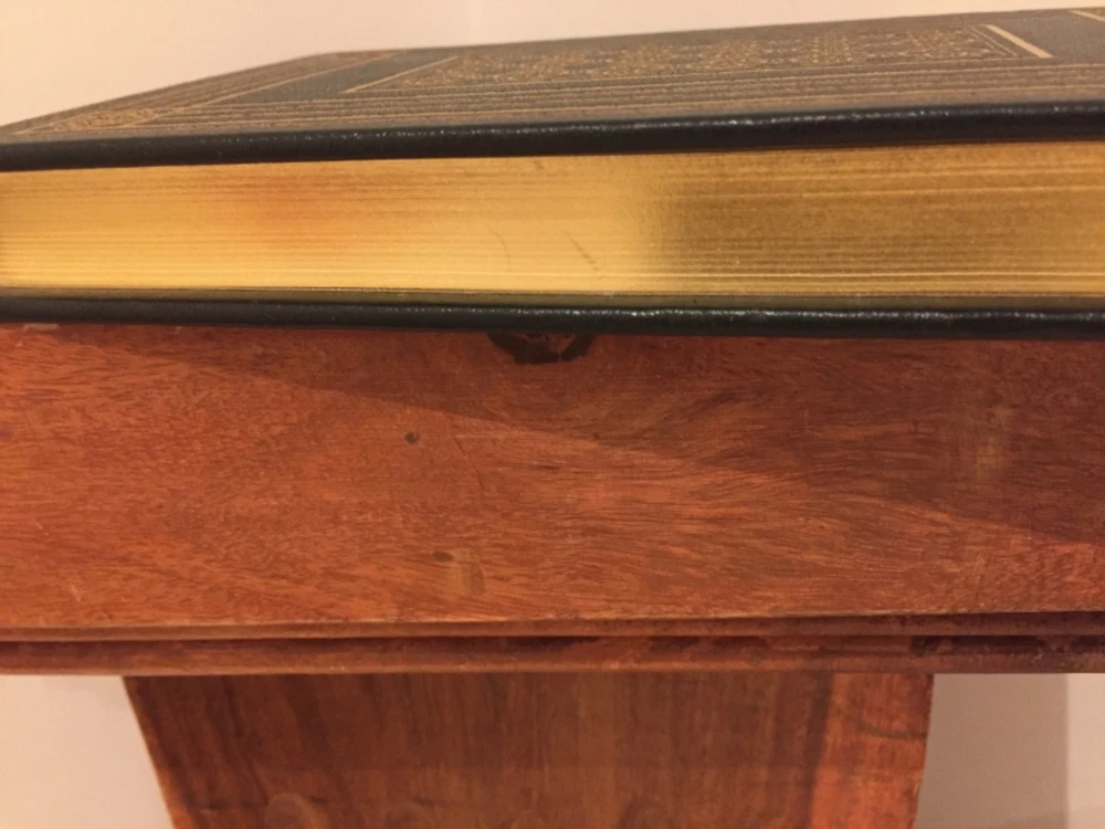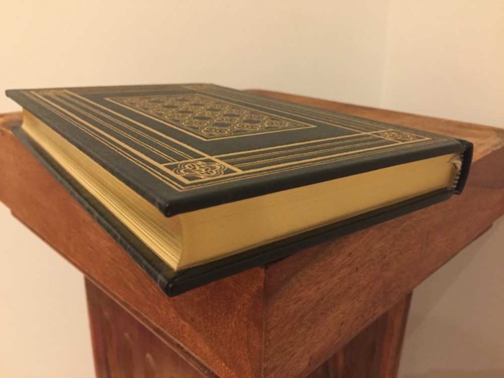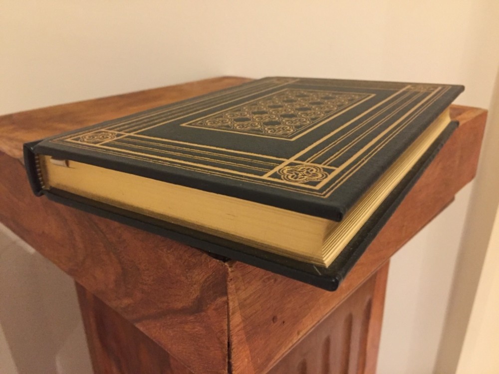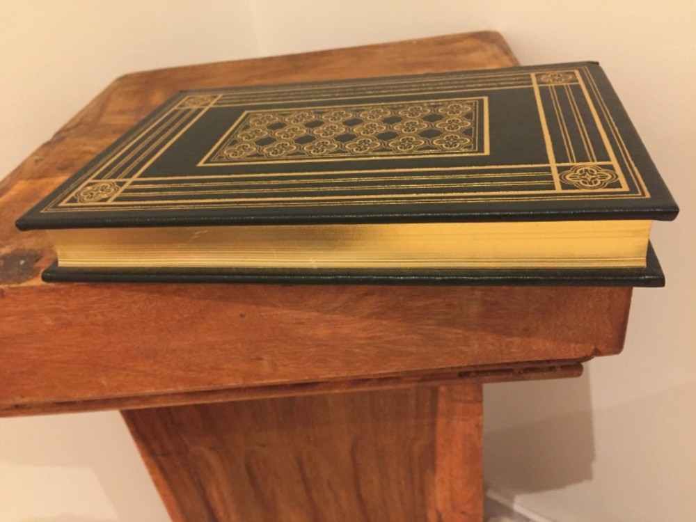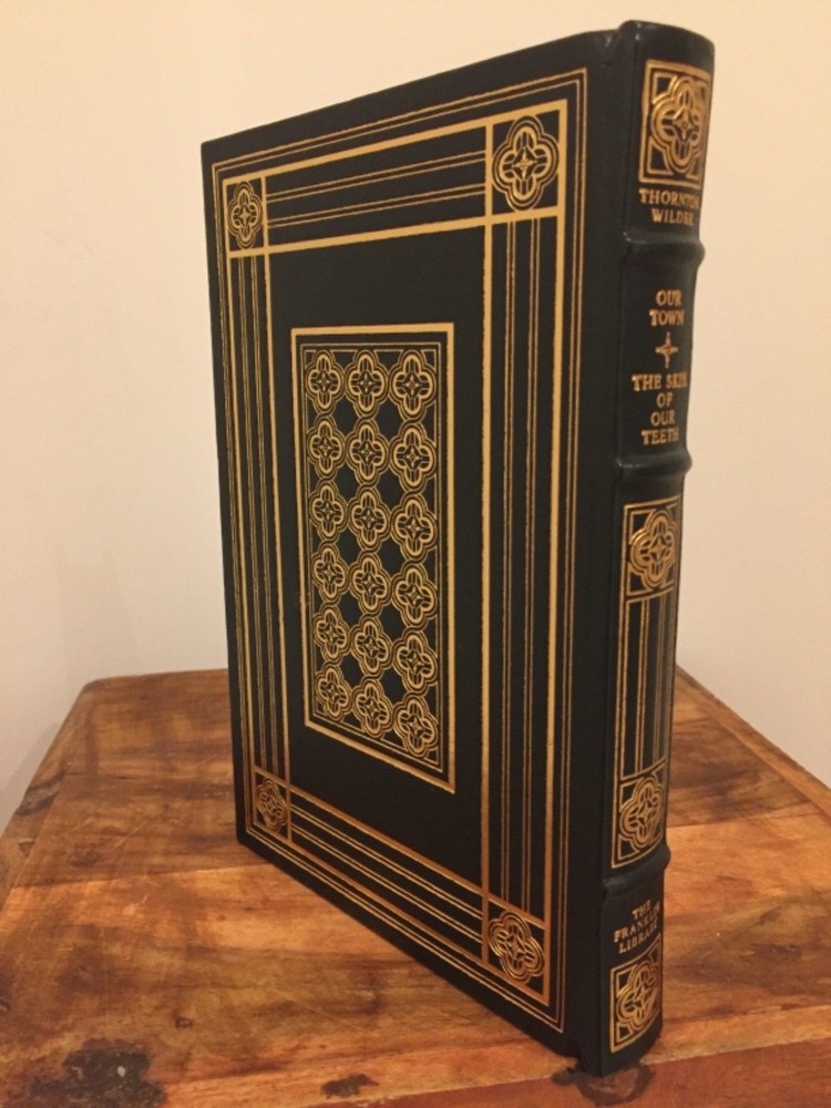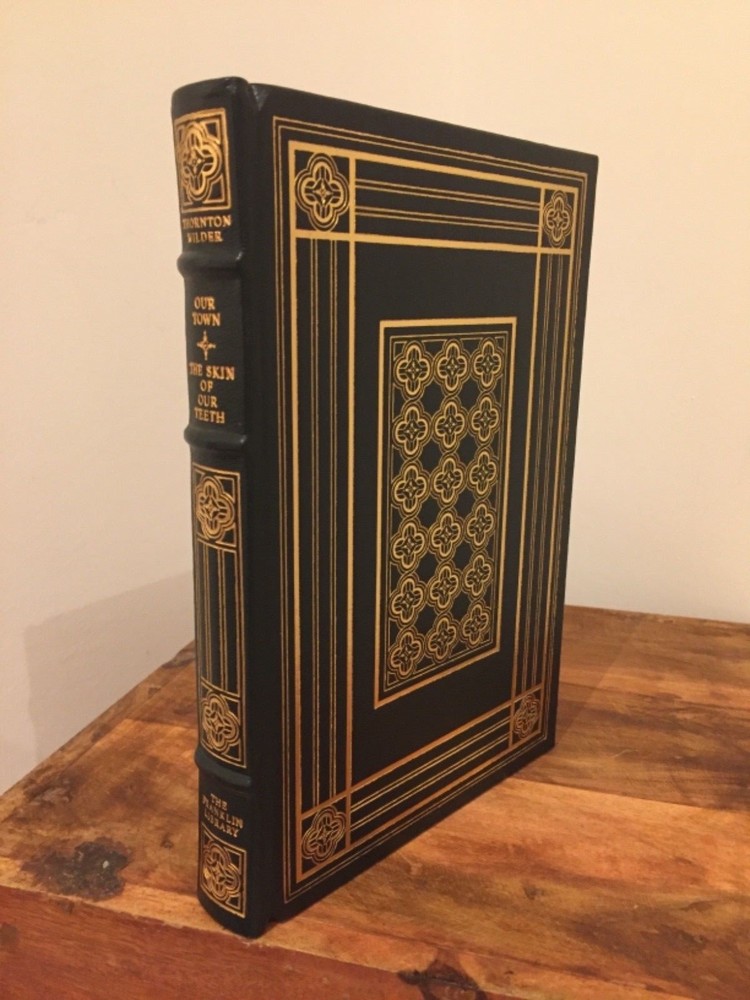 This is full genuine leather bound in new condition, never read. There is no damage to the leather, no frayed book mark. Minuscule imperfection to one area of the gold gilding of page block as shown in photos; these will fade away and blend in after the first reading. Photos show no sagging of the page block, which means it was never displayed and the top has not separated from the spine . 'Our Town & Skin of our Teeth' by Thornton Wilder is one of Franklin Library's unique publishing as a special edition, not associated with a particular collection, with wonderful attributes: •Fully and tightly bound in genuine leather. •22kt gold accents deeply inlaid on the "hubbed" spine and covers. •Heavy duty binding boards enhance the book’s durability. •Superbly printed on acid-neutral paper that lasts for generations. •Sewn pages – not just glued like ordinary books. •Handsome moiré end pages and a satin-ribbon page marker. •Gold gilded page ends. •Rigorous inspection at every stage ensured adherence to exacting standards and the highest quality. •Superb craftsmanship and commitment to quality. The appeal for collecting Franklin Library comes from having these attributes taken way further into the exquisite quality, durability and craftmanship, than Easton Press and Folio Society managed with their productions. This book is the perfect companion out on a park bench with a hot cup of coffee or snuggled up in front of the fireplace. Despite its all-inclusive nature it still feels very light and compact at a size of 3 x 15 x 22cm. Wonderful to hold and excellent reading experience.