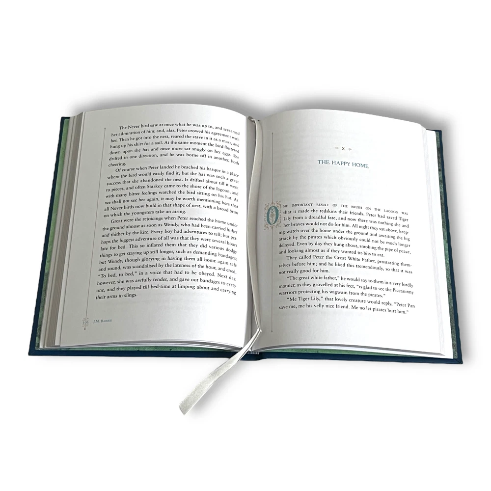 PETER PAN by J. M. Barrie Deluxe Illustrated Leather Bound Hardcover Best Seller! Brand New/Unread Condition! DELUXE EDITION! Featuring a beautifully stamped bonded leather cover, gilt edging, colorful endpapers, and a satin-ribbon bookmark, this collectible edition is a fine addition to any home library. Neverland is home to Peter Pan, a young boy who has never grown up. On one of his visits to London, Peter makes the acquaintance of young Wendy Darling, whom he invites to travel with him to Neverland and become the mother of his gang of Lost Boys. Flying through the night sky to Neverland, Wendy and her brothers John and Michael soon become caught up in marvelous adventures with the Indian Princess Tiger Lily, the loyal fairy Tinker Bell, and Peter's nemesis, the sinister hook-handed pirate known as Captain Hook. Spun by J.M. Barrie from his immensely popular stage play of the same name, Peter Pan is a timeless classic of children's literature. Illustrated with plates by F.D. Bedford. Author - J. M. Barrie Publication date - 09-15-2014 Page count - 200 Hardcover Age range - 10-14 years Leather Editions Dimensions - 6.3 H x 8.3 W x 0.8 D