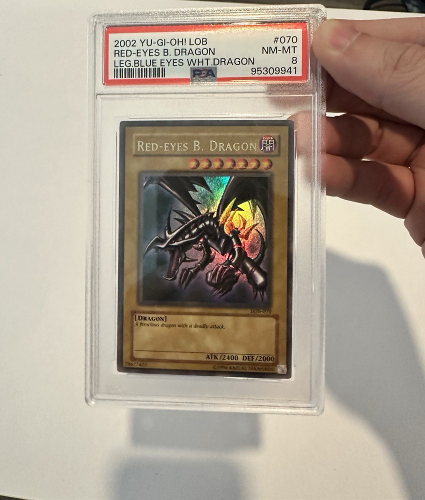 This Red-Eyes B. Dragon is a true grail for any Yu-Gi-Oh! enthusiast—stunning Ultra Rare holo, original 2002 LOB Unlimited Edition, and PSA 8 graded quality. Its fierce artwork and legendary status make it a centerpiece for collectors. Holding this iconic dragon feels like owning a piece of dueling history!