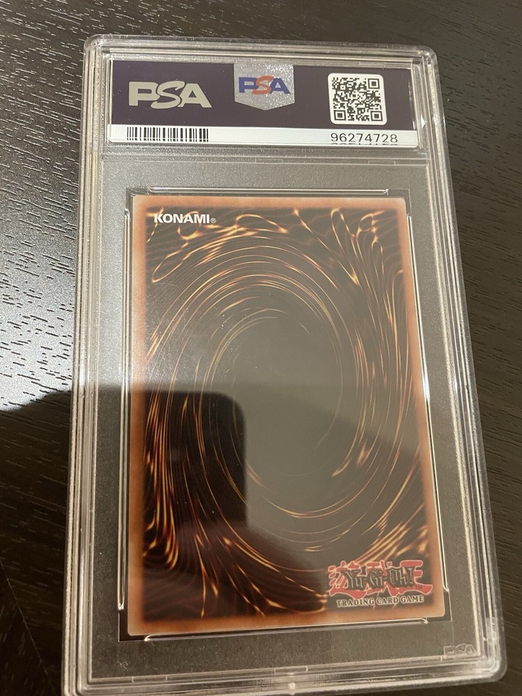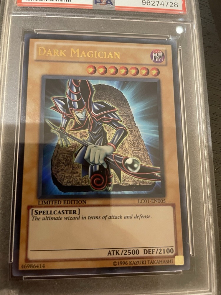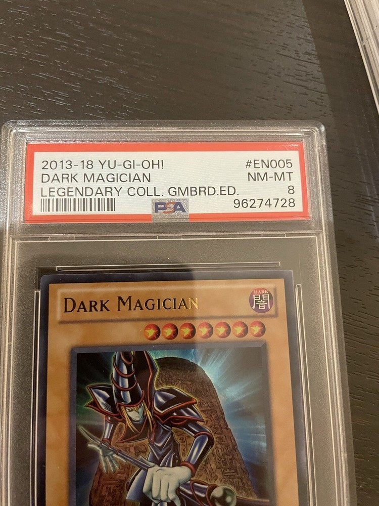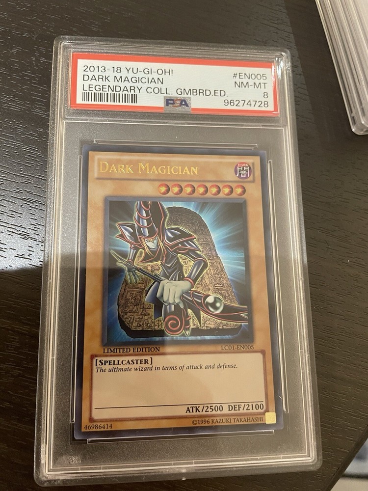 The product is a PSA 8 graded Yu-Gi-Oh card from the "Yugi" set, featuring the Dark Magician character. This ultra rare holo card is manufactured by Konami and authenticated by Professional Sports Authenticator (PSA). With a dark attribute and striking design, this collectable card is sought after by fans and collectors of the Yu-Gi-Oh Trading Card Game.