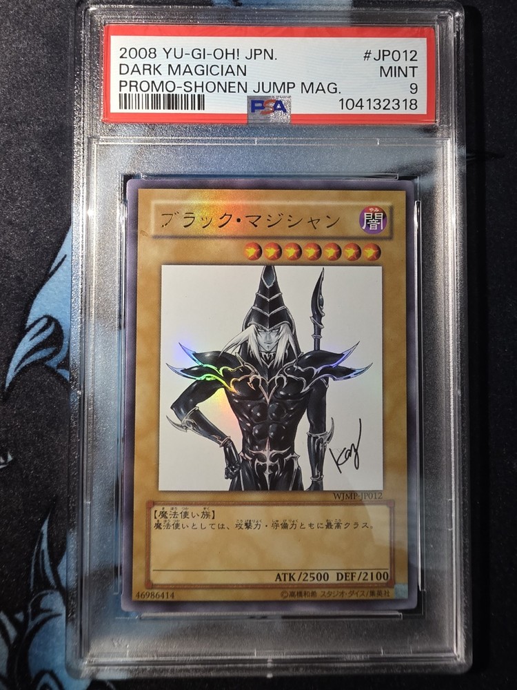 The product is a PSA 9 graded 2008 Yugioh Dark Magician Japanese Shonen Jump Magazine Promo card featuring the signature of Kazuki Takahashi. This collectible card is from the Yu-Gi-Oh! TCG game, manufactured by Konami in Japan. The card is a foil finish Monster Card with the character Dark Magician, making it a speciality promo card from the Shonen Jump set. This unique and rare card is a must-have for fans and collectors of Yu-Gi-Oh! and vintage trading cards.