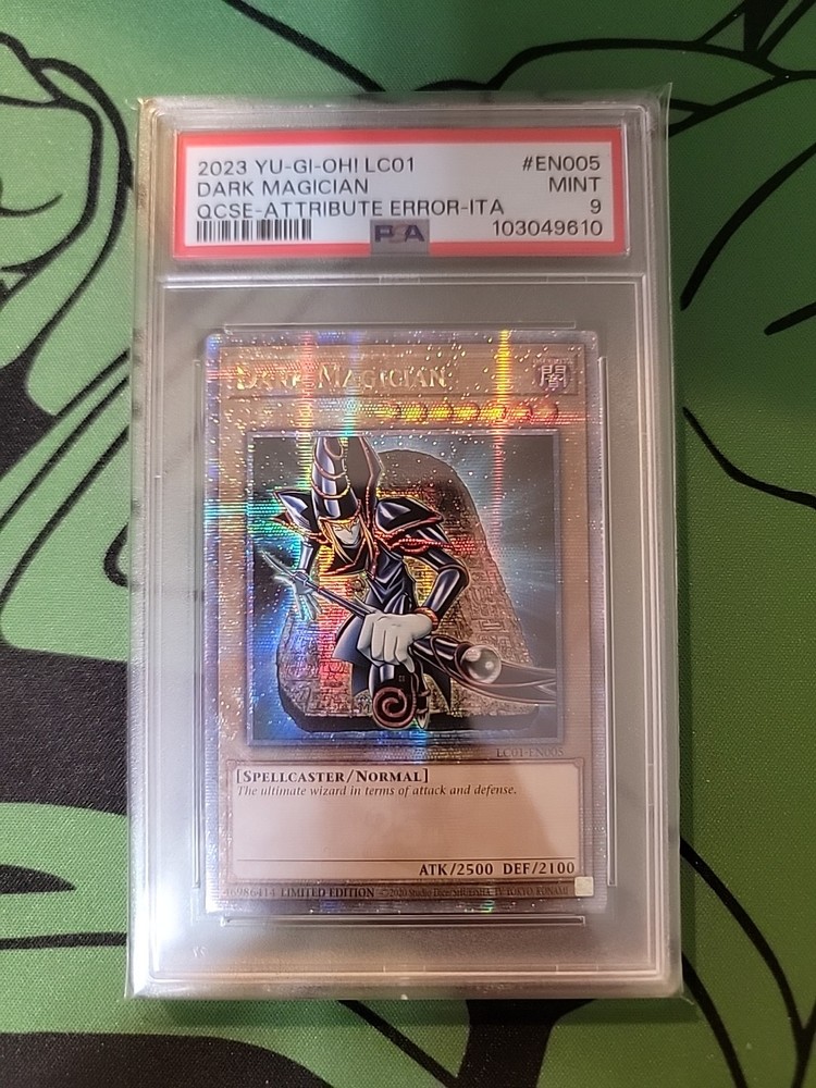 This listing features a rare and highly sought-after Yu-Gi-Oh! TCG card: the Dark Magician from the 25th Anniversary Legendary Collection. This Quarter Century Rare card is in PSA 10 condition and features an attribute error that makes it even more valuable. The card is made of high-quality paper material and has a holographic finish that adds to its aesthetic appeal. It is in English language and is suitable for ages 13 and up. The card is a spell type and has a rarity level that is difficult to come by. Don't miss your chance to add this unique card to your collection!