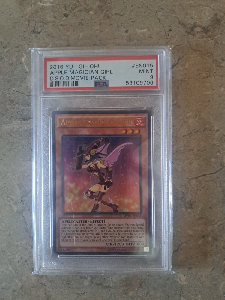 This PSA 9 Apple Magician Girl card is a must-have for any Yu-Gi-Oh! TCG collector. With its ultra rare status and effect card type, it is sure to be a valuable addition to your collection. The card features a Fire attribute and a Spellcaster creature/monster type, making it a formidable opponent in battles. The card's defense/toughness of 800 and attack/power of 1200 make it a force to be reckoned with. The card is in English language and comes from the manufacturer Konami. It is part of the Toys & Hobbies category and the Collectible Card Games subcategory. The card number is MVP1-EN015 and it is an Unlimited edition.