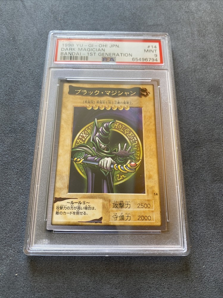 PSA 9 Dark Magician #14 1998 Bandai 1st Generation MINT Yu-Gi-Oh! Yugioh. Really awesome vintage item. These bandai cards are really hard to grade since they are peeled out of sheets from 25 years ago. This PSA 9 copy is fantastic.