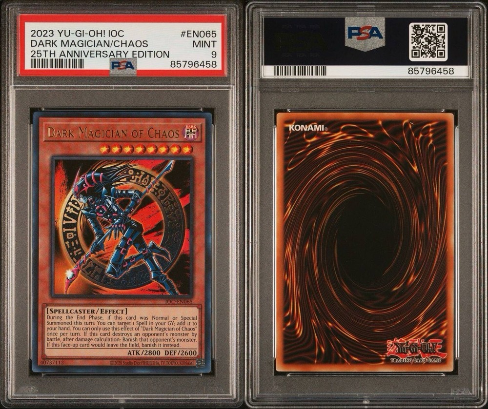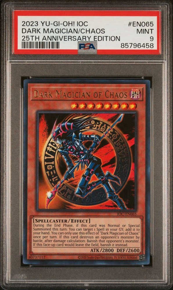 The product is a PSA 9 Dark Magician of Chaos card from the Invasion of Chaos set in the Yu-Gi-Oh! TCG. It is an Ultra Rare card with a holographic finish, featuring the character Dark Magician of Chaos. The card is in Japanese size, made of card stock, and manufactured by Konami in the United States. It is part of the Attribute/MTG:Color Darkness and has the card number IOC-EN065.