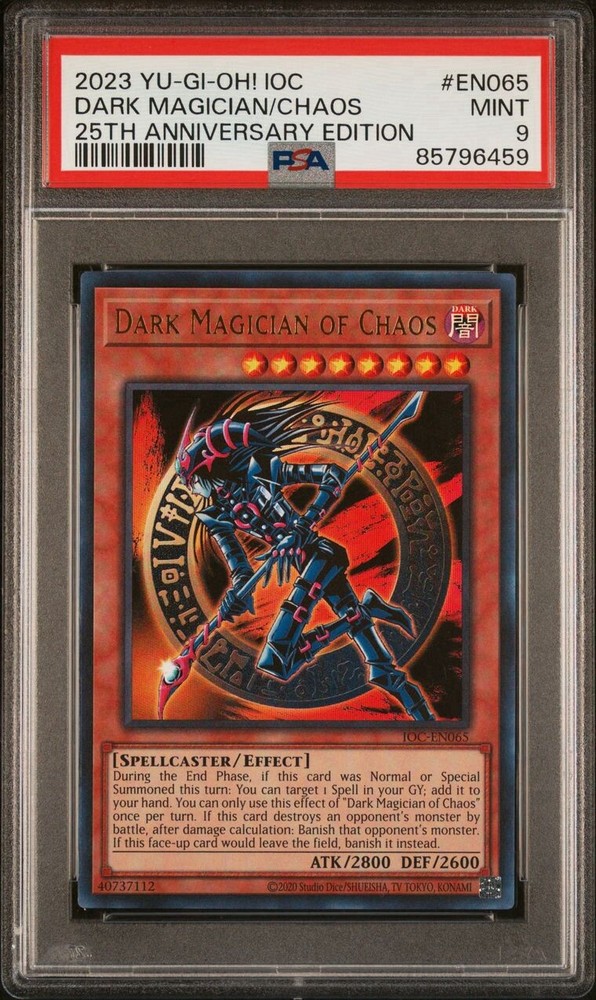 This is a PSA 9 Dark Magician of Chaos card from the Invasion of Chaos set in the Yu-Gi-Oh! TCG. The card is an Ultra Rare Holo card with the card number IOC-EN065. It features the Dark Magician of Chaos character, a Spellcaster monster with the Attribute of Darkness. The card is made of Card Stock, in Japanese size, and manufactured in 2023 by Konami in the United States.