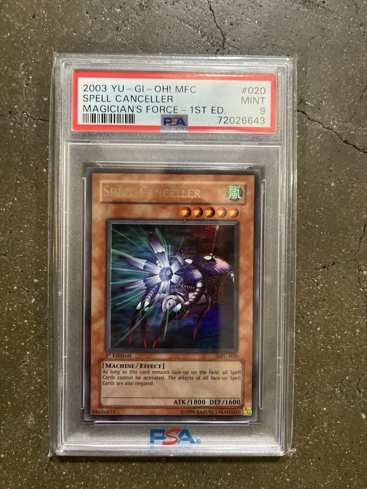 The product is a PSA 9 Mint condition Spell Canceller card from the Magician's Force set of the Yu-Gi-Oh! Trading Card Game. This Ultra Rare card features characters like Dark Magician, Yami Yugi, Seto Kaiba, and Blue-Eyes White Dragon, making it a valuable collector's item. Manufactured by Konami in 2003, this card is in Japanese size with a Holo finish, 1st Edition, and is part of a Chase series, adding to its exclusivity and desirability among collectors.