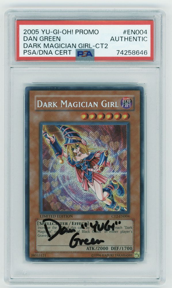 This Dark Magician Girl card is a must-have for any Yu-Gi-Oh! TCG collector or fan. The card is autographed by voice actor Dan Green and has been professionally authenticated by PSA, ensuring its authenticity and quality. This card is perfect for display, a true gem in any collection. Don't miss your chance to own this incredible card!