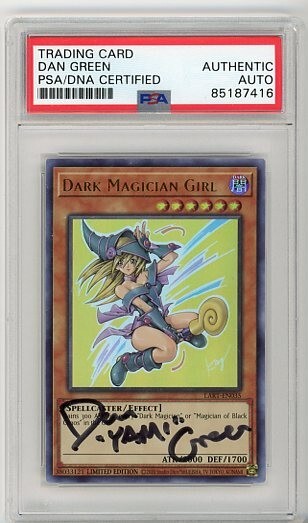 Elevate your Yu-Gi-Oh! TCG collection with the enchanting Dark Magician Girl from The Lost Art Promotion set. This Ultra Rare card, numbered LART-EN019, features the spellcasting prowess of the beloved character in a stunning Holo finish that captures the eye with every turn. Authenticated by the Professional Sports Authenticator (PSA), this card not only boasts a signature from Dan Green but also stands as a limited edition treasure for enthusiasts and collectors alike. With an attack power of 2000 and a defense toughness of 1700, Dark Magician Girl is more than just a collectible; it's a formidable force in the game. The card's attributes reflect its magical nature, with the dark hue synonymous with its spellcaster type. Konami's craftsmanship ensures the quality and prestige of this English language card, making it a must-have for any serious player or collector.