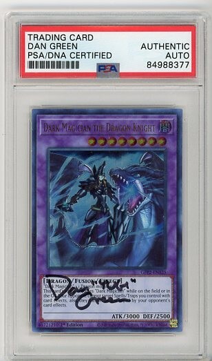 Elevate your Yu-Gi-Oh! TCG collection with the ethereal Dark Magician the Dragon Knight card from the Ghosts from the Past: the 2nd Haunting set. This ultra-rare card, featuring the mystical Dragon creature type, boasts an attack power of 3000 and a defense toughness of 2500, making it a formidable addition to any deck. The card's holographic finish captures the eye, highlighting its stunning artwork and 1st Edition status. Signed by the talented Dan Green and authenticated by the Professional Sports Authenticator (PSA), this card, numbered GFP2-EN125, is a must-have for collectors and enthusiasts alike. The signature is hard-signed directly on the card, ensuring its authenticity and adding a personal touch from the artist. This effect fusion card is a testament to Konami's quality and a true gem for those who appreciate the darker nuances of the Yu-Gi-Oh! universe.
