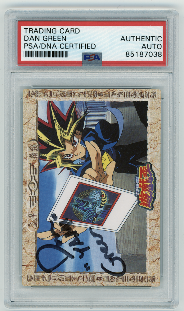 This collectible card features the iconic Dark Magician character from the popular collectible card game. This particular card has been signed by the voice actor of Yami Yugi, Dan Green, and has been professionally authenticated by PSA. It is a vintage Bandai card and is a great addition to any collection. The card's authenticity and value are enhanced by the fact that it is autographed by the voice actor of the character it represents. Whether you're a fan of the anime series or a collector of rare trading cards, this card is a must-have. Don't miss out on the opportunity to own a piece of Yu-Gi-Oh! history.
