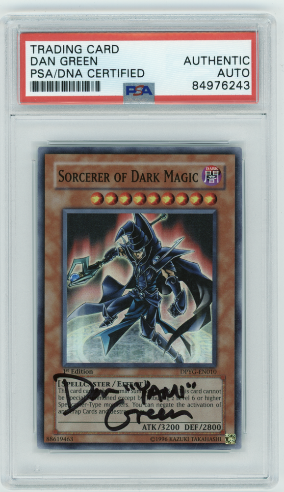 This PSA signed Yu-Gi-Oh! card features the Sorcerer of Dark Magic and is a must-have for any collector. With a Super Rare rarity and Holo finish, this card is a valuable addition to your collection. The card number is DPYG-EN010 and it is a 1st Edition. The card is autographed by Dan Green and is perfect for fans of the Yu-Gi-Oh! TCG game. The attribute of the card is Dark and it belongs to the Duelist Pack set. This collectible card is suitable for players and collectors alike.