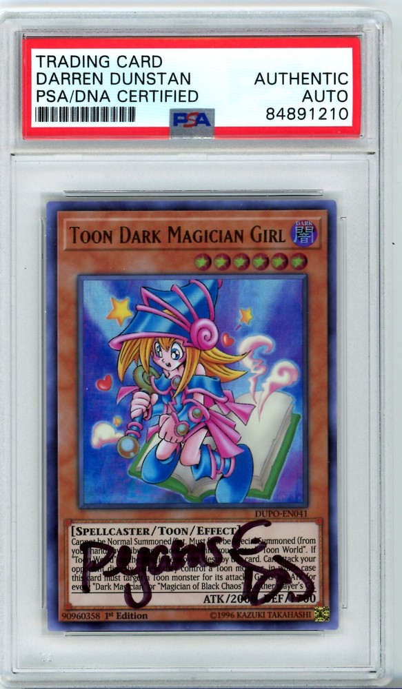 Elevate your Yu-Gi-Oh! TCG collection with the enchanting Toon Dark Magician Girl card, a must-have for spellcasting enthusiasts and collectors alike. Darren Dunstan's autograph adds a personal touch to this already captivating card, enhancing its collectible value. As a 1st Edition Ultra Rare from the Duel Power set, this card shines with a Holo finish and boasts an impressive 2000 Attack/Power alongside a robust 1700 Defense/Toughness, ready to dominate the dueling arena. Authenticated by the Professional Sports Authenticator (PSA), you can trust in the authenticity and quality of this hard-signed gem. The card, numbered DUPO-EN041, features the spellcaster in pristine English language, making it a standout addition to any deck or display. Don't miss the chance to own a piece of Yu-Gi-Oh! history, complete with the prestige of Konami's craftsmanship and the exclusivity of a vintage collectible.