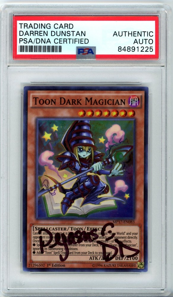This Yu-Gi-Oh! TCG card is a must-have for any collector. The Toon Dark Magician card is signed by Darren Dunstan and features a holographic finish. It is a Super Rare card with a Card Number of MP17-EN083 and a Rarity of 1st Edition. The card is from the 2017 Mega-Tin Mega Pack set and manufactured by Konami. The card belongs to the Darkness Attribute/MTG:Color and Toon Card Type. It is a collectible card game individual card that is perfect for any Yu-Gi-Oh! fan. The card features the autograph of Darren Dunstan, making it a unique and valuable addition to any collection.