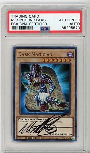 Elevate your Yu-Gi-Oh! TCG collection with the iconic Dark Magician card from the Legendary Collection 1. This Ultra Rare card, number LC01-EN005, features the enigmatic spellcaster in stunning holo finish, capturing the essence of the beloved character in rich detail. The card boasts an attack power of 2500 and a defense toughness of 2100, ready to make a formidable impact in your deck. Authentically hand-signed by Michael Sinterniklass, the renowned Yu-Gi-Oh! personality, this card is a must-have for collectors and enthusiasts. The signature is verified by the Professional Sports Authenticator (PSA), ensuring its credibility and uniqueness. With its limited edition status and pristine hard-signed autograph, this Dark Magician card is an exceptional piece of trading card history.