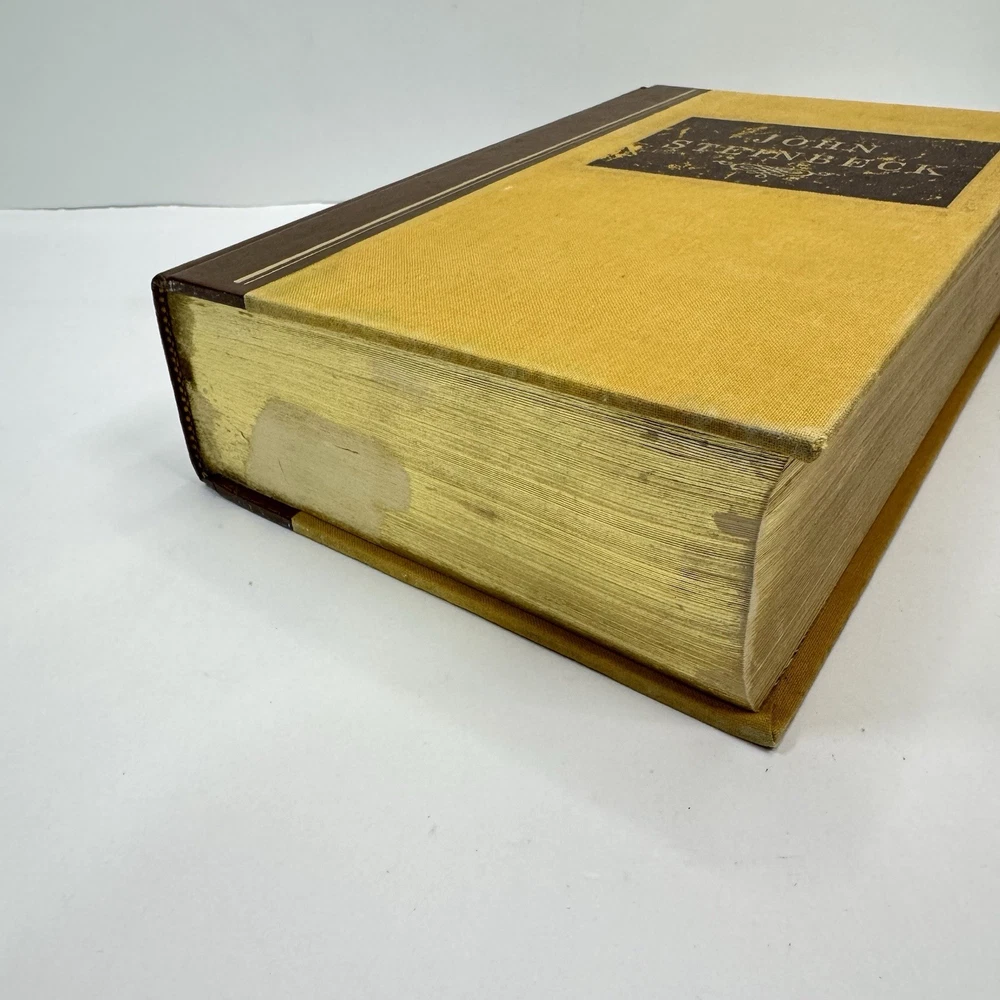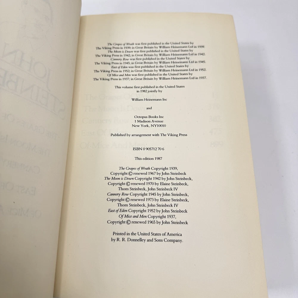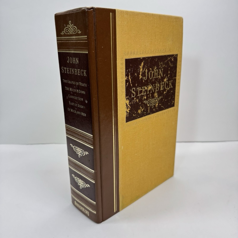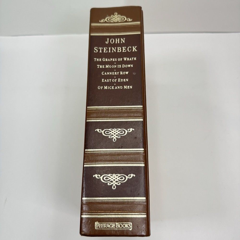 Please see photos for wear. Previous owner put on a book plate. I believe it can be removed with heat. This compilation of John Steinbeck's five classic stories is a must-have for any literary enthusiast. The hardcover book, published by Peerage Books in 1987, features a beautiful leather and cloth-bound cover with a foiled edge that adds to its elegance. The book belongs to the American Classic Collection and is perfect for adults who enjoy reading fiction. The book contains stories that are timeless and relevant, making it a great addition to any bookshelf. The narratives are written in English and are perfect for those who enjoy literary collections. The book is classified under the genre of literary collections and topics of American and general literature. Stories included: The Grapes of Wrath The Moon is Down Cannery Row East of Eden Of Mice and Men