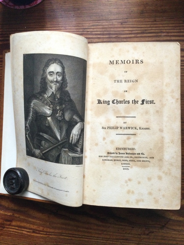 1813 Edinburgh edition of Philip Warwick's collection of "memoires" of King Charles I with illustrations. Includes the 1813 reproduction of the title page from a very early edition in 1702. Illustrated with two engravings, as the frontispieces for each title page, of portraits of King Charles I and the author. Uncommon in this edition. Philip Warwick was a seventeenth century English writer and politician. He was a loyal supporter of Charles II and was knighted and made a member of parliament. He is chiefly known for this work, written between 1675 and 1677. A very nice readable copy, clean and sound.