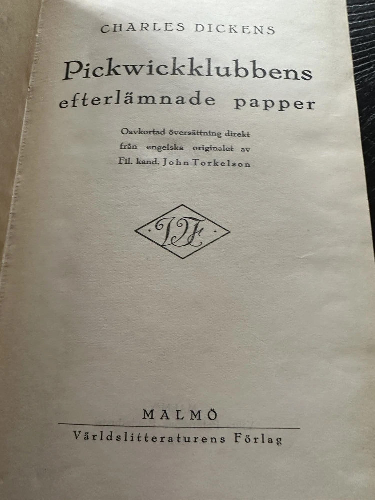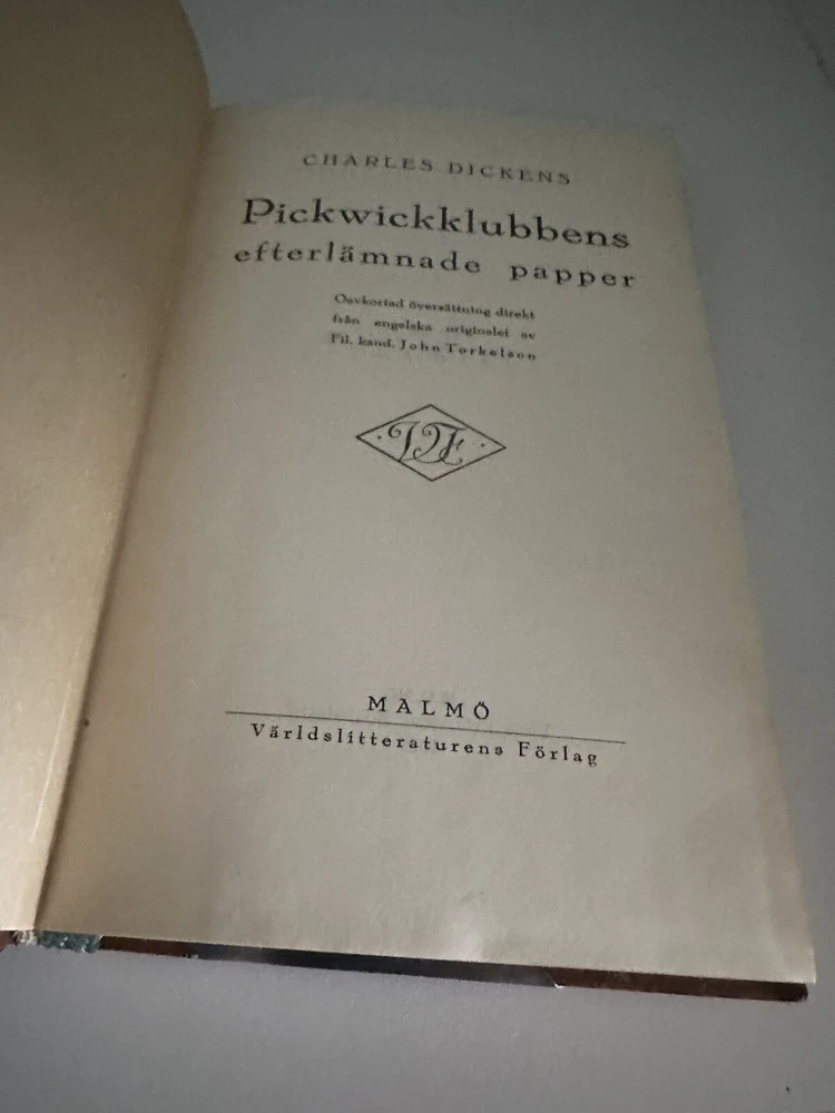 Pickwickklubbens Efterlamnade Papper 1929 Binding is in great shape. It doesn't appear to have been read as the binding is tight. Some wear as shown in pictures. Some discolorization of pages. See pictures Varldslitteraturens Forlag; 1929. Language: Swedish? Hardcover. Three quarter leather bound. Marbled colored boards. Corners bumped. Gilt lettering to spine which is slightly sunned.