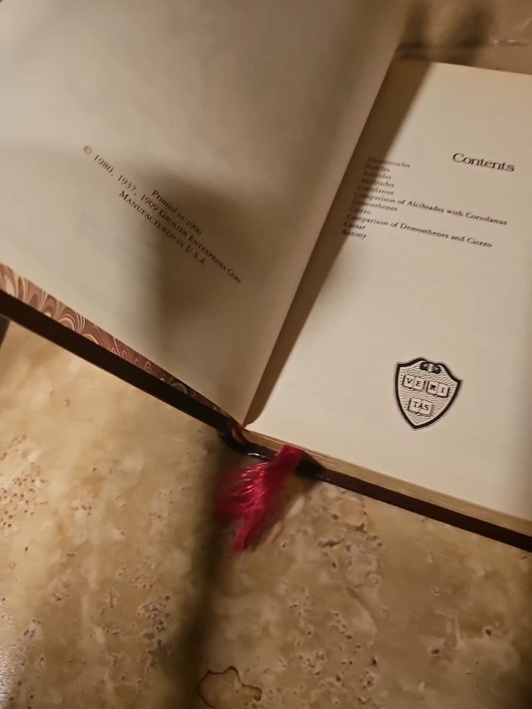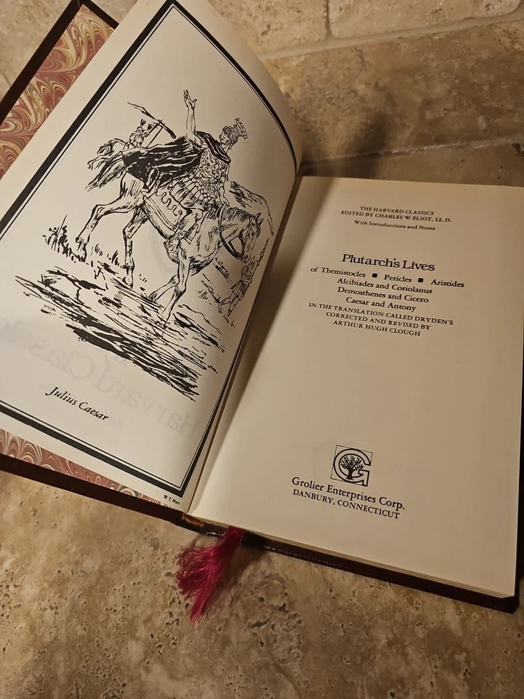 This antique novel by Plutarch is a collector's edition bound in leather with gold trim. The Harvard Classics published it in 1990 and it is an original printing in English. The book is a perfect addition to any collection of classics and has special attributes that make it unique. Please see photos, thanks!