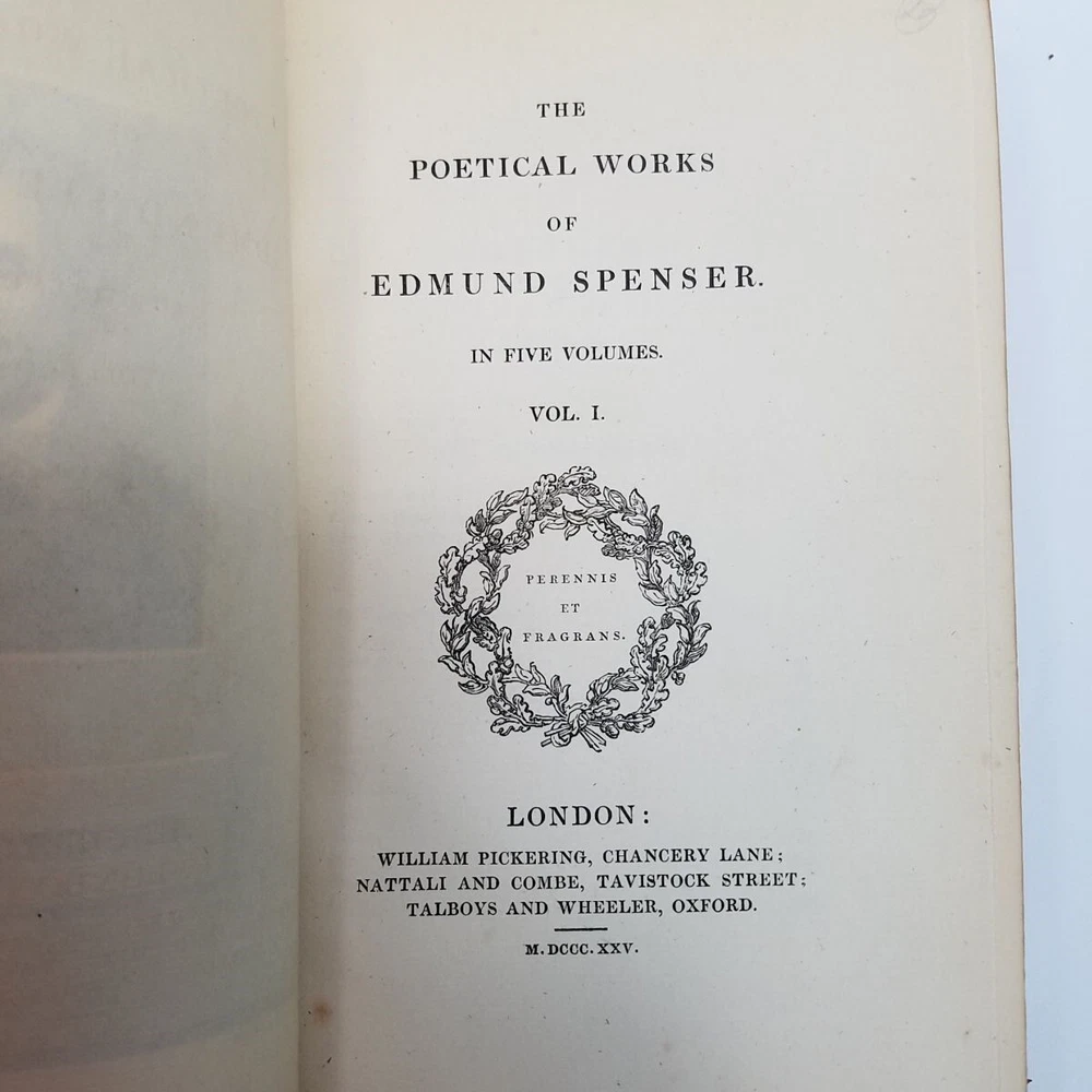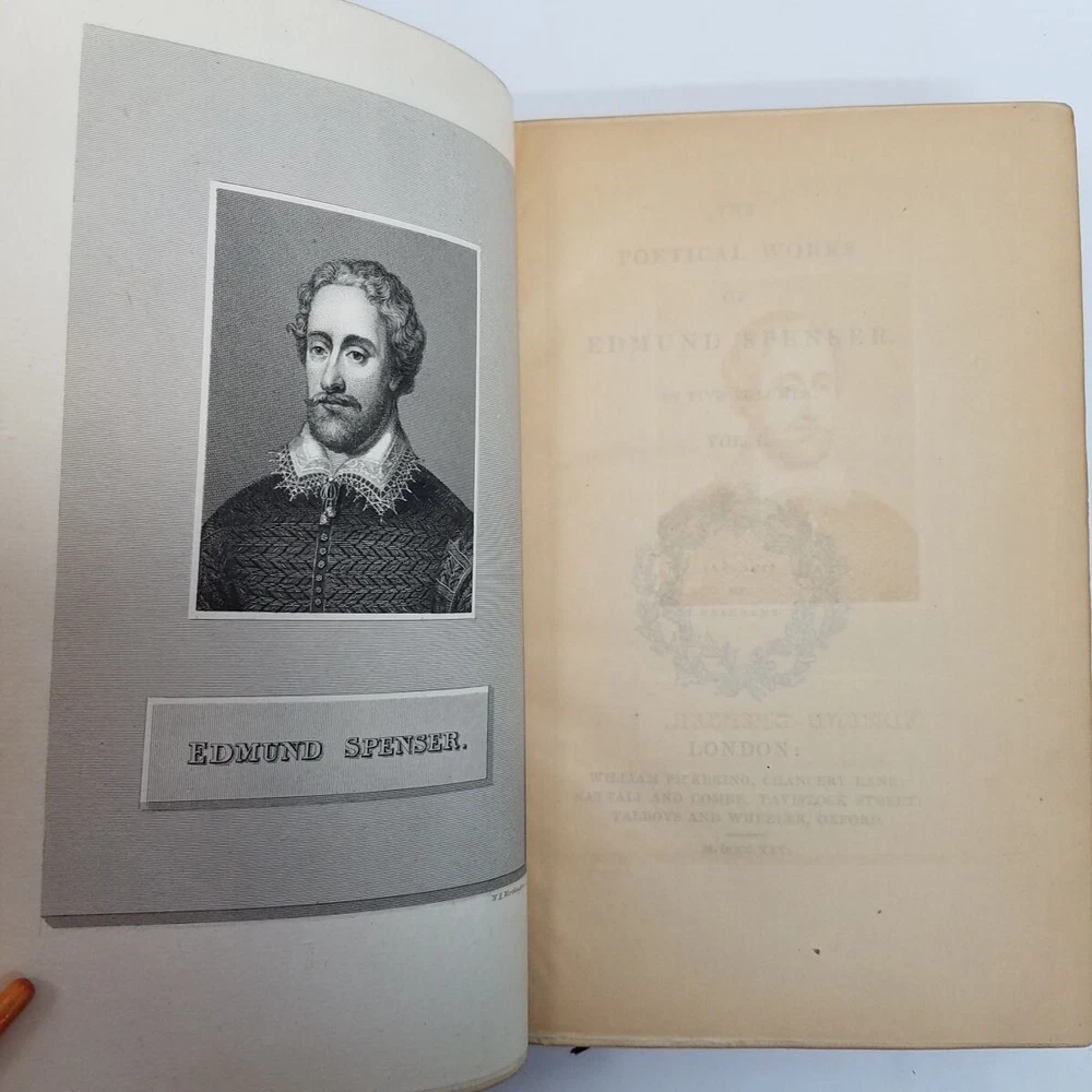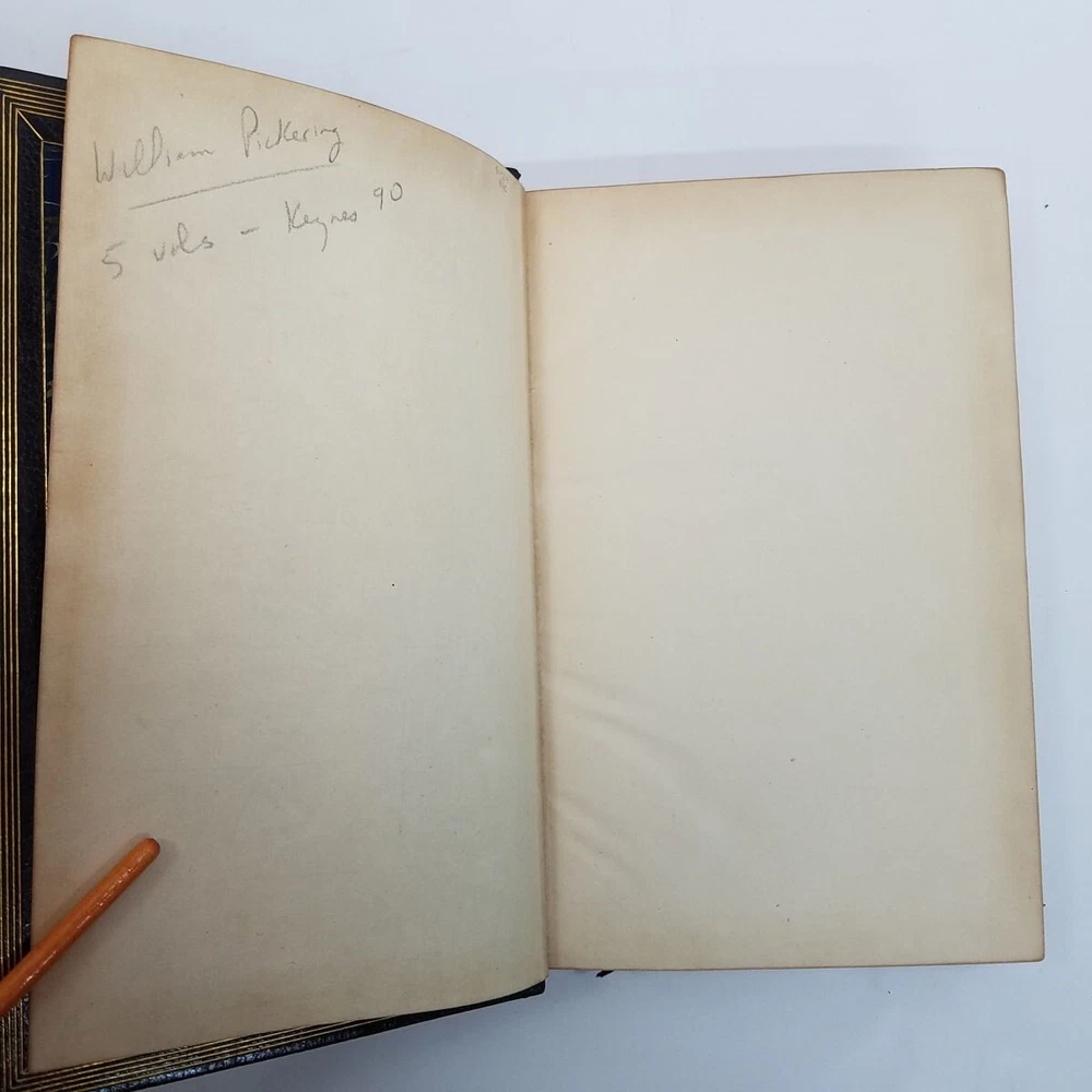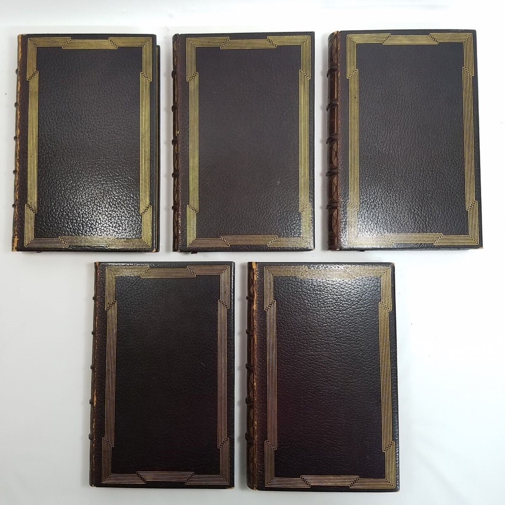 Poetical Works Edmund Spenser 5 Vol Set Leather 1825 Pickering Edition Bentley Text has light tanning, small amount of scattered foxing, a few minor handling marks in Volume I, and darkening to some page edges. In volume i, there are penciled dealer inventory notes on reverse of front free endpaper, and similar at rear. No markup within the text. Text blocks square. Hinges and joints all strong. Endpapers in all volumes bright and beautiful, with some darkening where they rest against the turn-ins. Boards show rubbing at spine edges and ends, light wear to extremities. See particularly the example photos of Volume I, which has the most visible rubs along edge of spine. Odor free. A very solid set. Leather bound with gilt decoration and titling. 6 compartment spines. Gilt ruled turn-ins. Top edges gilt. Marbleized endpapers. Volume I includes the bookplate of George Allison Armour, who was the son of Chicago Board of Trade president George Armour. Truly a lovely set that is a pleasure to hold and read. Spenser, Edmund. The Poetical Works of Edmund Spenser, in Five Volumes . London, 1825. William Pickering. Printed by S. & R. Bentley. Bound by Bradstreet's. All images are photos or scans of the exact item you will receive. No stock or re-used photos. Please review images and condition notes, and feel free to ask any questions you may have. We are pleased to offer international shipping. However, international buyers please note that import duties, taxes, and charges aren't included in the item price or postage cost. These charges are the buyer's responsibility. Please check with your country's customs office to determine what these additional costs will be, prior to bidding or buying. We are also happy to combine shipping on multiple purchases. To combine shipping, place the items in your cart, but do not pay. Open your cart and you should see a link that says "Request Invoice" or "Request Total", usually located somewhere toward to the top right of the cart. Click on the link. When we receive the request we will get your items weighed and packaged, and send you an invoice with combined shipping. This will happen either the same or next business day depending on time of request. You will receive a message from Ebay with the invoice and can make your payment from there. If it's not convenient for you to wait for an invoice or you have trouble finding the link, feel free to go ahead and buy the items. We will refund the difference after shipping. Thanks for your interest!