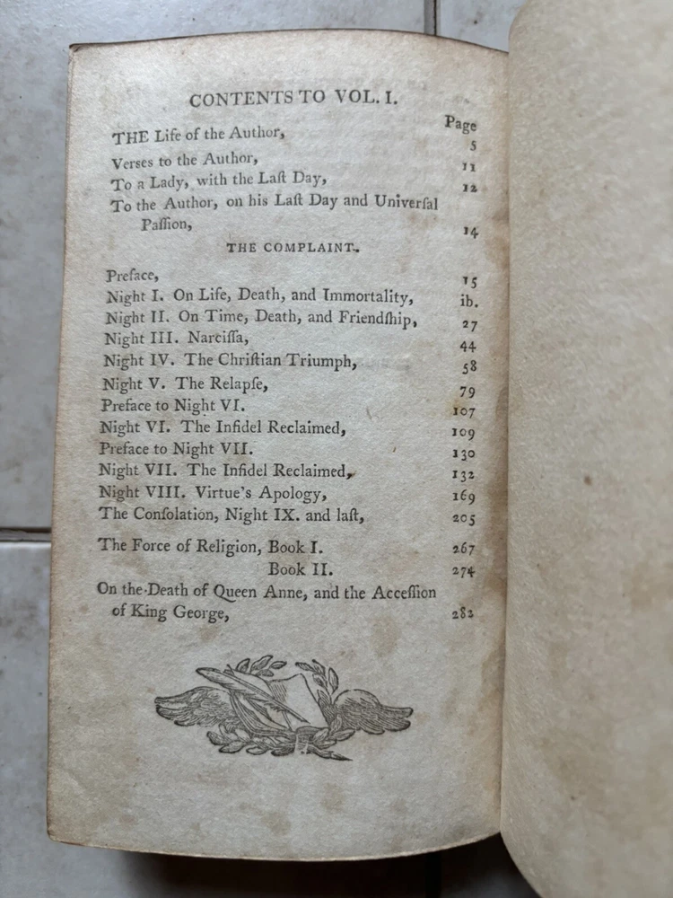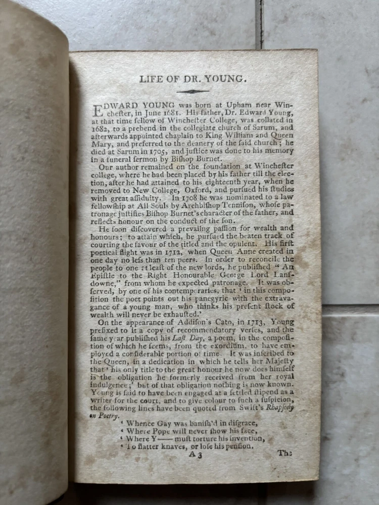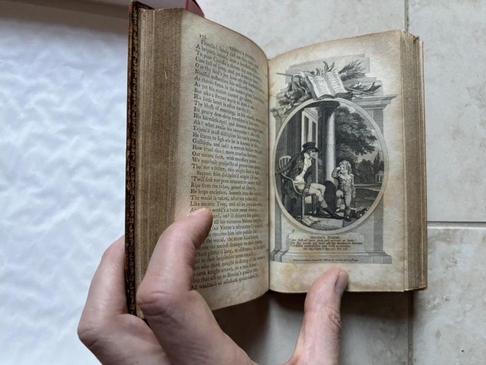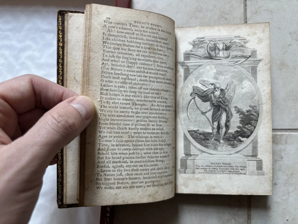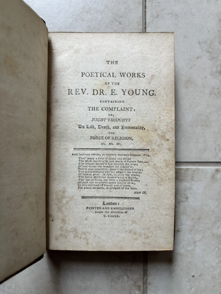 This listing is for the rare leather-bound book entitled The Poetical Works of Rev Dr E Young containing the Complaint: or, Night Thoughts on Life, Death, and Immortality . London: C. Cook. 1796. Part of the Cooke's Pocket Edition series from the 1790s. Leather-bound book shows some edge wear along the hinges of the spine, typical of a book this age. As seen in the photos. Book binding is still tight. A wonderful, beautiful rare book capturing a classic literature from England of the 1700s. S&H: $5.40 media rate.