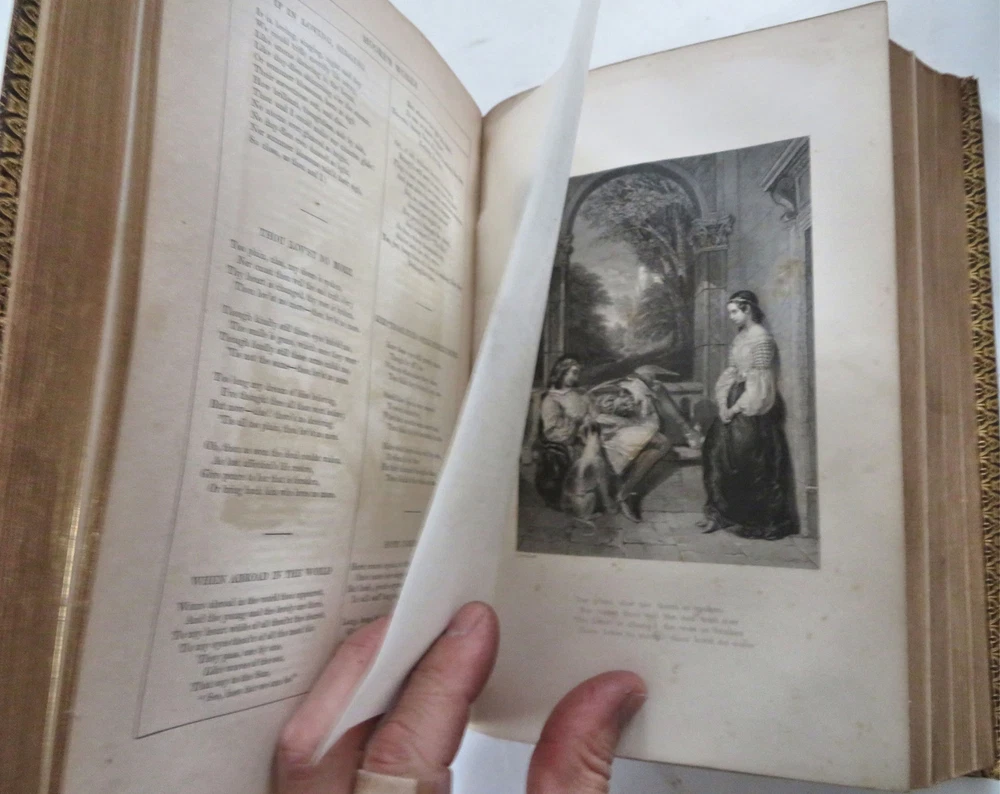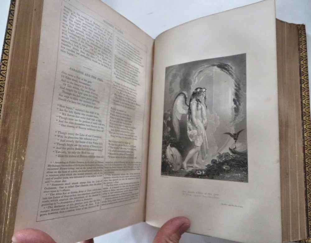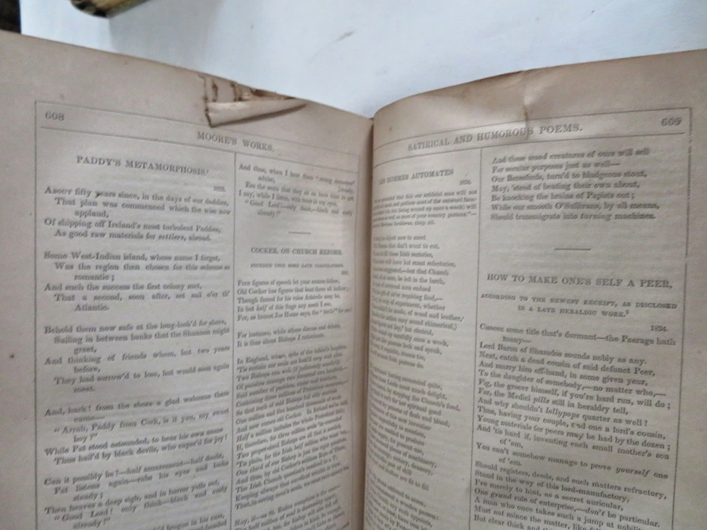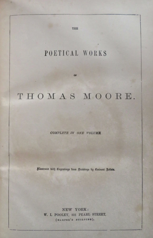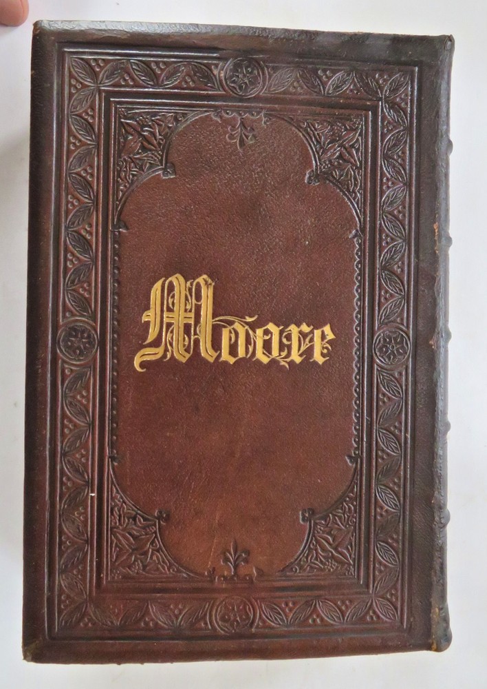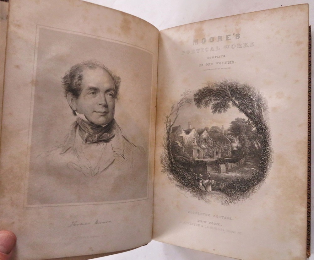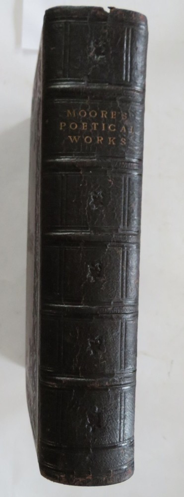 Poetical Works of Thomas Moore c 1850 illustrated poetry collection leather book Poetical Works of Thomas Moore c 1850 illustrated poetry collection leather book (Old Books, 19th Century Books, Leather Books, Poetry, Illustrated Books). The Poetical Works of Thomas Moore. Published c. 1850, New York by W.I. Pooley. 747 pages. Text in English. Engraved frontis & half title. Illustrated throughout 6 engraved plates. Period full leather binding, raised bands, embossed compartment decorations, gilt title lettering on spine & cover, embossed cover decorations, all edges & turn ins gilt, marbled end papers. Book is physically old and shows some signs of handling and time. Book is not new or in "new" condition. With an 1872 gift inscription. Binding a bit age worn, leather rubbed but still supple, tiny chip to spine head, joints and edges scuffed with various small spots of loss, small chip at spine head, remains overall attractive as an object. Text block paper is uniformly age toned, light scattered age spotting, a few pages in middle of the text block with a small amount of edge damage (shown in pics), internally still well preserved, tight, sound. Still attractive on the shelf. Book displays a pleasing and unique age patina and is in nice antiquarian condition, any age flaws easy to overlook or forgive. Please review photos for more detail and our best attempt to convey how this attractive and large thick mid-19th century gift book survives. Book Measures c. 9 3/4" H x 6" W. [B11721].