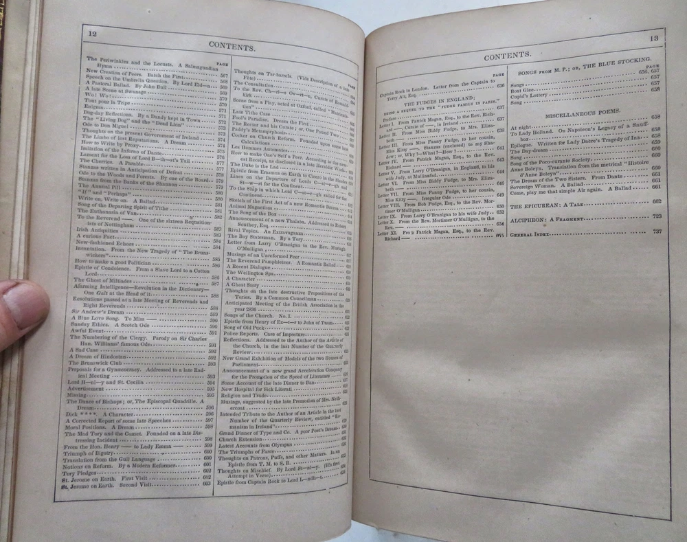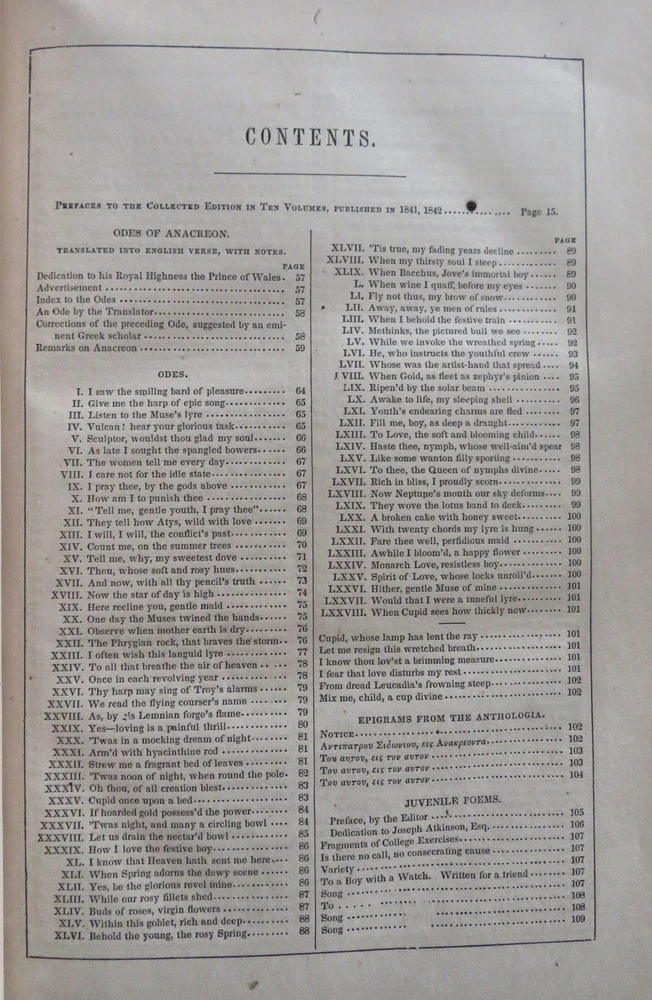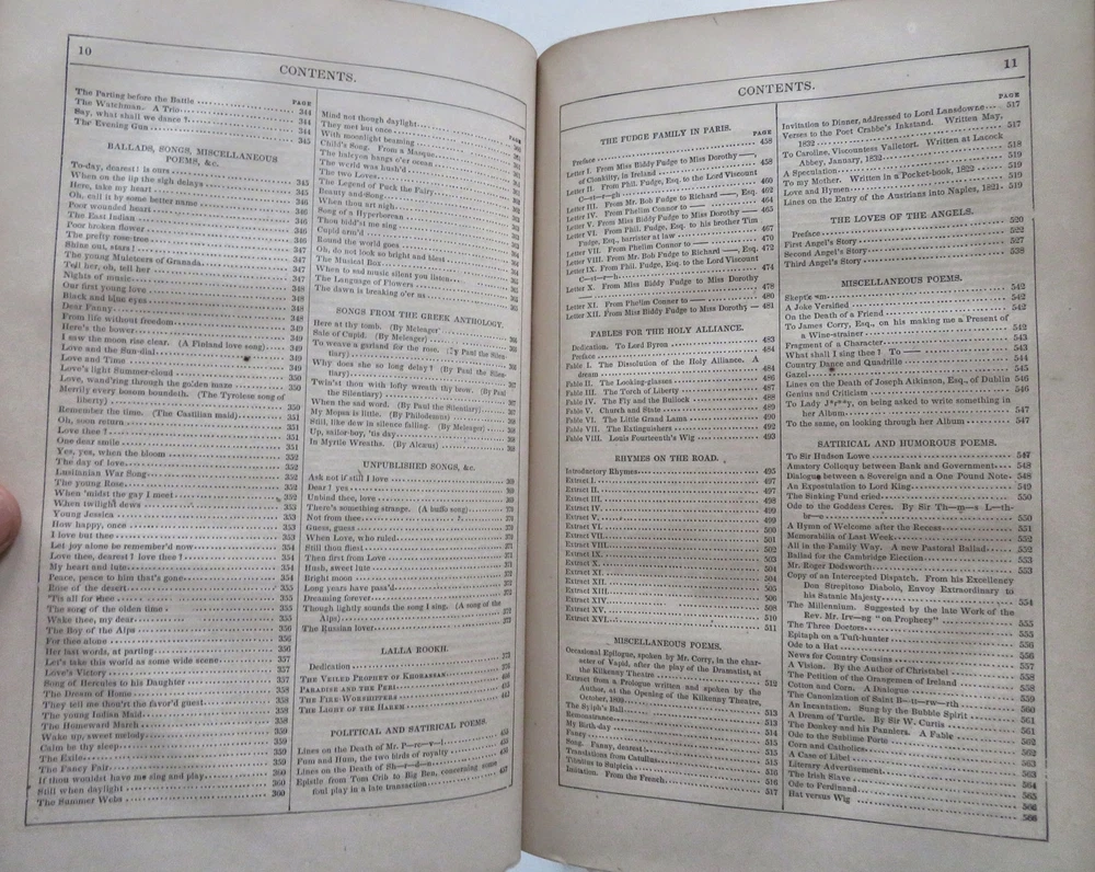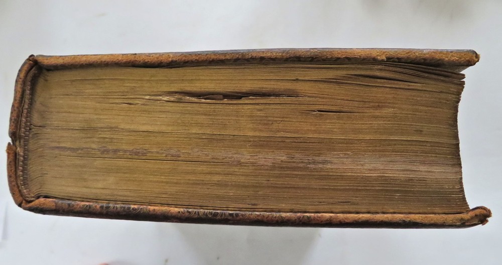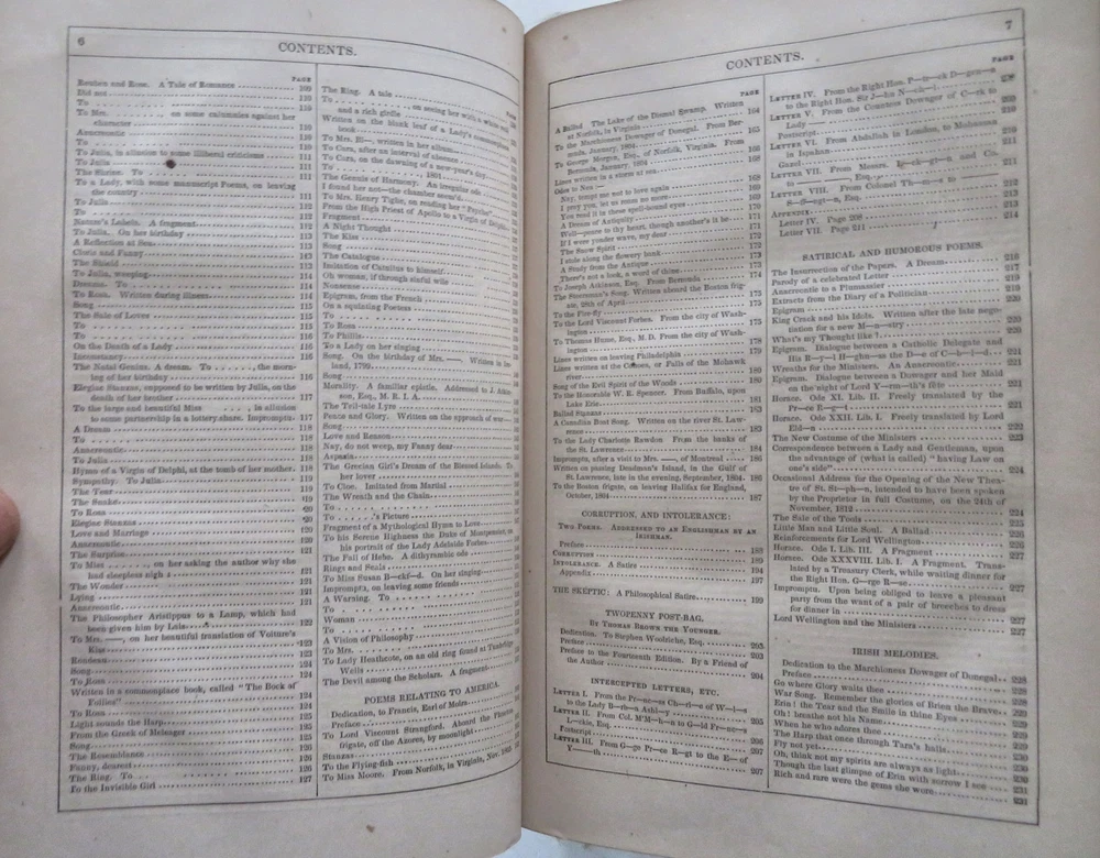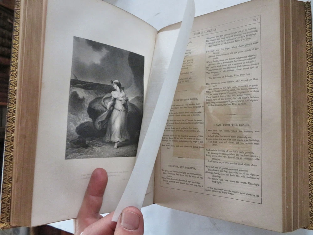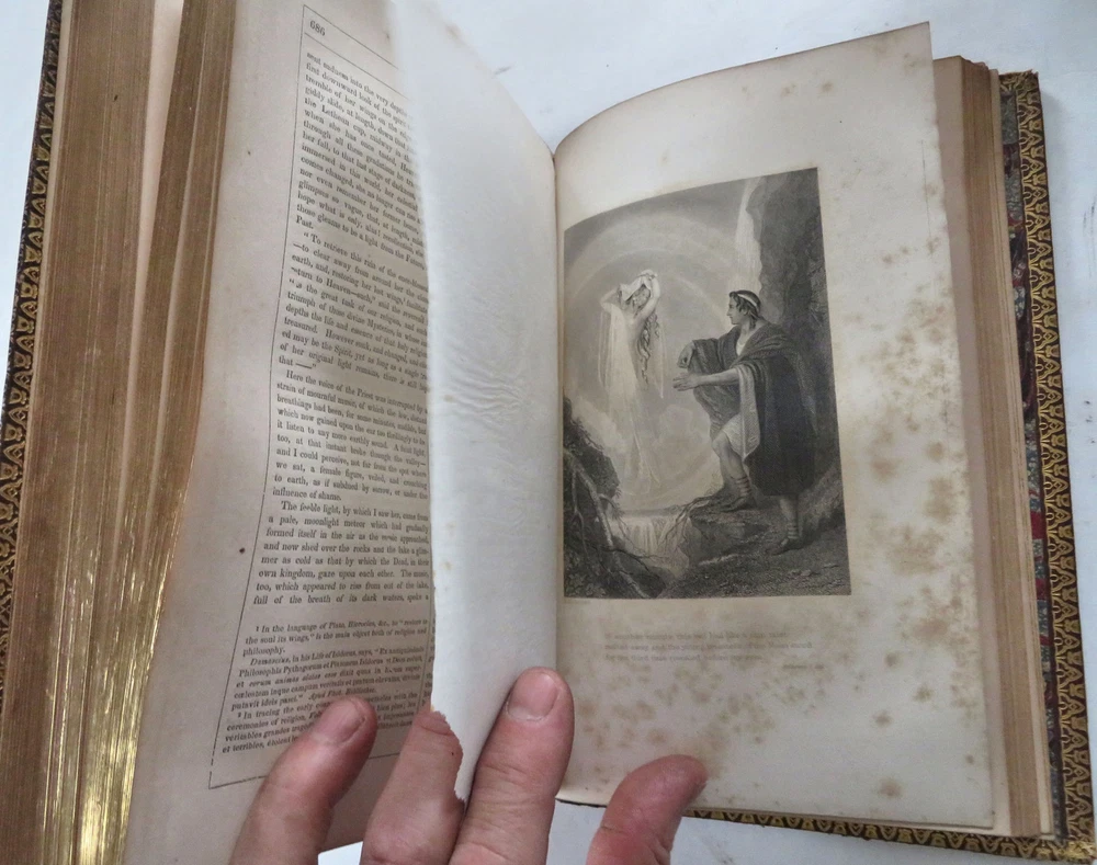 Poetical Works of Thomas Moore c 1850 illustrated poetry collection leather book Poetical Works of Thomas Moore c 1850 illustrated poetry collection leather book (Old Books, 19th Century Books, Leather Books, Poetry, Illustrated Books). The Poetical Works of Thomas Moore. Published c. 1850, New York by W.I. Pooley. 747 pages. Text in English. Engraved frontis & half title. Illustrated throughout 6 engraved plates. Period full leather binding, raised bands, embossed compartment decorations, gilt title lettering on spine & cover, embossed cover decorations, all edges & turn ins gilt, marbled end papers. Book is physically old and shows some signs of handling and time. Book is not new or in "new" condition. With an 1872 gift inscription. Binding a bit age worn, leather rubbed but still supple, tiny chip to spine head, joints and edges scuffed with various small spots of loss, small chip at spine head, remains overall attractive as an object. Text block paper is uniformly age toned, light scattered age spotting, a few pages in middle of the text block with a small amount of edge damage (shown in pics), internally still well preserved, tight, sound. Still attractive on the shelf. Book displays a pleasing and unique age patina and is in nice antiquarian condition, any age flaws easy to overlook or forgive. Please review photos for more detail and our best attempt to convey how this attractive and large thick mid-19th century gift book survives. Book Measures c. 9 3/4" H x 6" W. [B11721].